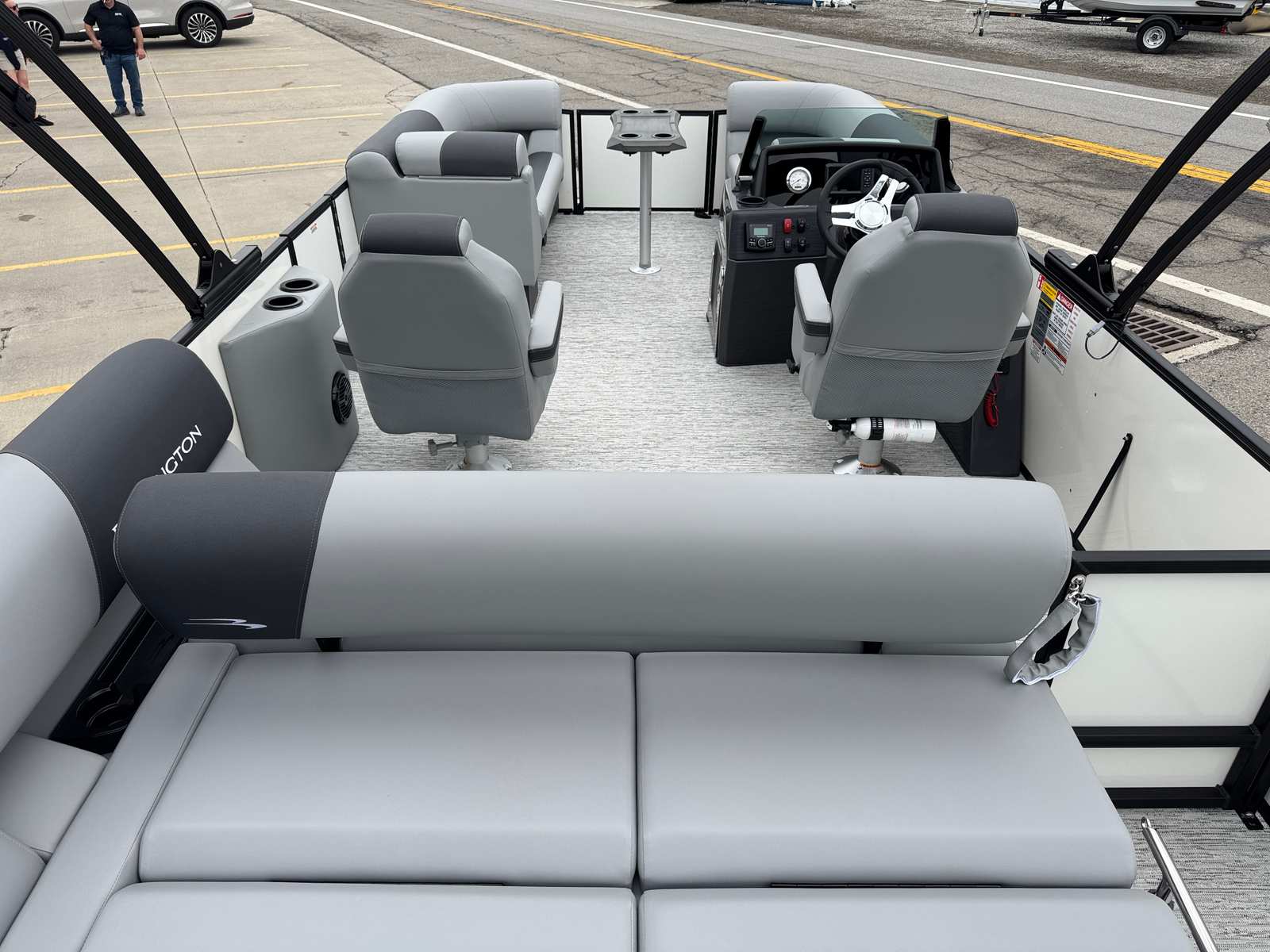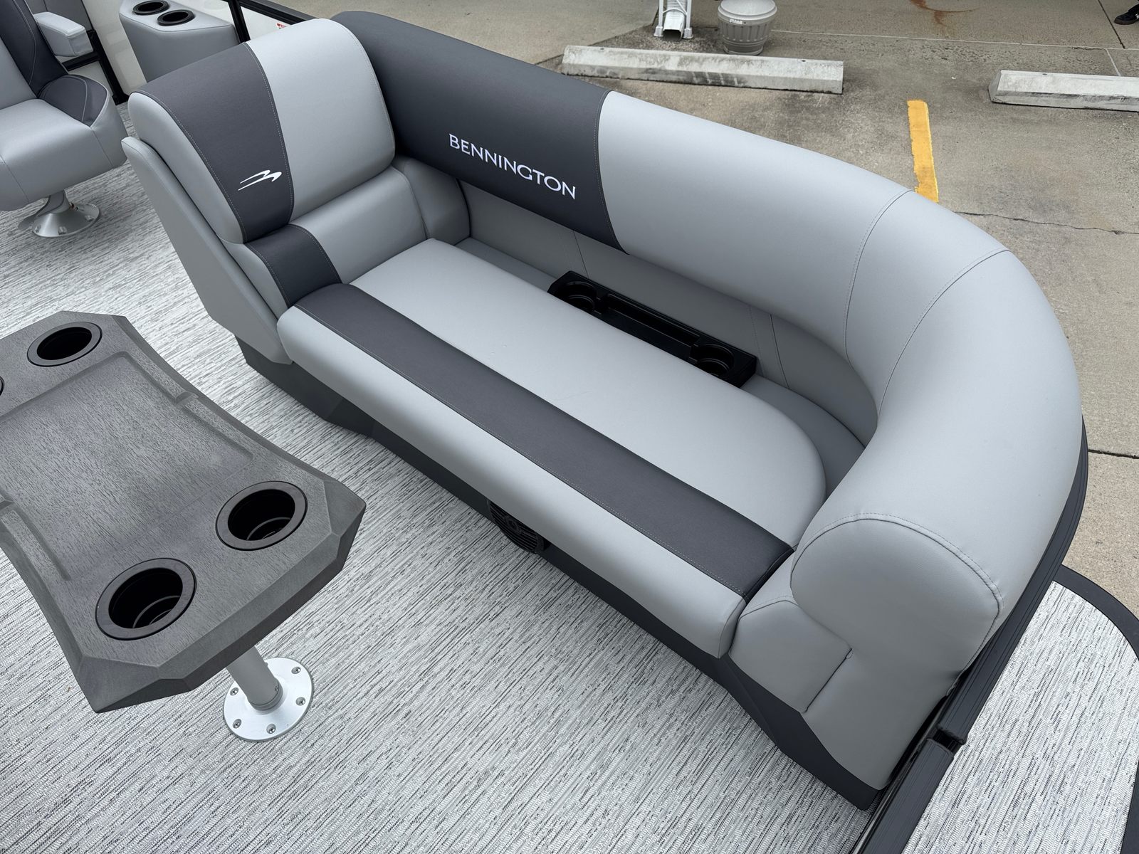 The Bennington 21 SSB SPS is packed with special features designed to maximize convenience, safety, and enjoyment. The Water Fuel Separator Large and Water Fuel Separator Box work together to keep your engine running clean and efficiently, reducing maintenance and ensuring longevity. The single switch battery system offers straightforward power management, making it easy to operate and maintain your boat’s electrical systems. The blackout logos and smooth metallic white panels not only enhance the boat’s aesthetics but also reflect Bennington’s commitment to quality and style. The canvas in midnight black and shadow grey provides durable protection from the elements, while the ironwood dash accent adds a touch of elegance to the helm.