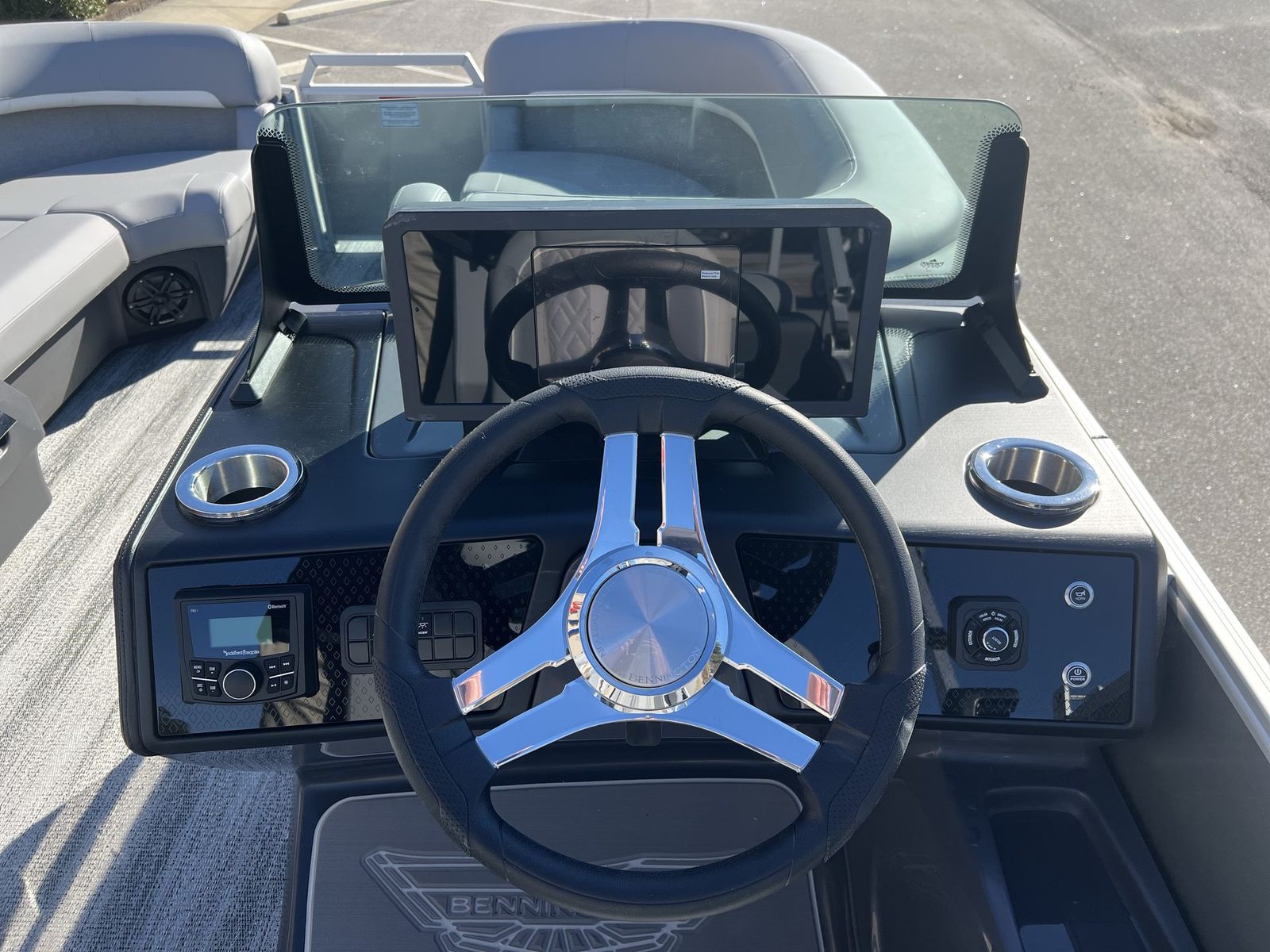 The Bennington 22 MFB SPS is packed with innovative features that set it apart from other pontoon boats for sale. The 12 Button Digital Switching system puts control at your fingertips, allowing you to manage onboard systems with ease. The 7" Vivid UX Touchscreen Display provides intuitive access to navigation, entertainment, and boat information, ensuring you stay connected and informed throughout your journey. The Master Power switch offers added convenience and safety, while the horn ensures you’re always prepared for any situation.For modern connectivity, the USBP Panel with Wireless Charging Dock keeps your devices powered up and ready to go, so you can capture every moment and stay in touch with loved ones. The interior and exterior design features a sophisticated combination of Panel – Smooth Silver, Accent – Smooth Metallic White, Canvas – Metallic Silver, and Shadow Gray Veneto, all complemented by striking Chrome Logos. These premium finishes create a contemporary, upscale atmosphere that’s sure to impress.