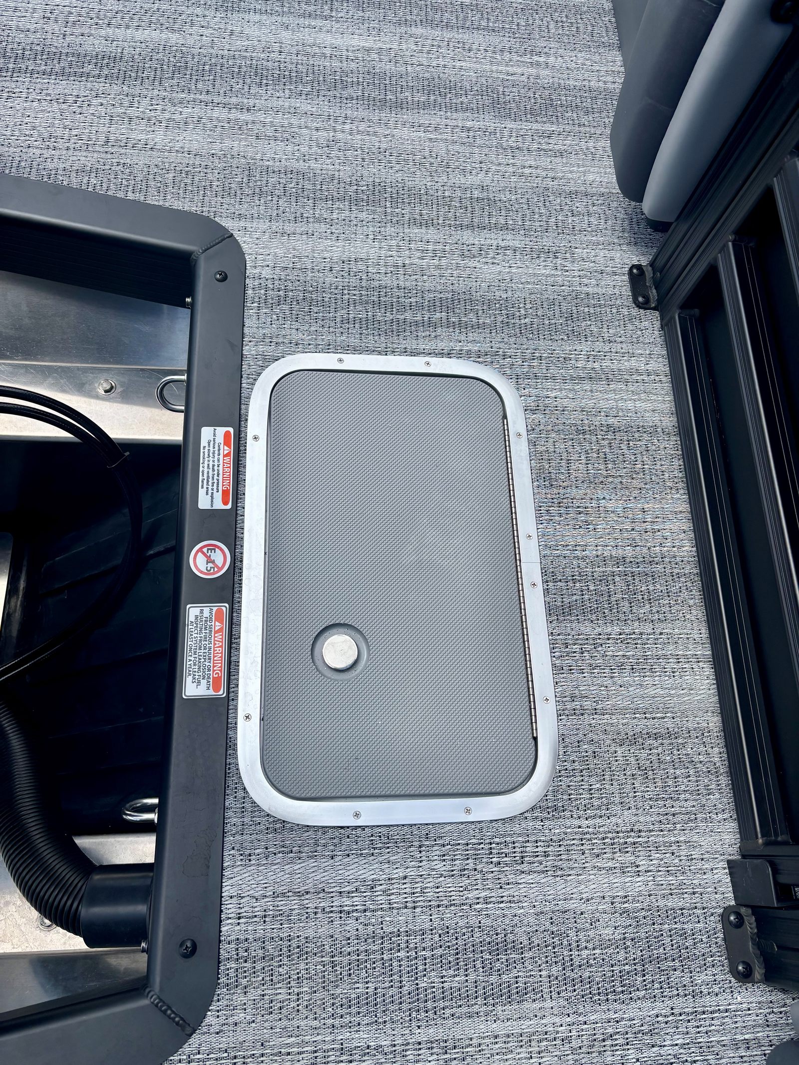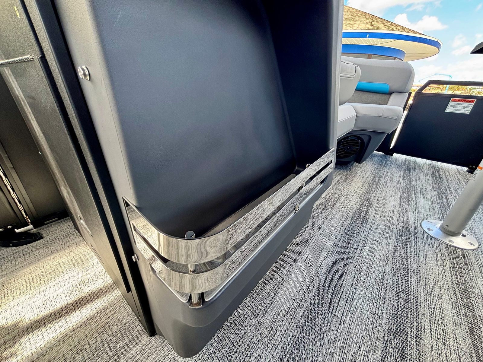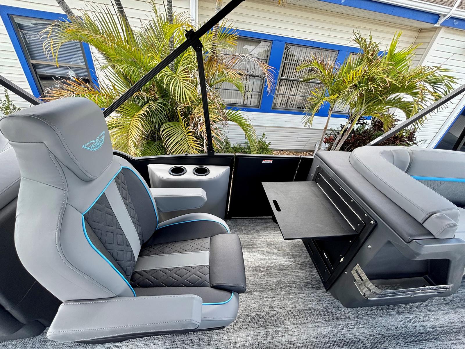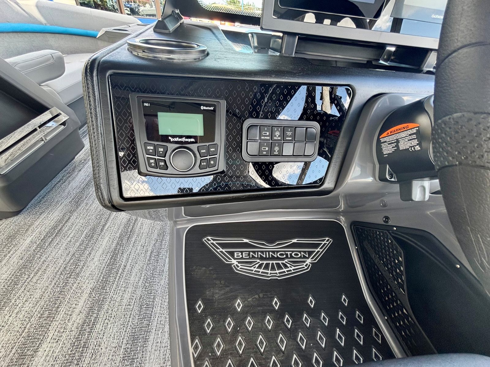 The Bennington 22 MFB SPS is loaded with special features that elevate your boating experience. The Sunshine Package brings an inviting atmosphere to the deck, perfect for basking in the sun or enjoying a cool breeze. The Elevated Console with Pocket Mythos provides enhanced visibility and a modern command center, allowing you to navigate with confidence and style. The Base Furniture M Series ensures plush seating and ergonomic comfort, making long days on the water feel effortless.Aesthetically, the Zebrawood Matte Slate accents and Canvas in Midnight Black create a sophisticated and contemporary look, while the Shoreline Grey exterior adds a touch of elegance. The Wavetamer to Bow 3 Tube Upgrade enhances stability and ride quality, ensuring a smooth journey even in choppier conditions. For those who love shade and protection from the elements, the Double 15.5' Bimini with Ball Socket in black offers generous coverage, allowing you to relax in comfort no matter the weather.