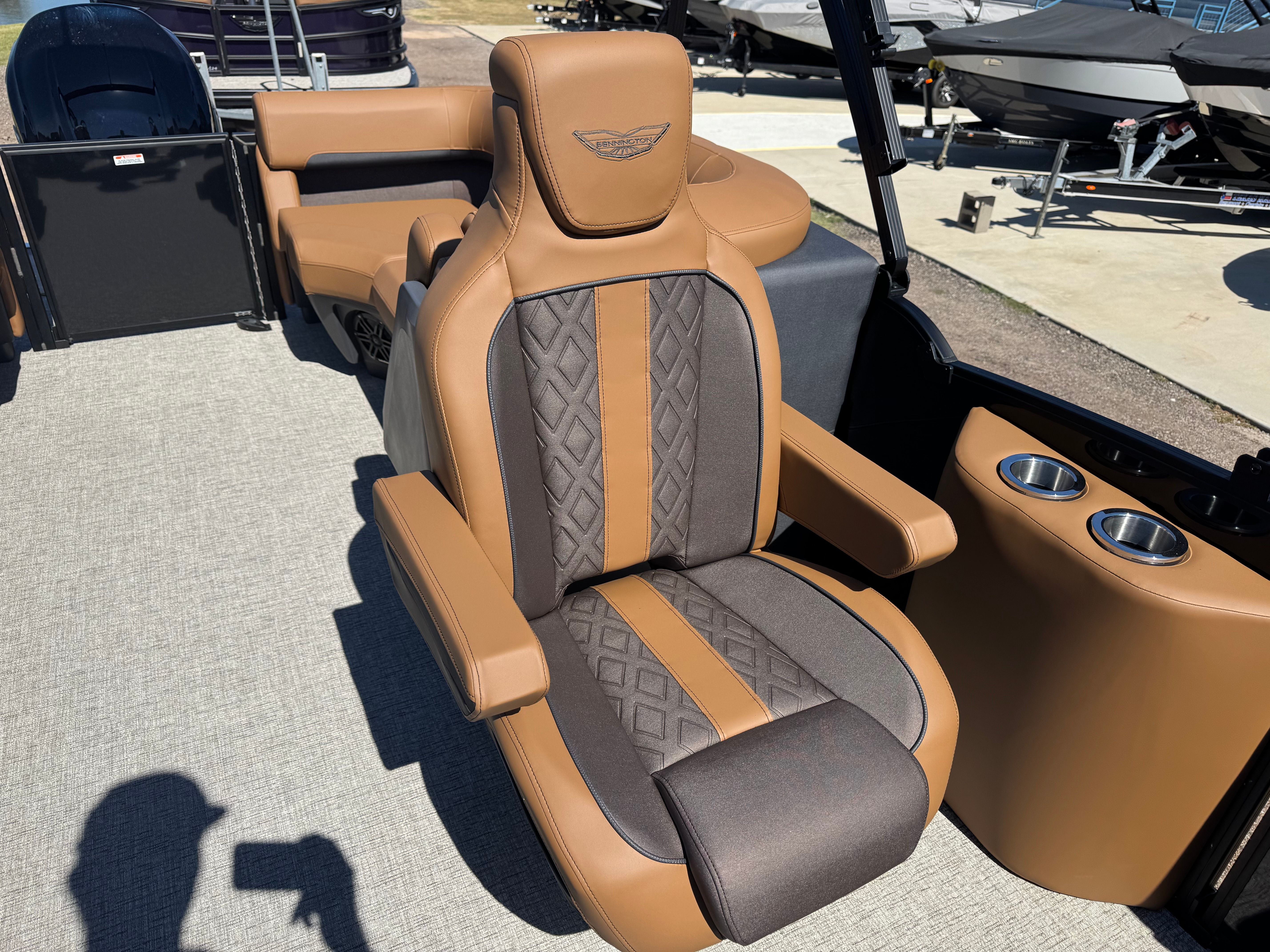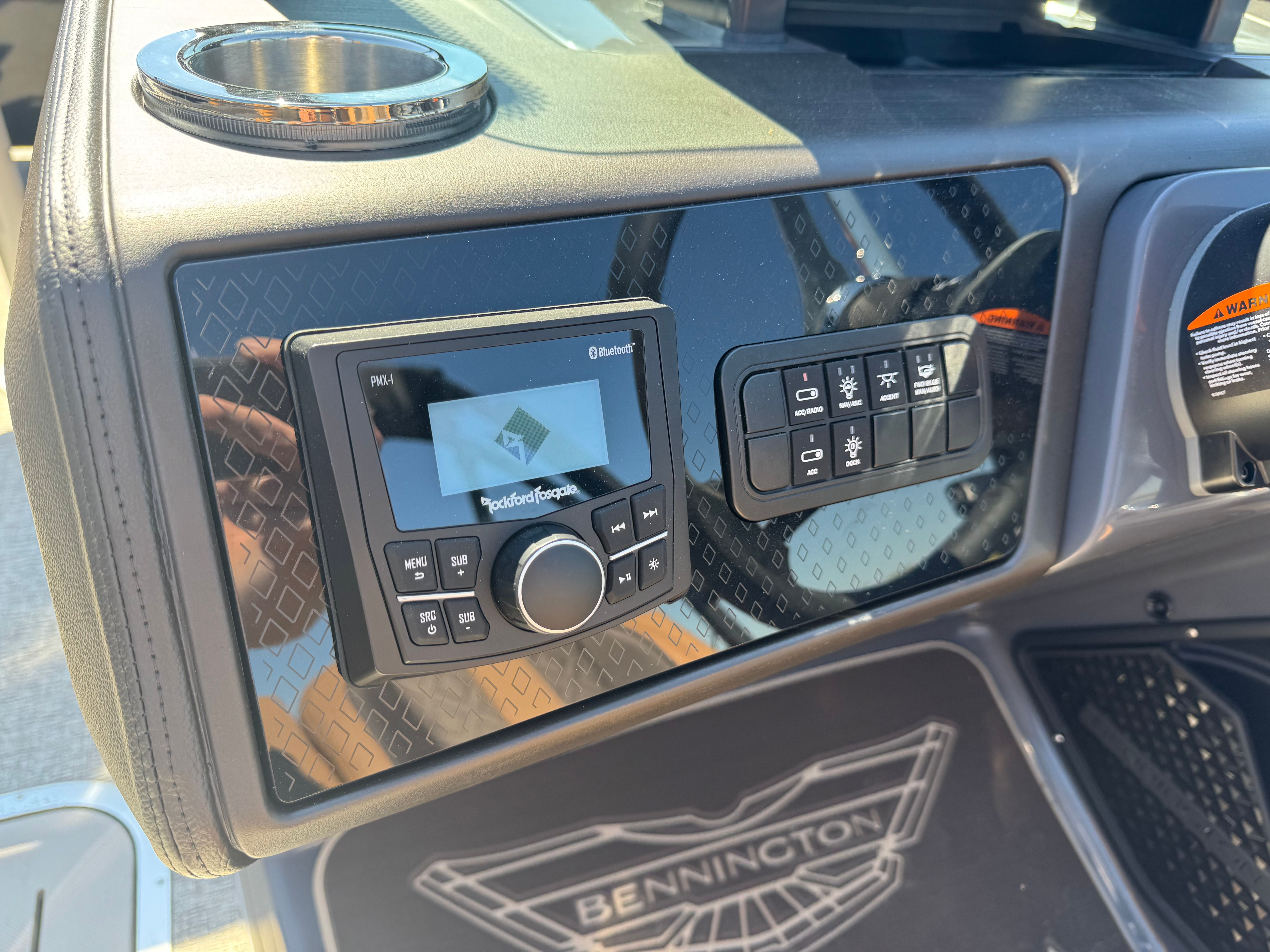 This Bennington pontoon boat for sale is loaded with premium features designed to elevate your boating experience. The RGB Control M Series lighting system sets the mood with customizable colors, while toekick lights add a subtle, sophisticated glow for evening outings. Entertainment is at its finest with Rockford Fosgate M1 Lighted Speakers, delivering crystal-clear sound and vibrant illumination to keep the party going well after sunset. Illuminated cupholders ensure your favorite beverages are always within reach, even during nighttime cruises.The elevated console with Pocket Mythos offers enhanced visibility and a commanding view of the water, while the stowable sculpted rectangular table exchange provides a versatile space for dining, games, or simply relaxing with friends. Every detail, from the stylish accents to the ergonomic layout, is designed to maximize comfort and convenience on board.