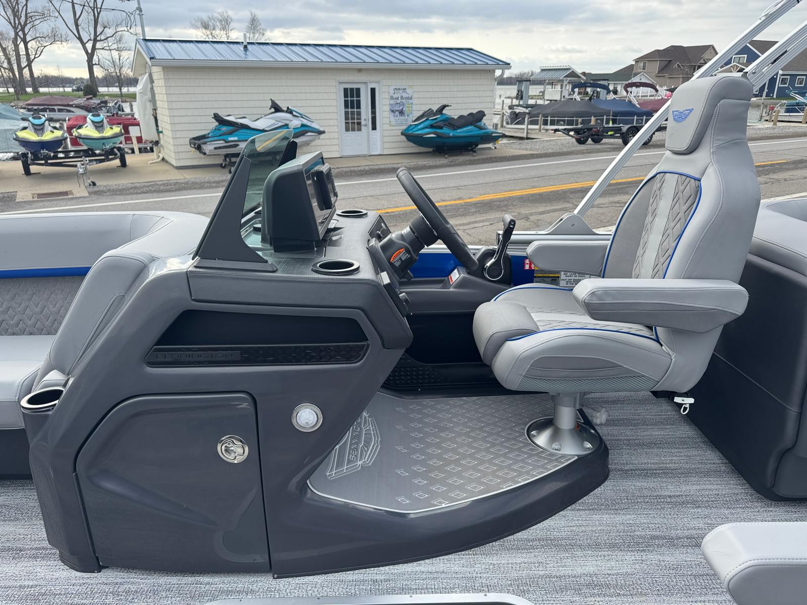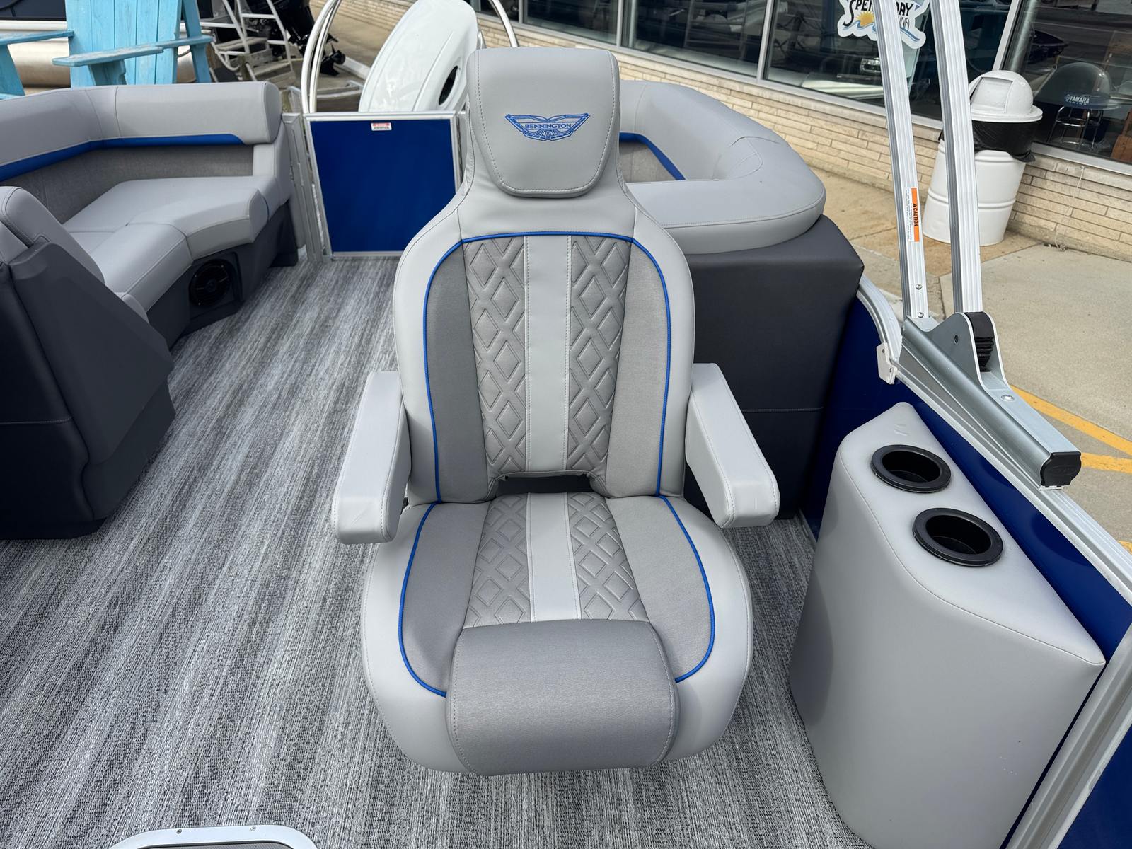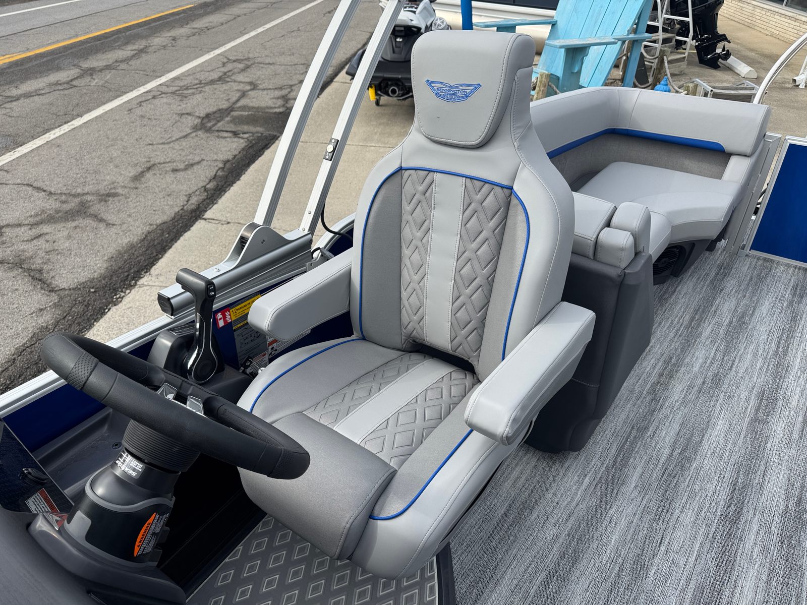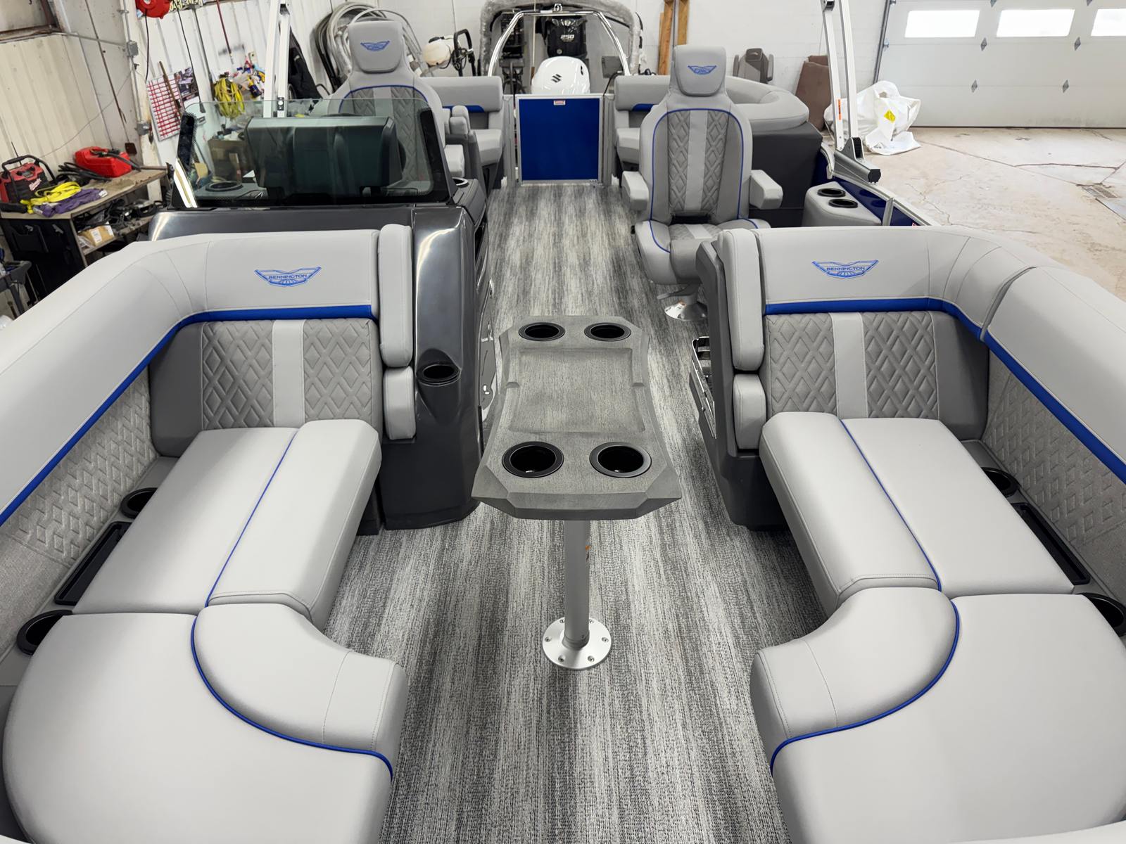 The 2026 Bennington 22 MFB SPS pontoon stands out with its impressive 24.25-foot length, offering ample space for relaxation and socializing. As a new Bennington boat for sale, this model showcases the brand’s commitment to craftsmanship, comfort, and cutting-edge design. The sleek exterior features a Smooth Metallic Luminous Blue panel with Smooth Metallic White accents, complemented by a sophisticated Shoreline Grey finish. Inside, the Luminous Blue Simtex interior accent adds a touch of elegance and modern flair, creating a welcoming atmosphere for every adventure.