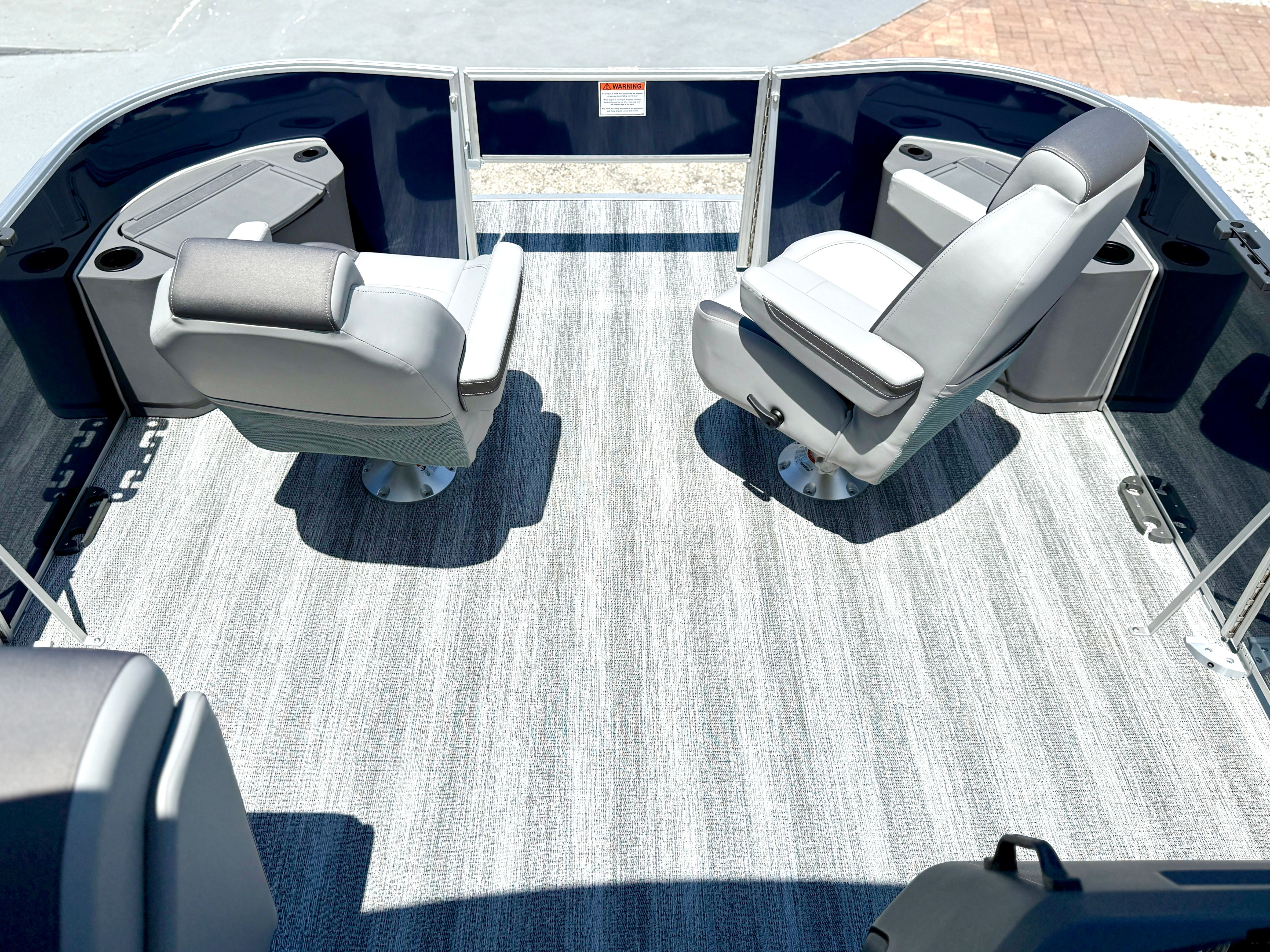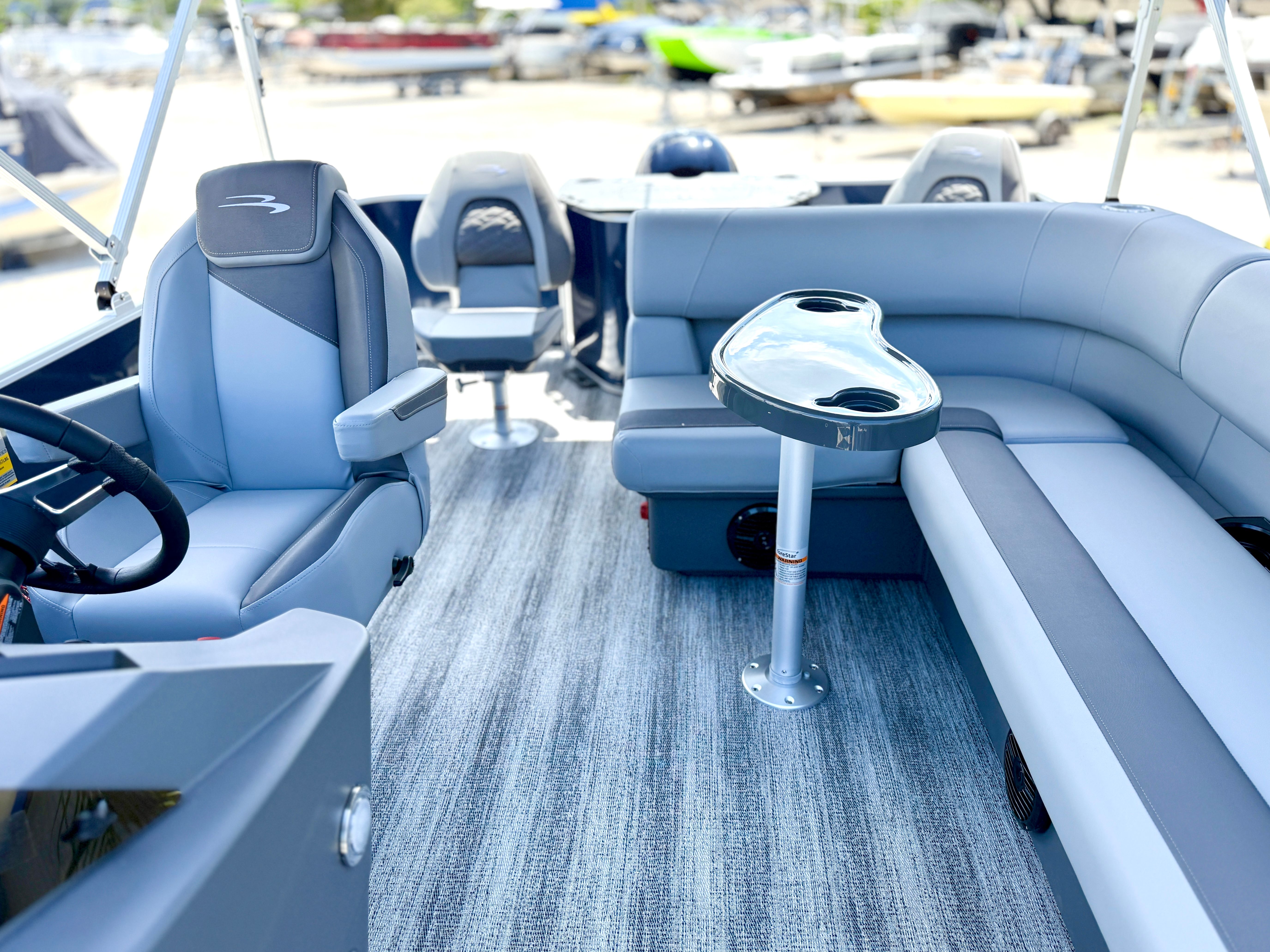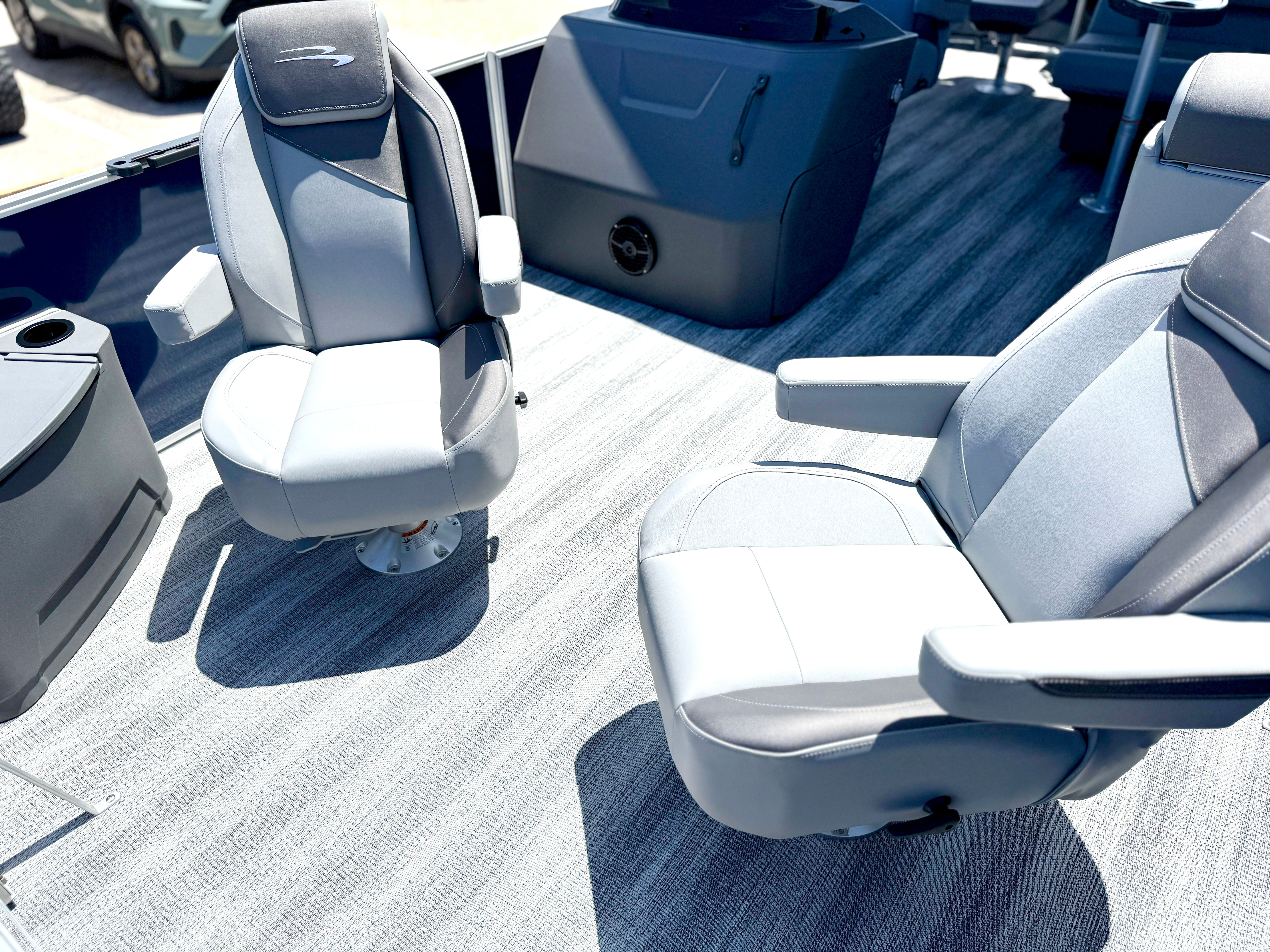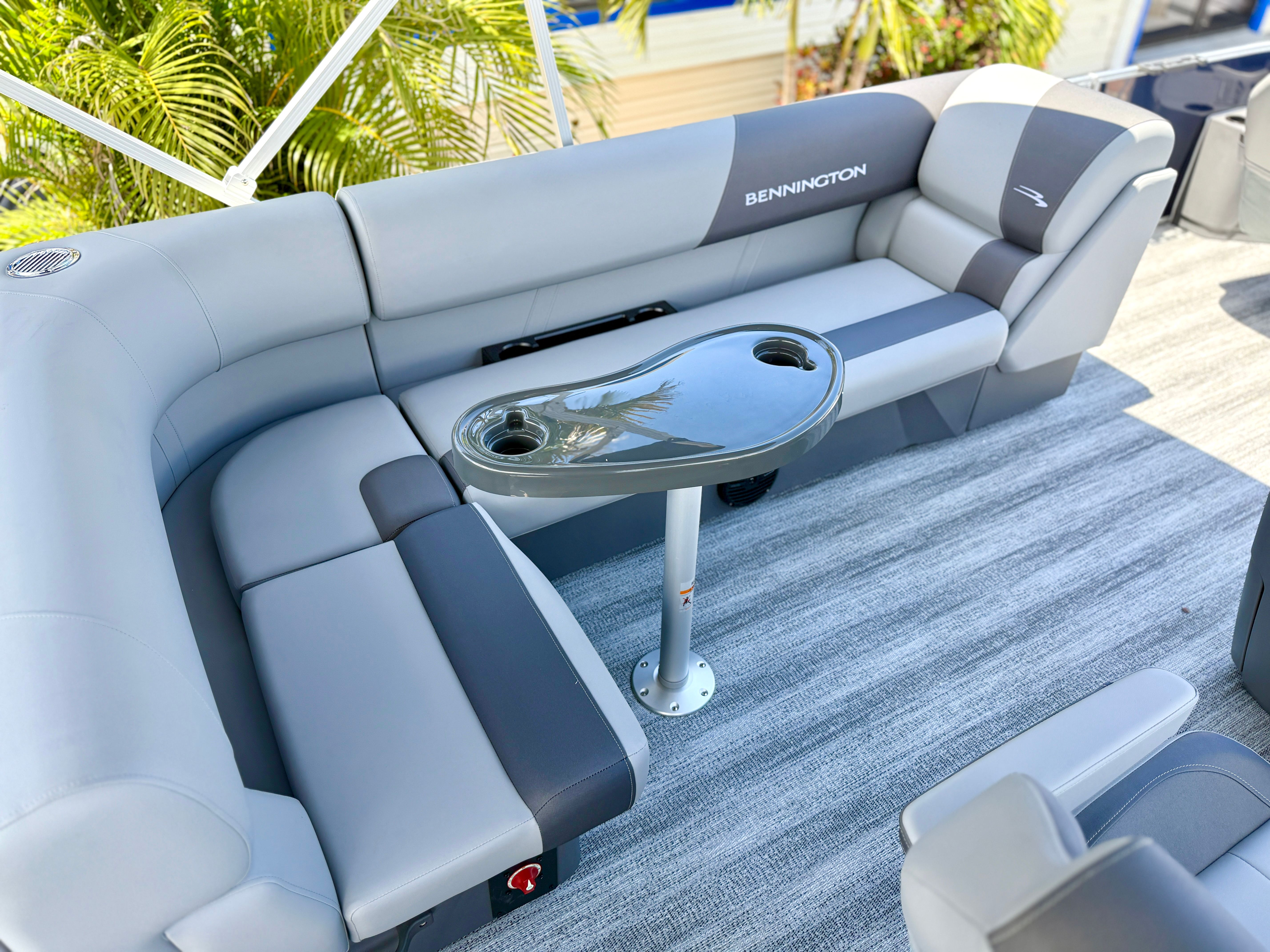 Step aboard the Bennington 22 SF SPS and experience a world of comfort and convenience. The Serene Soft Touch Vinyl with Simtex Accents offers a plush, inviting seating environment, perfect for relaxing or entertaining guests. The canvas in Ocean Blue Tweed not only adds a touch of elegance but also provides protection from the elements, ensuring your boating experience remains enjoyable in any weather. The Ironwood Dash Accent enhances the helm with a refined, upscale appearance, while the Shadow Grey color scheme throughout the boat adds a modern and cohesive feel.Practicality meets innovation with the Benny Quick Fender Latch Kit in Silver (Qty 4), making it easy to secure your pontoon at the dock or during stops along your journey. The single switch battery system simplifies power management, ensuring you have reliable energy for all your onboard systems. Every detail of this Bennington pontoon boat is thoughtfully designed to maximize your enjoyment and minimize hassle, so you can focus on making the most of your time on the water.