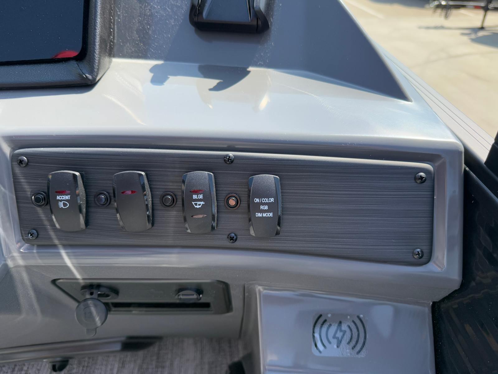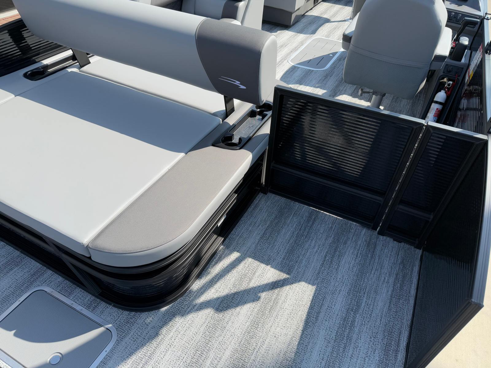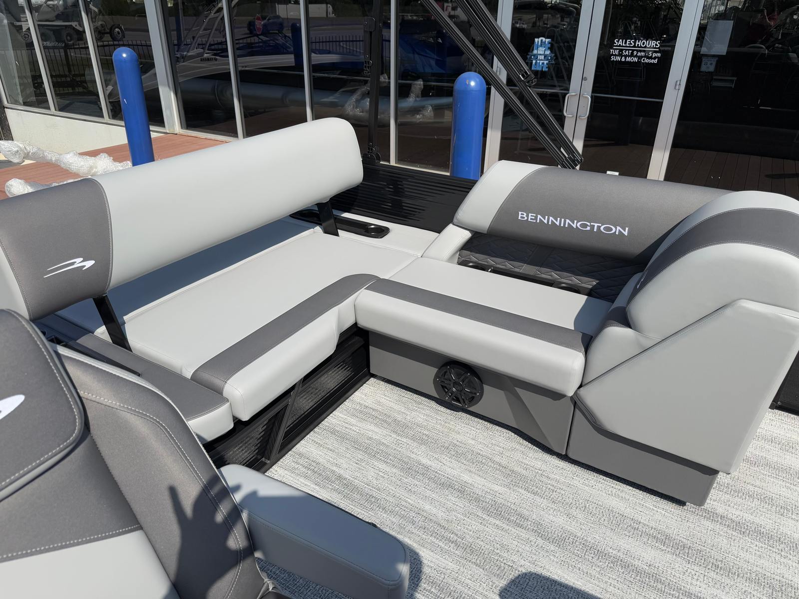 This new Bennington pontoon is loaded with premium features designed to enhance your time on the water. The dual battery switch with fuse ensures reliable power management, allowing you to enjoy extended outings without worry. The blackout logos add a touch of elegance, while the Benny Quick Fender Latch Kit in black makes docking and undocking a breeze.For those who love music and ambiance, the Bennington 22 SSB SPS comes equipped with a Rockford Fosgate 6.5" M1 lighted speaker system, featuring four speakers with an RGB control upgrade. The RGB speaker module allows you to customize the lighting to match your mood or the occasion, creating a vibrant atmosphere for every gathering. The Midnight Black canvas provides shade and protection, while the Shadow Grey and Carbon base/accent colors offer a refined aesthetic that complements the boat’s overall design.