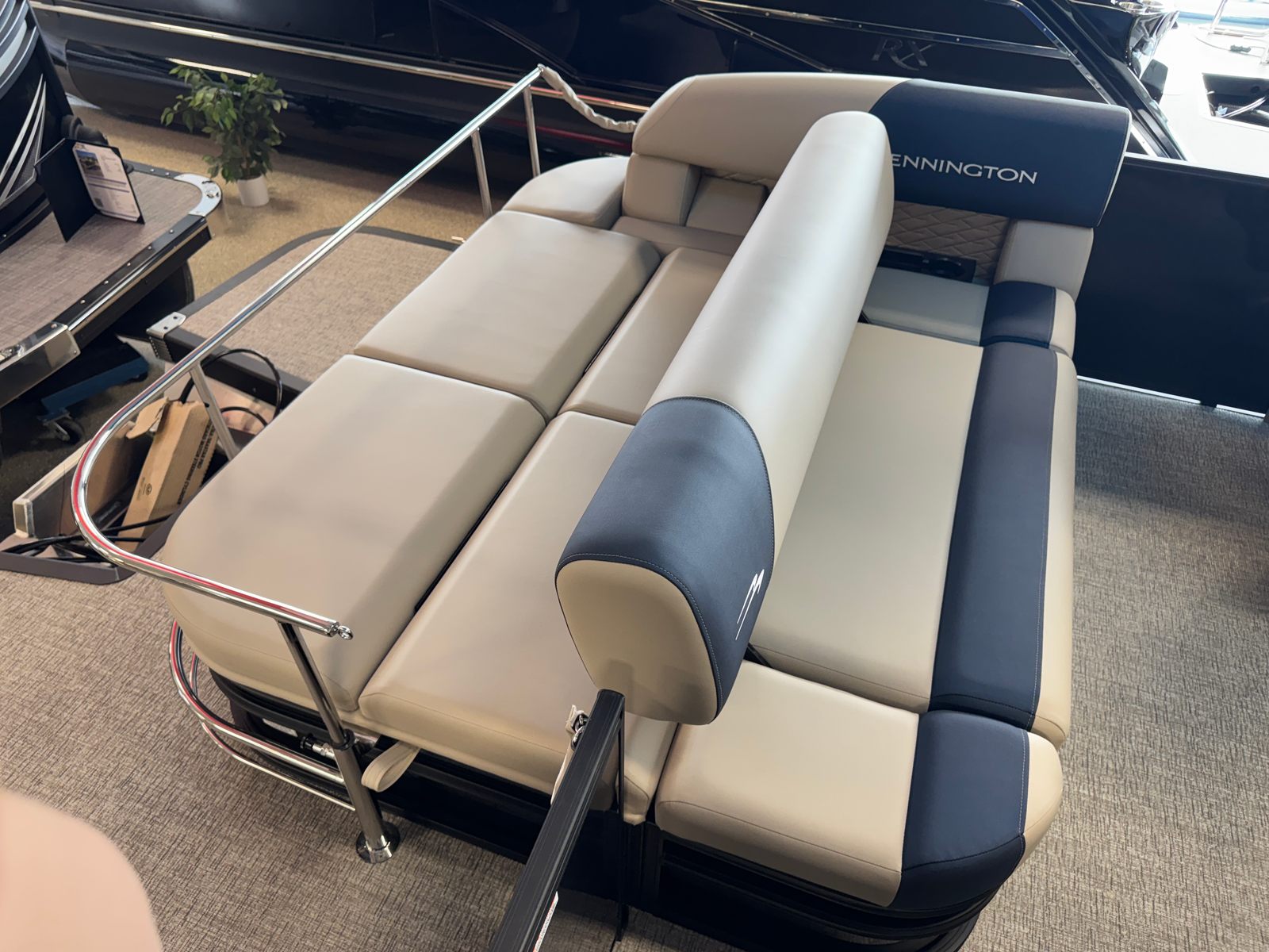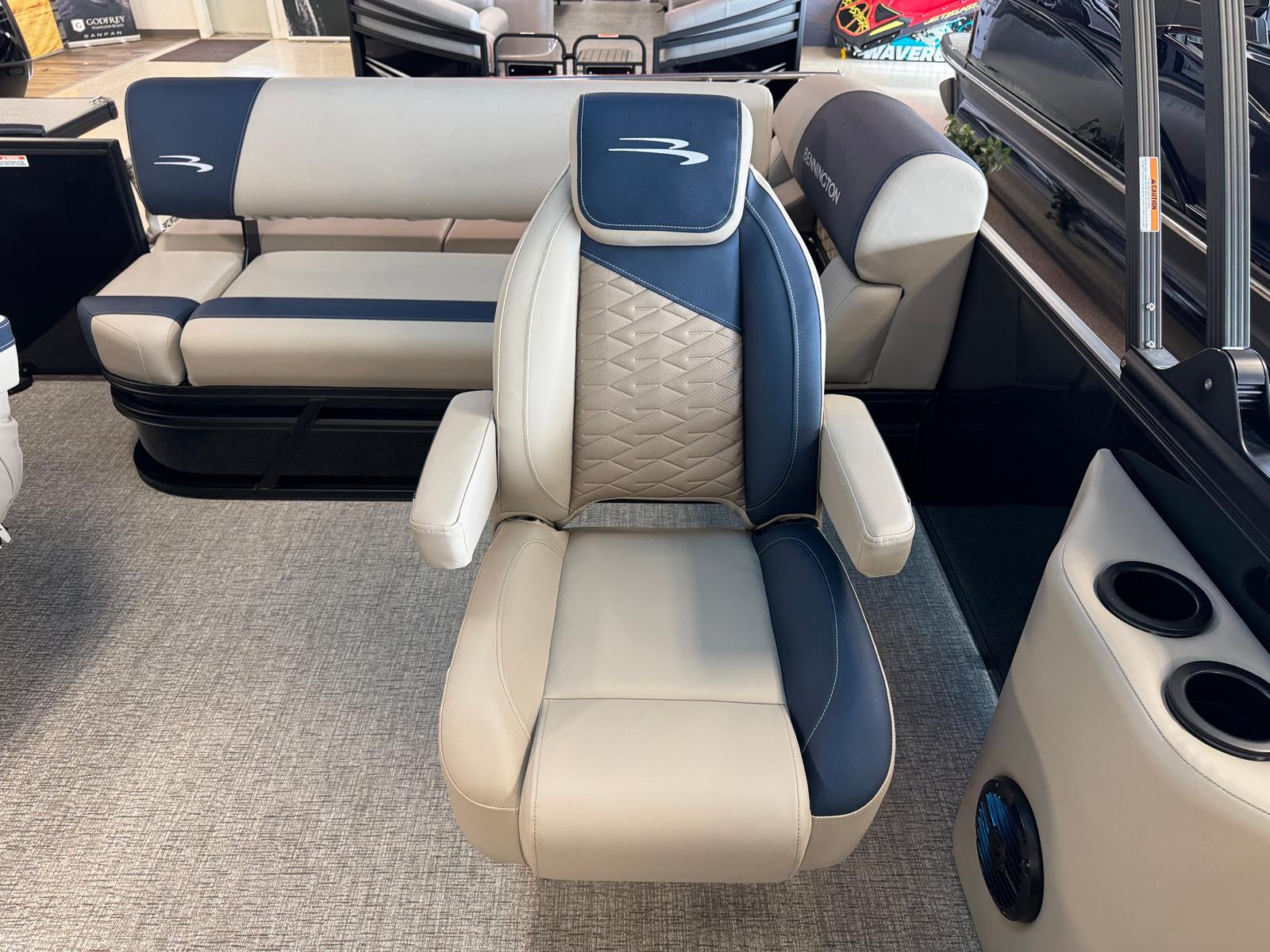 The Bennington 22 SSB SPS is packed with special features designed to enhance your time on the water. The single switch battery system offers straightforward operation, while the blackout logos and Ironwood Dash Accent add a touch of sophistication to the boat’s aesthetic. The Bimini – Electric Power Top Curved Analog S Blk provides effortless shade and protection from the sun, and the Canvas – Midnight Black and Dolce materials ensure durability and style. These features not only elevate the look of your pontoon but also contribute to a comfortable and enjoyable boating experience.