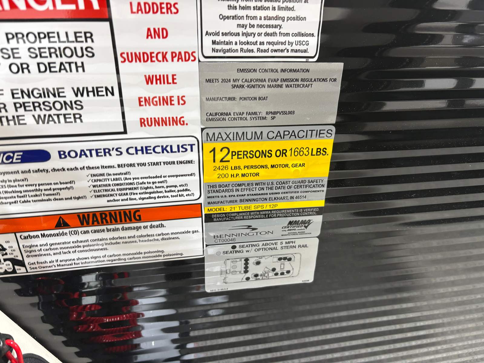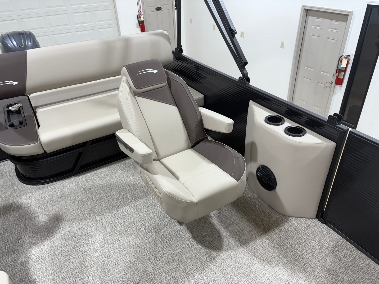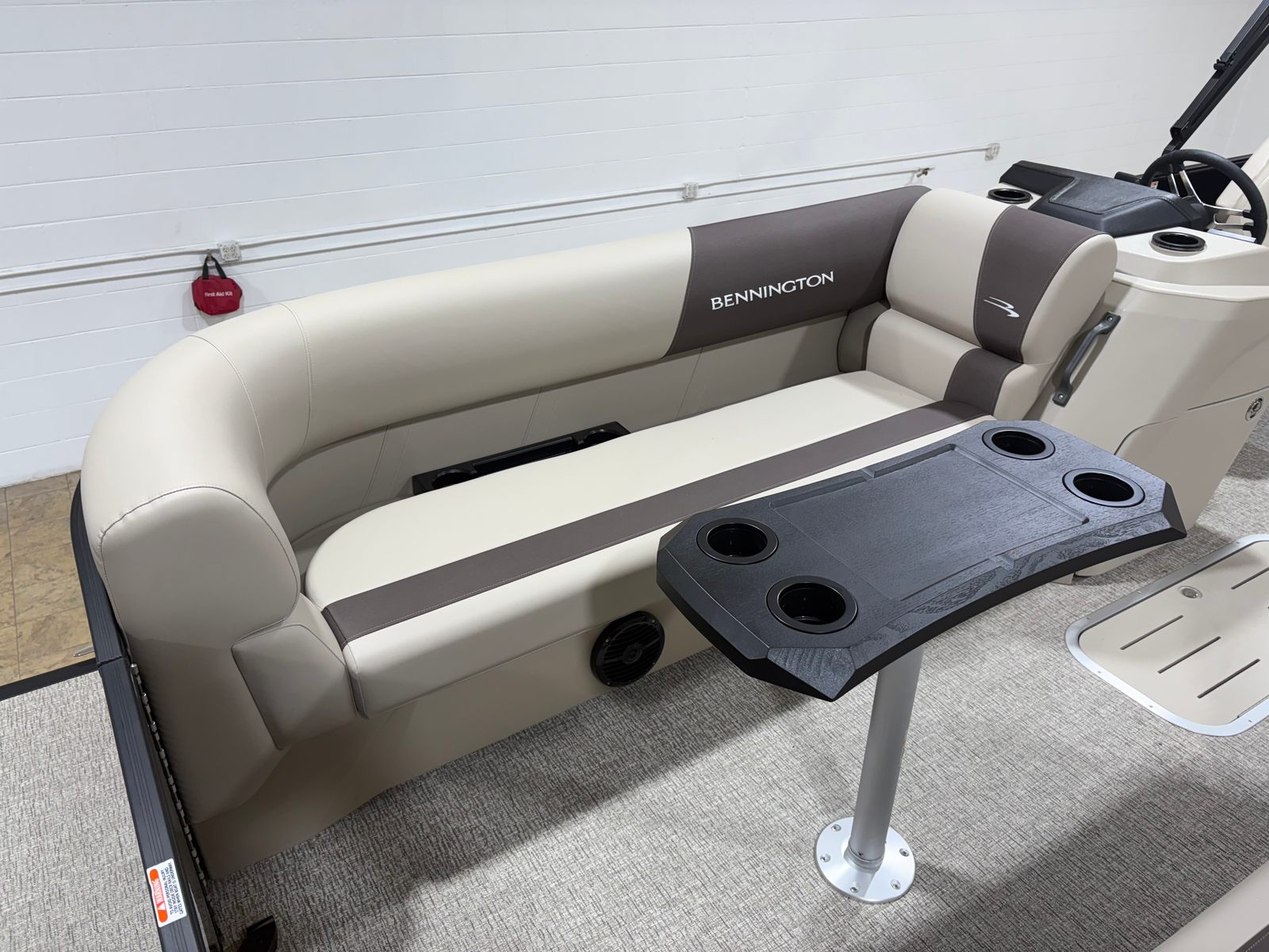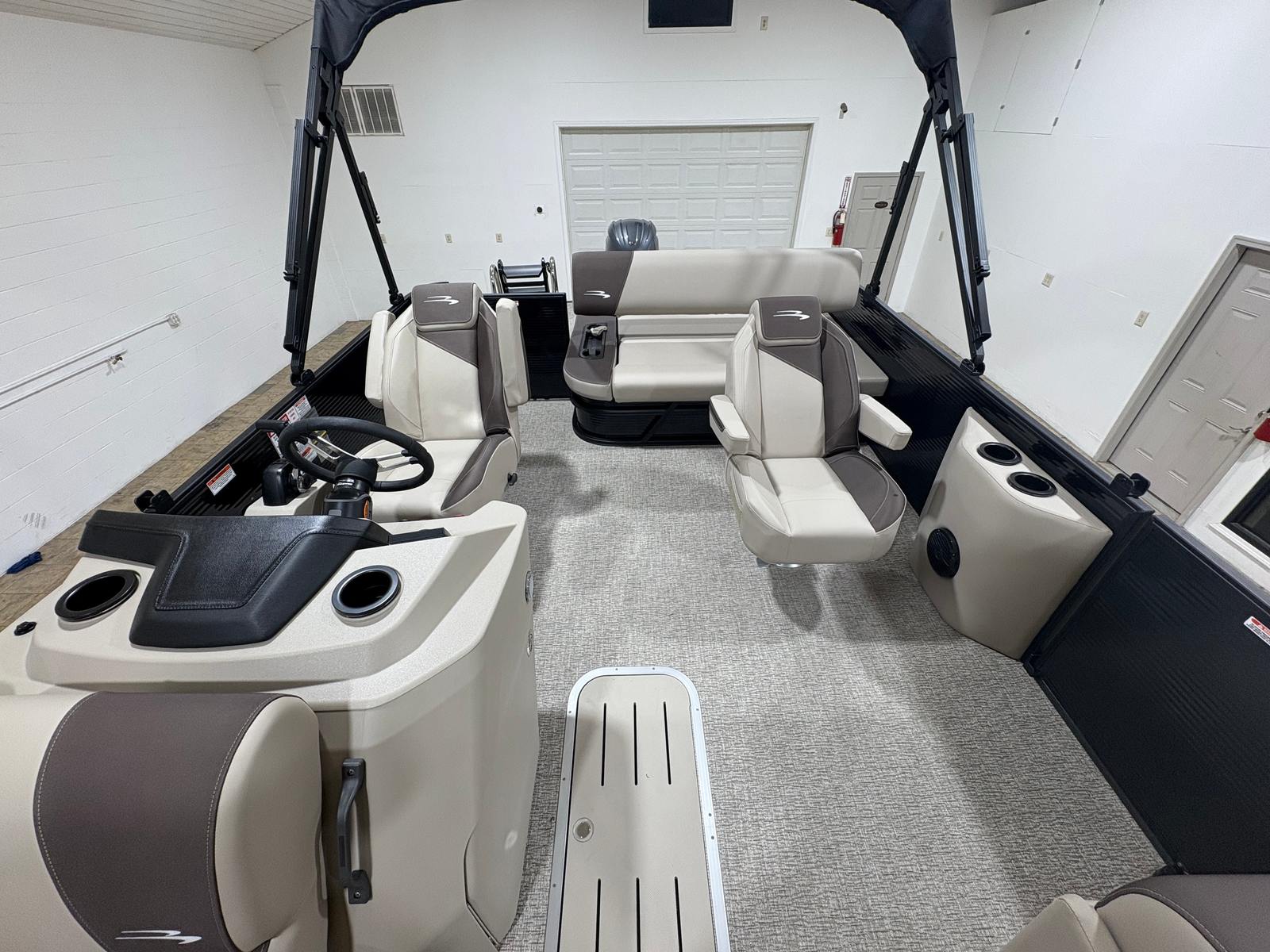 Step aboard and discover a host of special features designed to enhance your boating experience. The 8.5x10 black bimini provides generous shade, allowing you to relax in comfort even on the sunniest days. The analog VeeThree gauges, paired with a Garmin Echomap 52CV chartplotter, offer intuitive navigation and real-time data to keep you informed and safe on every journey. In-floor storage ensures your gear stays organized and out of the way, maximizing deck space for socializing and fun.The interior is a showcase of luxury, featuring base and accent colors in Dolce and Espresso, complemented by Serene Soft Touch Vinyl with Simtex accents. The captain’s mid-back recliner offers ergonomic support for long days at the helm, while the ski tow bar opens up endless possibilities for water sports and adventure. Every detail, from the blackout logos to the midnight black canvas, reflects Bennington’s commitment to style and sophistication.
