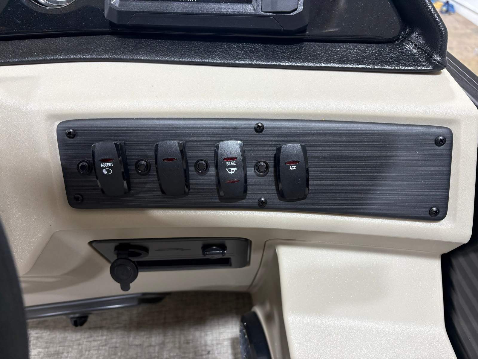 This pontoon boat for sale is as practical as it is stylish. The generous in-floor storage makes it easy to stow away life jackets, water toys, and personal items, keeping the deck clear for relaxation and activities. Docking is a breeze thanks to the responsive handling and manageable length, making it ideal for both seasoned boaters and newcomers. The SPS Performance Package enhances fuel efficiency, so you can spend more time exploring and less time worrying about refueling.The durable midnight black canvas and blackout logos not only add visual appeal but also provide protection from the elements, ensuring your investment stays looking sharp season after season. The analog gauges and Garmin chartplotter simplify navigation, giving you confidence whether you’re exploring new waters or returning to your favorite spot. Every feature is designed to make ownership easy, enjoyable, and worry-free.