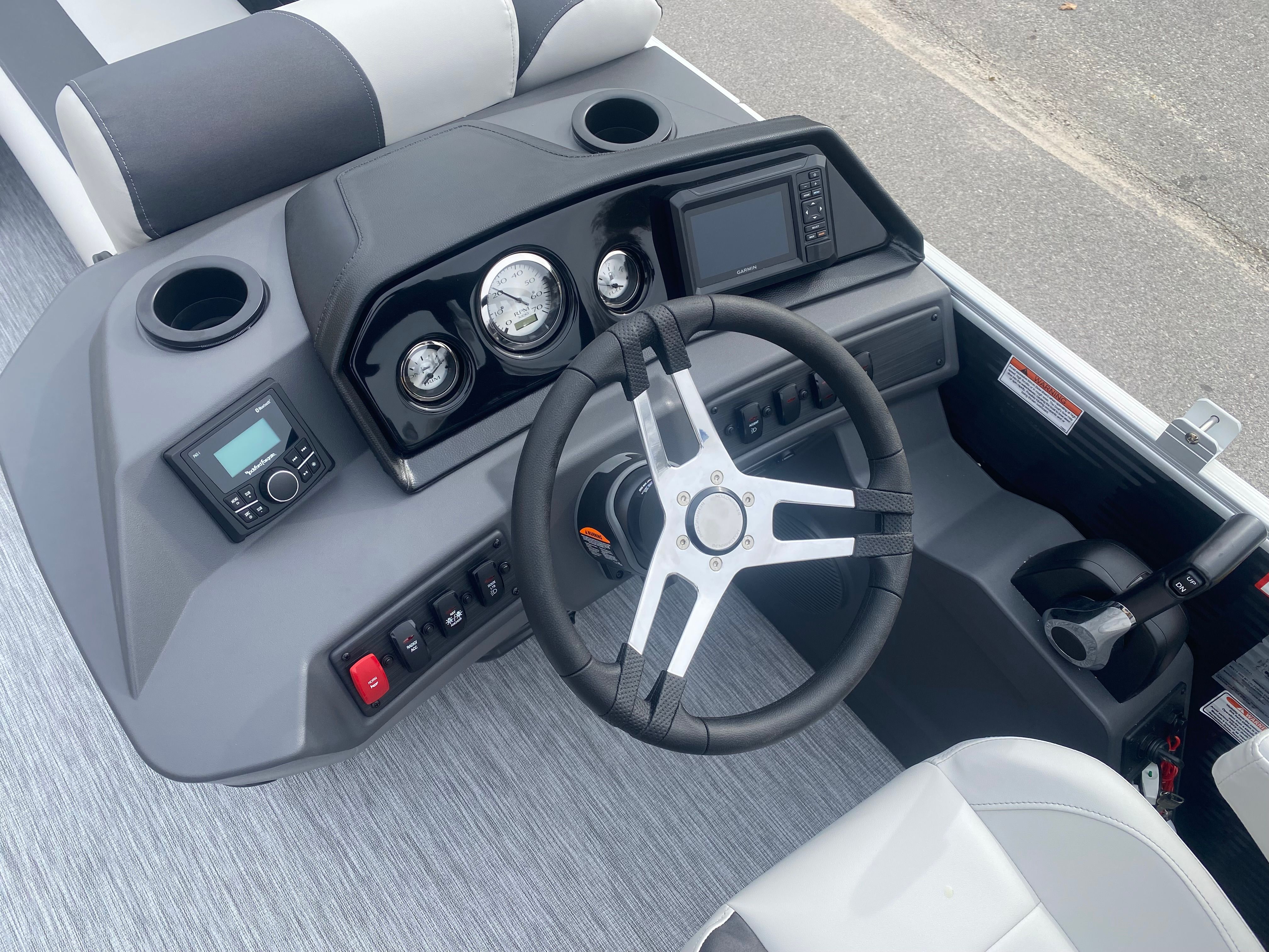 The Bennington 22 SSR SPS is packed with special features designed to enhance your boating experience. The Gemini Black paneling and Midnight Black canvas give the boat a striking, contemporary look, while the Ironwood dash accent adds a touch of elegance to the helm. Inside, the Slate Simtex interior accent provides a comfortable and stylish seating environment, perfect for lounging or socializing. The wireless charger ensures your devices stay powered throughout your trip, keeping you connected and entertained. For those who love water sports, the Ski Tow Bar – SPS is a fantastic addition, making it easy to enjoy wakeboarding, tubing, or skiing with friends and family.