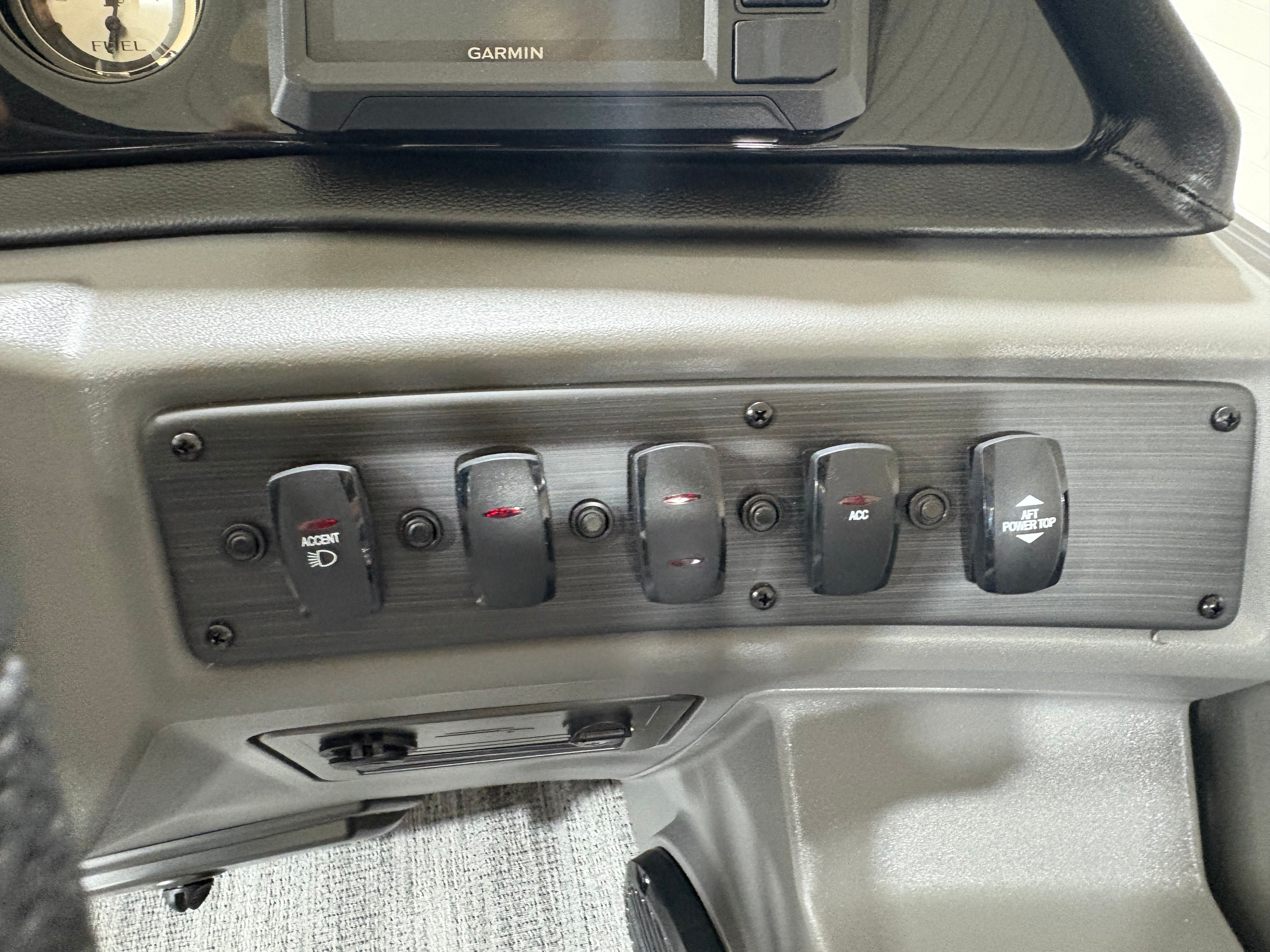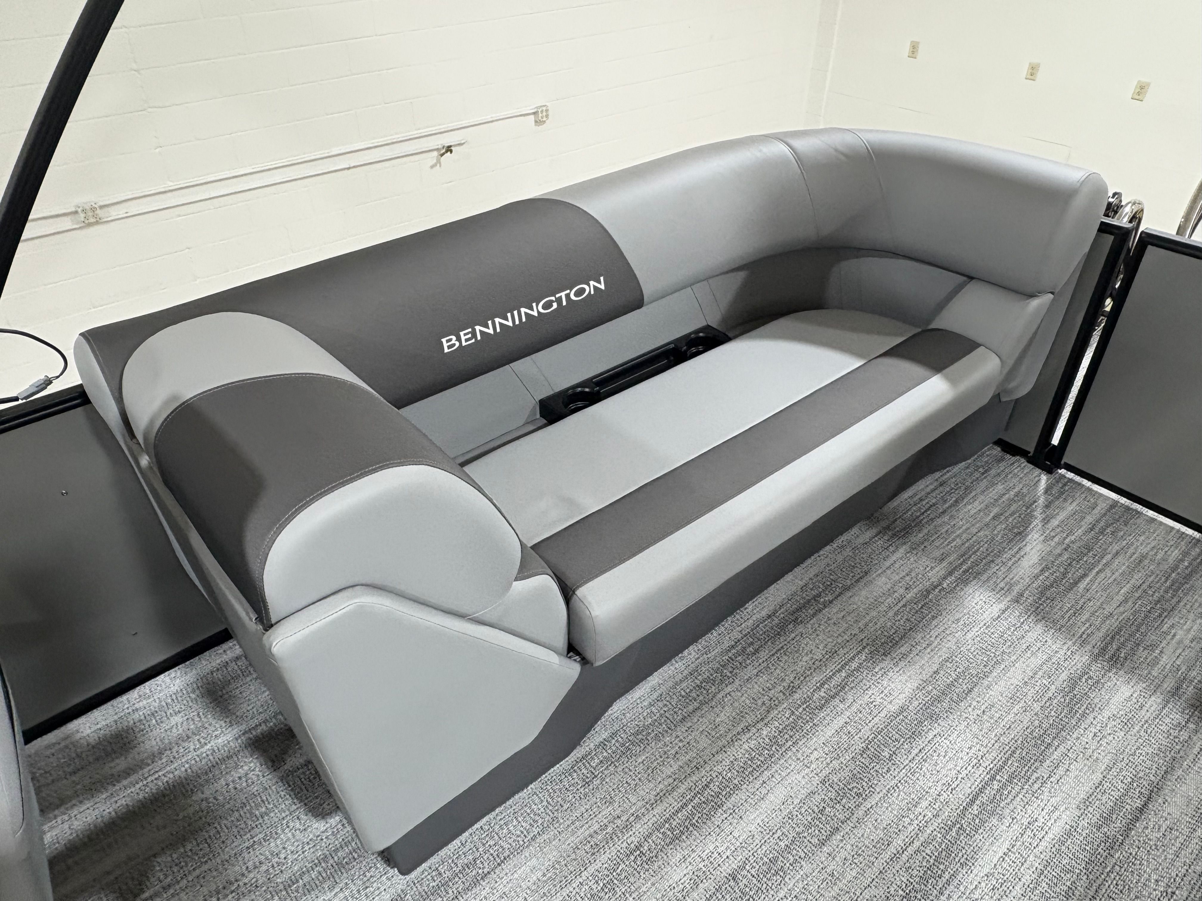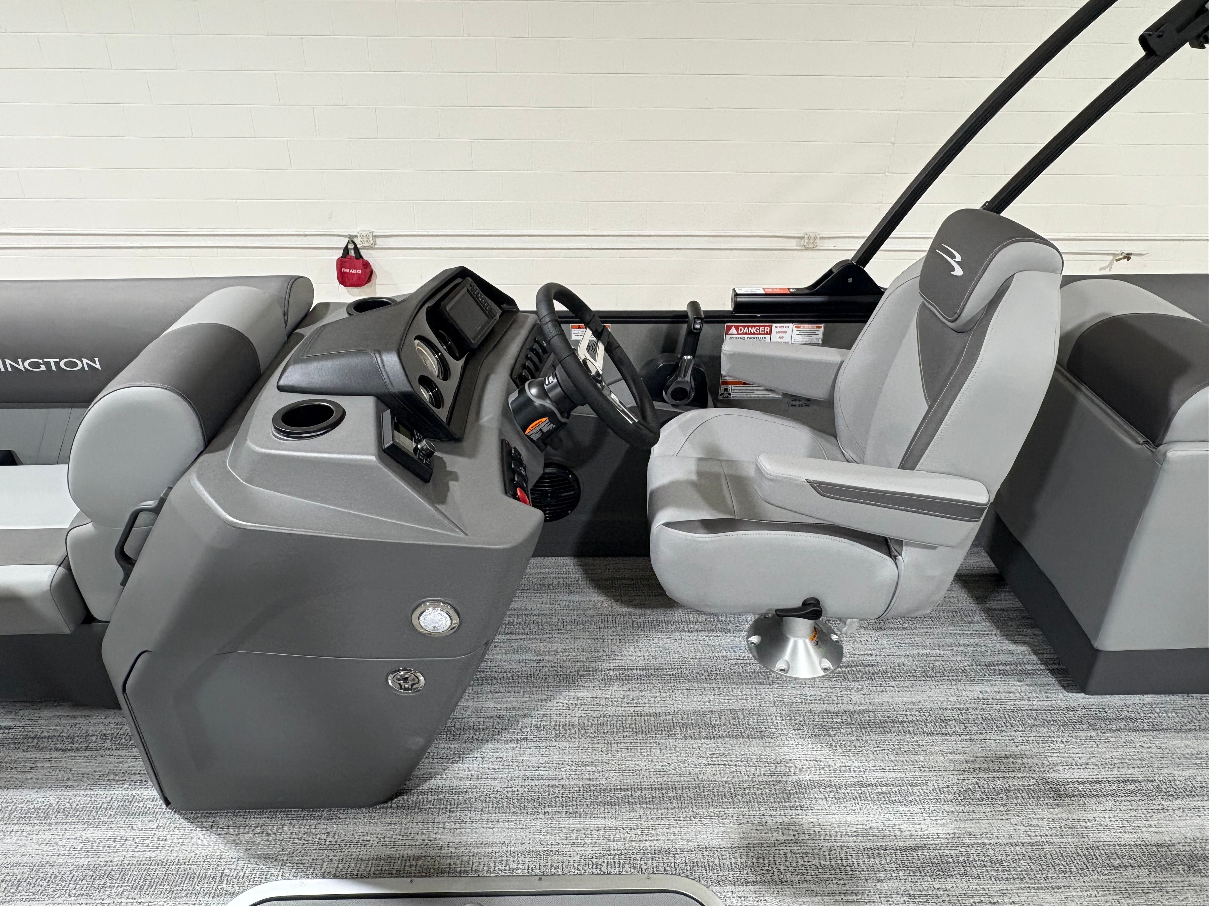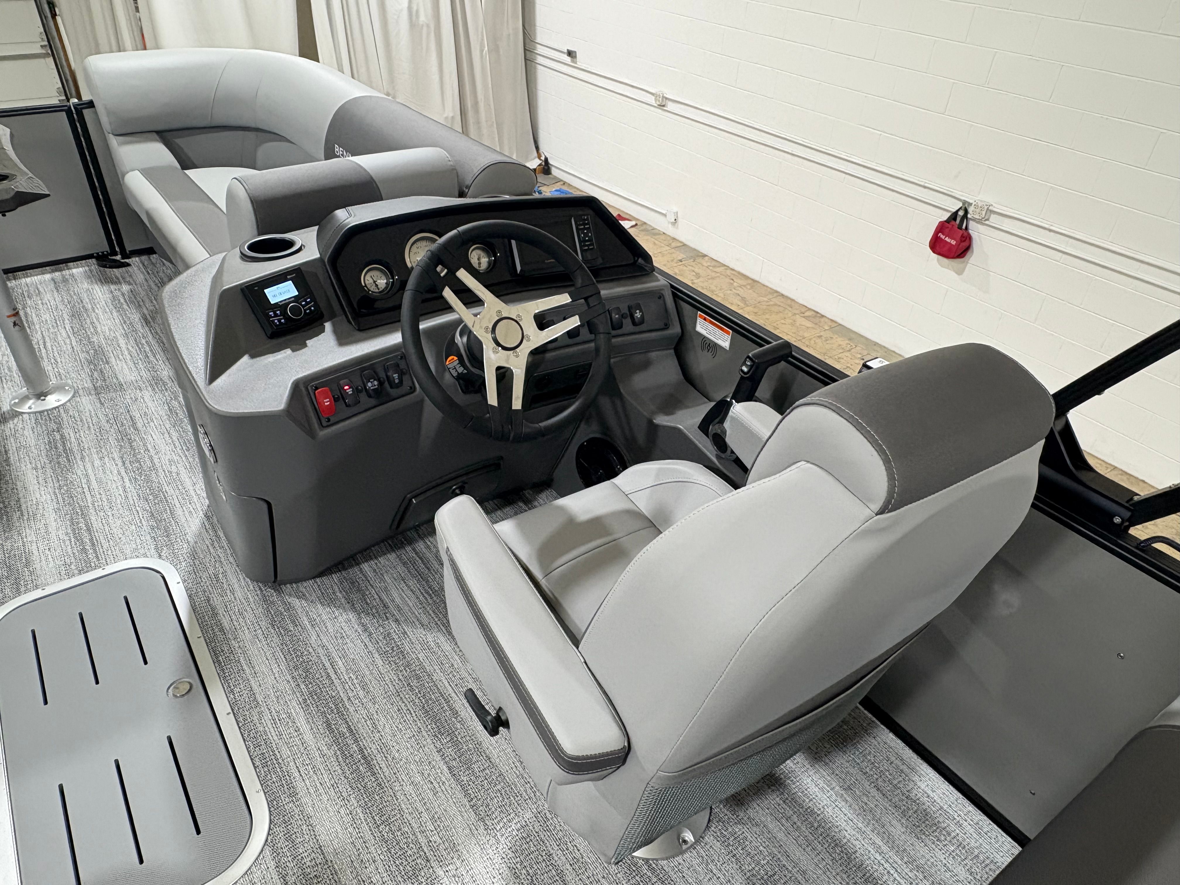 The Bennington 22 SSR SPS is packed with special features that enhance both convenience and enjoyment. The Wireless Charger keeps your devices powered up, so you can stay connected and capture every moment. The Blackout Luxe Package adds a sophisticated touch, elevating the boat’s visual appeal and making a bold statement on the water. Bow Pop-Up Cleats and Aft Pop-Up Cleats provide secure and easy docking, while the Benny Quick Fender Latch Kit in black ensures fast and hassle-free protection for your pontoon’s sides.Comfort is paramount, and the Co-Captain’s Mid-Back Recliner offers a plush seating experience for your guests, allowing everyone to relax in style. The No Accent - Smooth finish delivers a clean, modern look that complements the boat’s overall design. Analog Rocker Switching and Analog VeeThree Gauges with Garmin Echomap 52CV Chartplotter provide intuitive control and advanced navigation, making every journey safe and enjoyable. The Dual Switch Battery with Fuse ensures reliable power management, so you can focus on fun without worry.