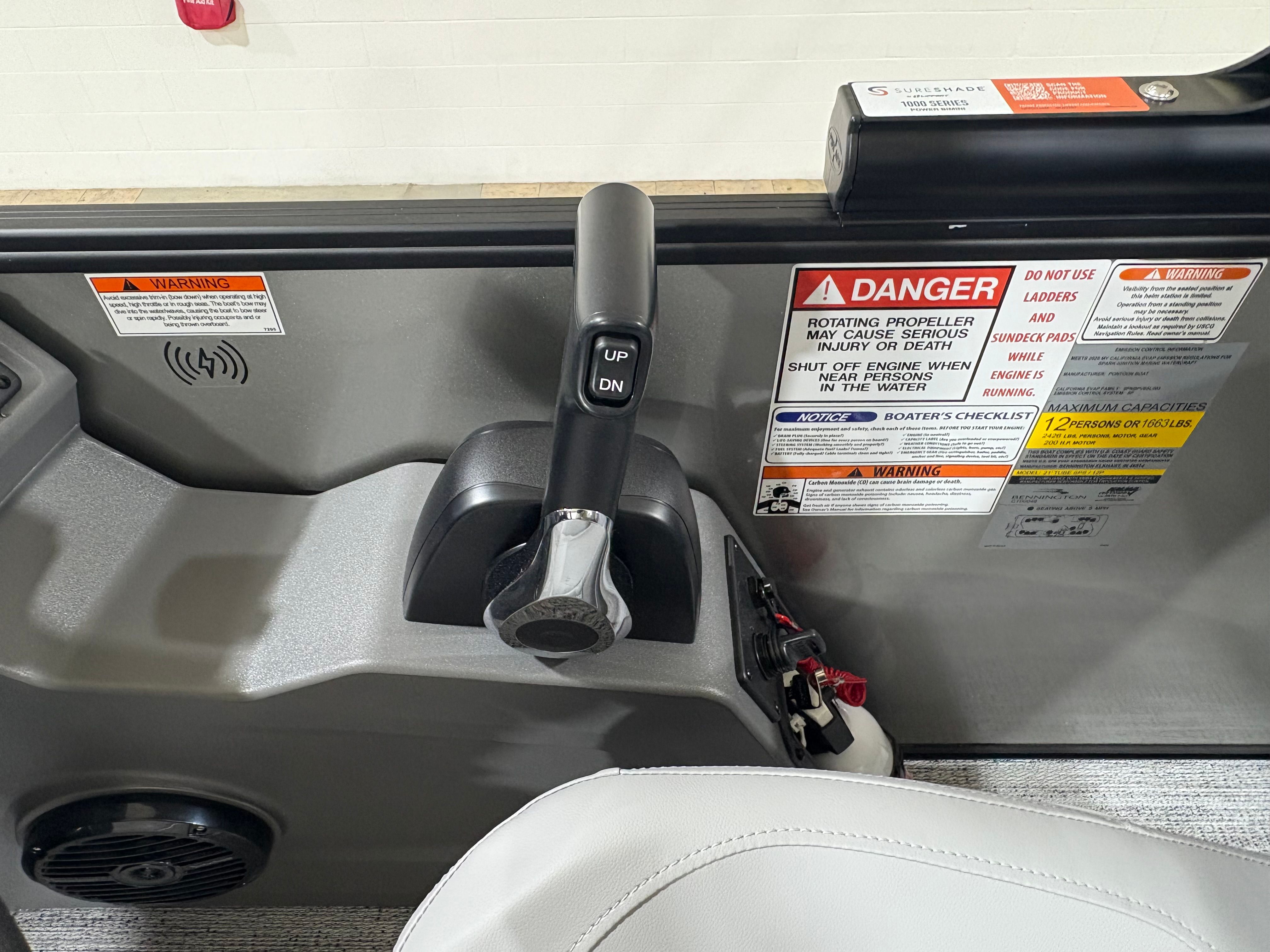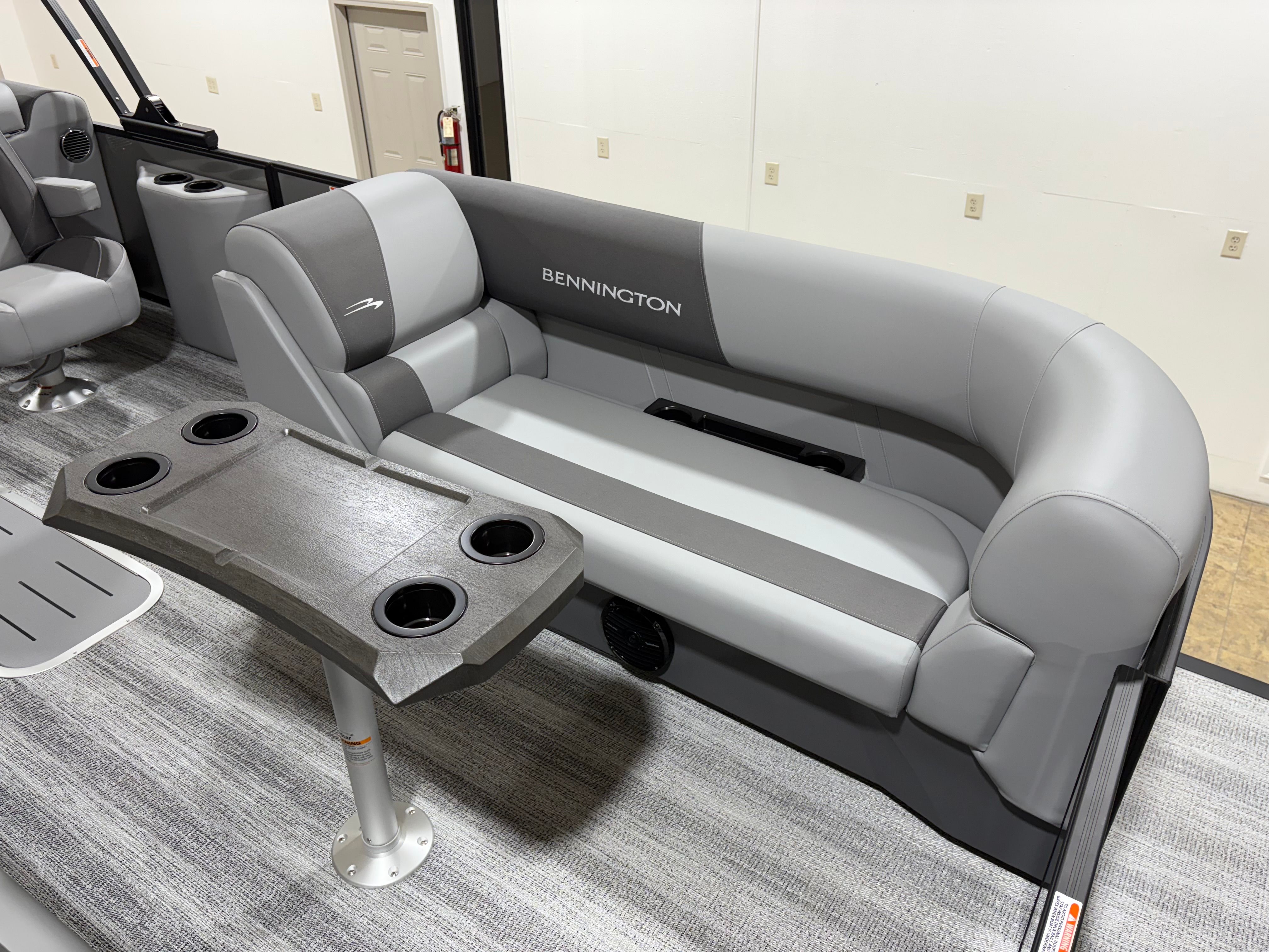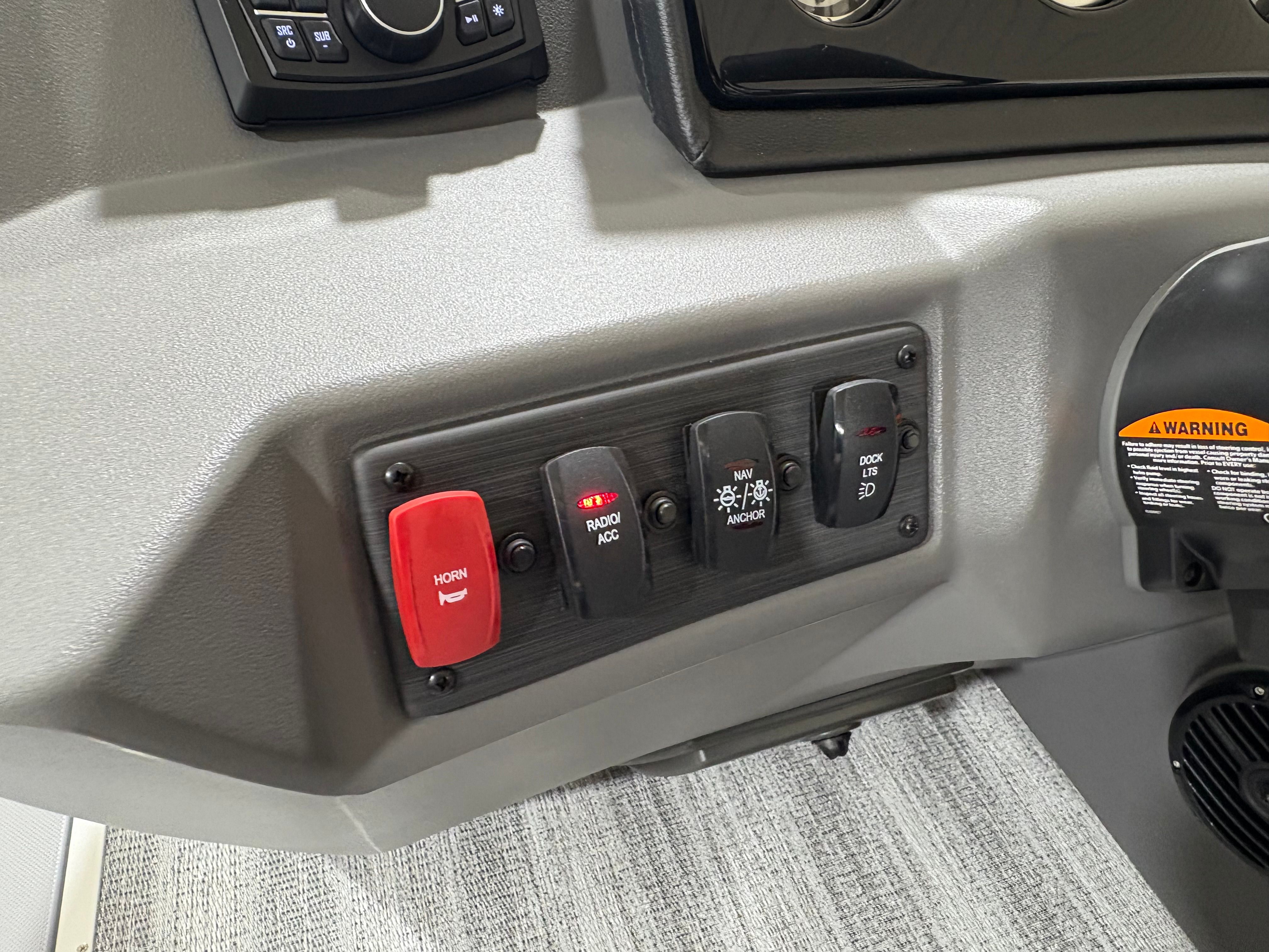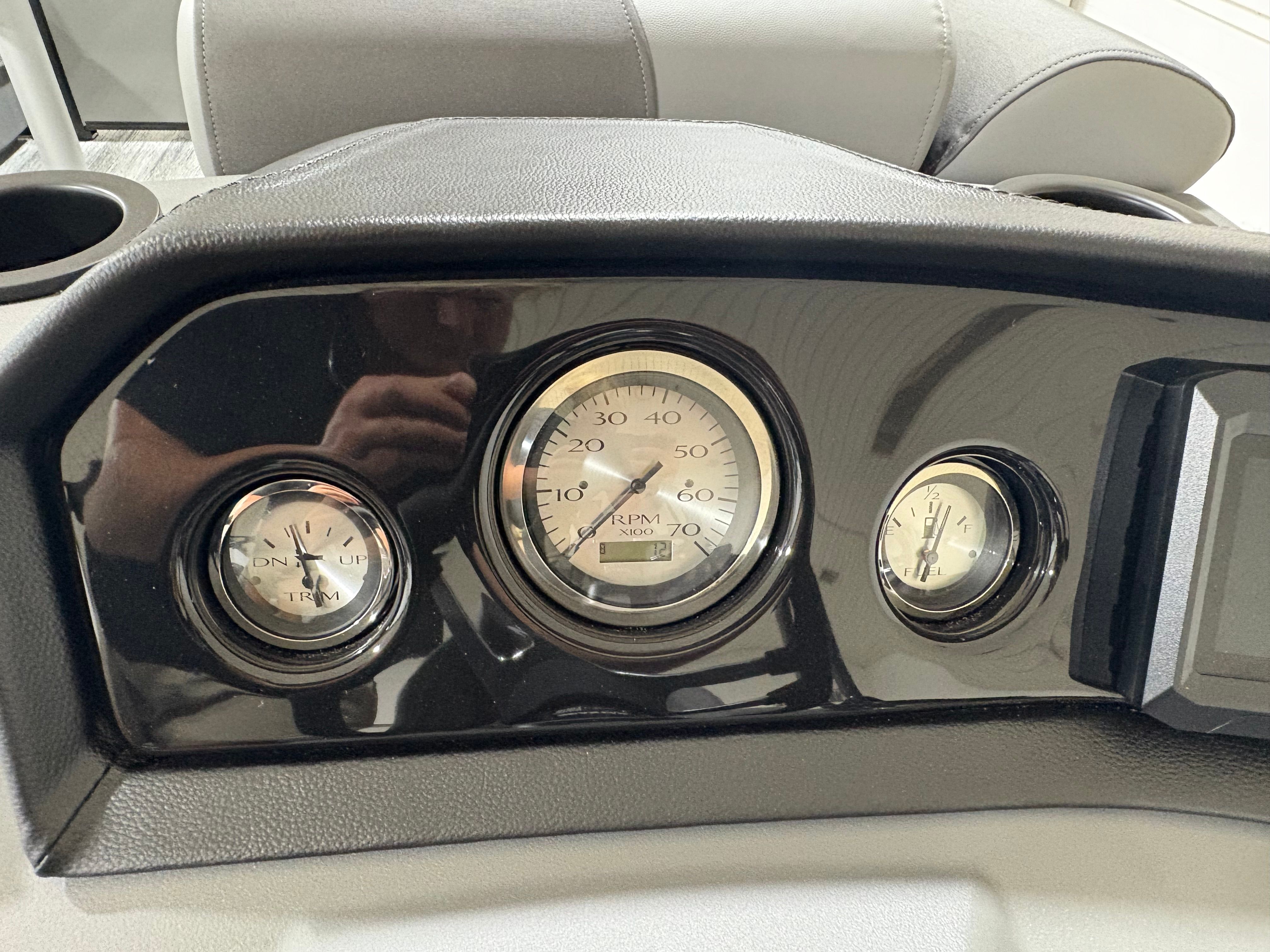 The Bennington 22 SSR SPS is packed with special features that enhance both convenience and enjoyment. The Wireless Charger keeps your devices powered up, so you can stay connected and capture every moment. The Blackout Luxe Package adds a sophisticated touch, elevating the boat’s visual appeal and making a bold statement on the water. Bow Pop-Up Cleats and Aft Pop-Up Cleats provide secure and easy docking, while the Benny Quick Fender Latch Kit in black ensures fast and hassle-free protection for your pontoon’s sides.Comfort is paramount, and the Co-Captain’s Mid-Back Recliner offers a plush seating experience for your guests, allowing everyone to relax in style. The No Accent - Smooth finish delivers a clean, modern look that complements the boat’s overall design. Analog Rocker Switching and Analog VeeThree Gauges with Garmin Echomap 52CV Chartplotter provide intuitive control and advanced navigation, making every journey safe and enjoyable. The Dual Switch Battery with Fuse ensures reliable power management, so you can focus on fun without worry.