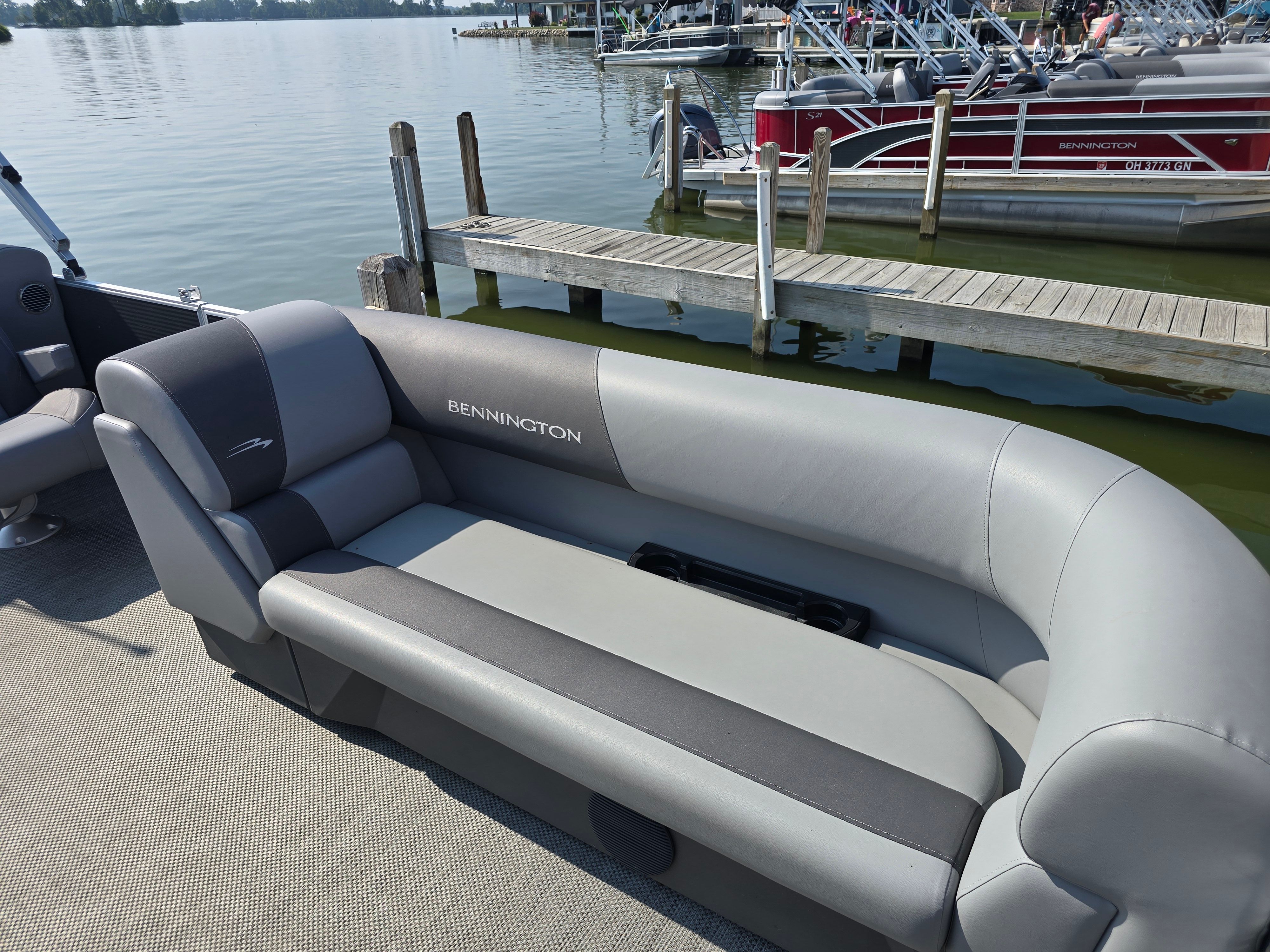 This Bennington boat for sale is loaded with features designed to enhance comfort, style, and functionality. The base furniture is upholstered in premium Simtex material, offering a soft yet durable seating surface that stands up to the elements. Both the captain's chair and co-captain's recliner are finished in Shadow Grey and Carbon, providing ergonomic support and a touch of luxury for those long days on the water. The captain's chair recliner ensures that the driver enjoys maximum comfort and control, while the co-captain's recliner invites passengers to relax and take in the scenery.The dimensional brushed logo and Anthracite paneling add a refined touch to the boat's exterior, while the Seagrass Silver full flooring provides a stylish, slip-resistant surface that is easy to clean and maintain. The thoughtful combination of base and accent colors in Shadow Grey and Carbon creates a cohesive and contemporary look throughout the vessel. Every detail, from the textured panels to the high-quality upholstery, reflects Bennington's commitment to excellence and innovation.