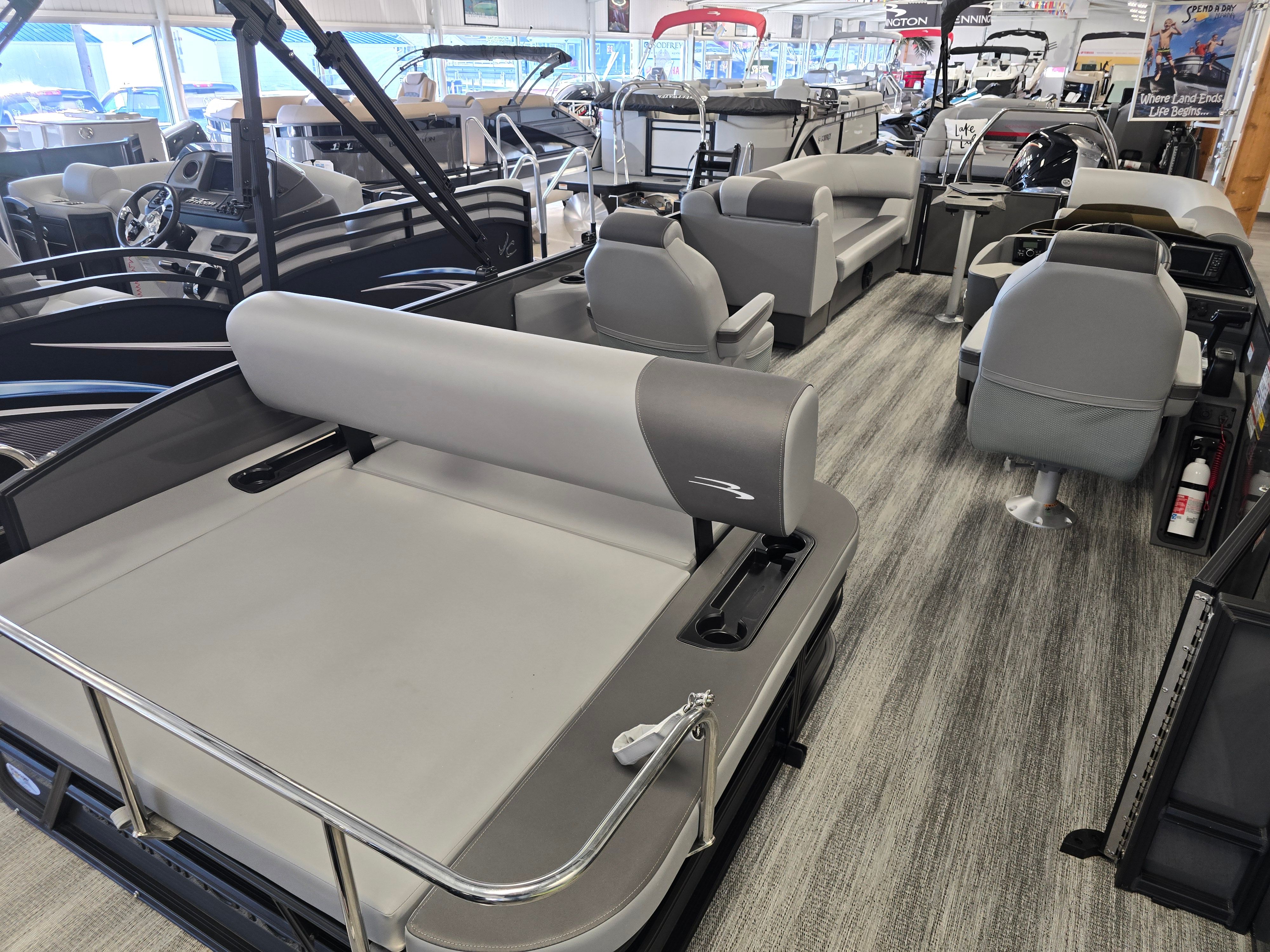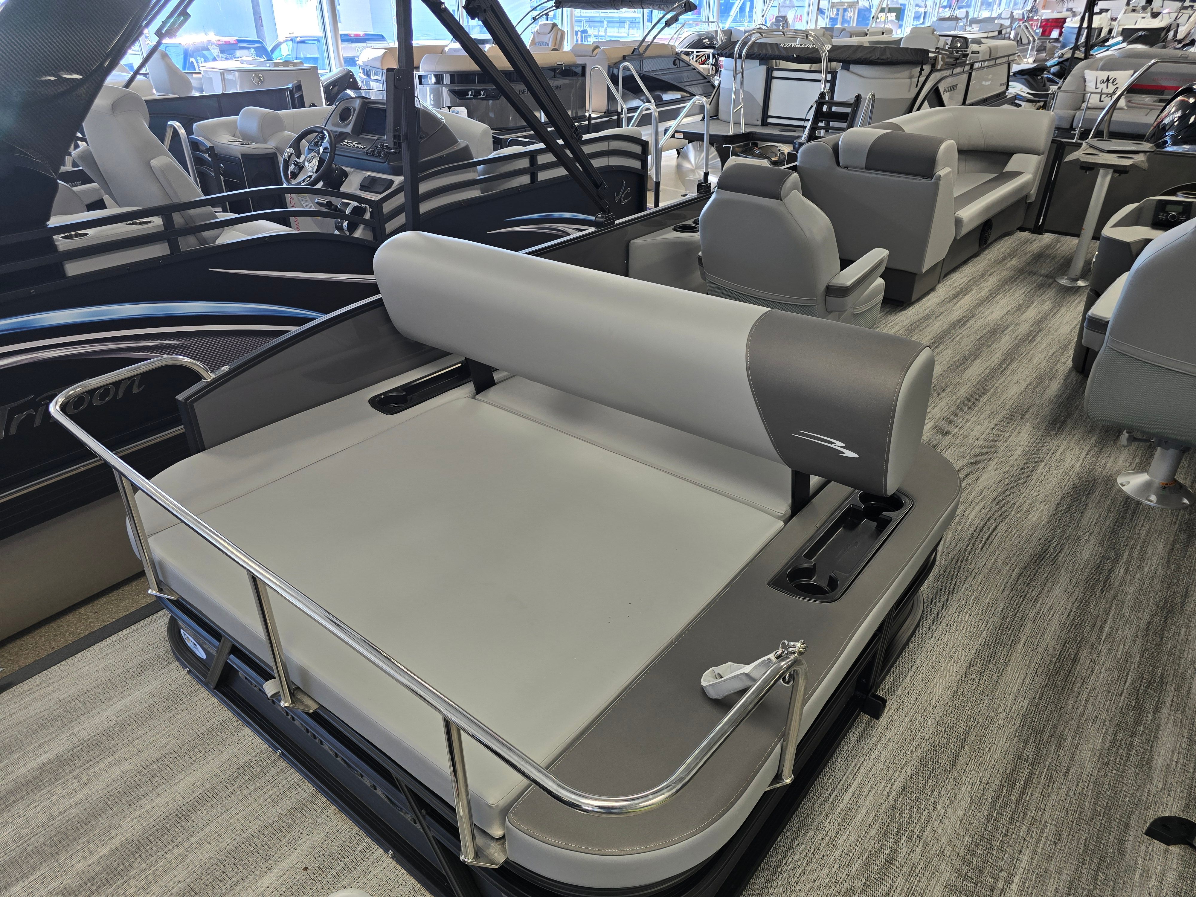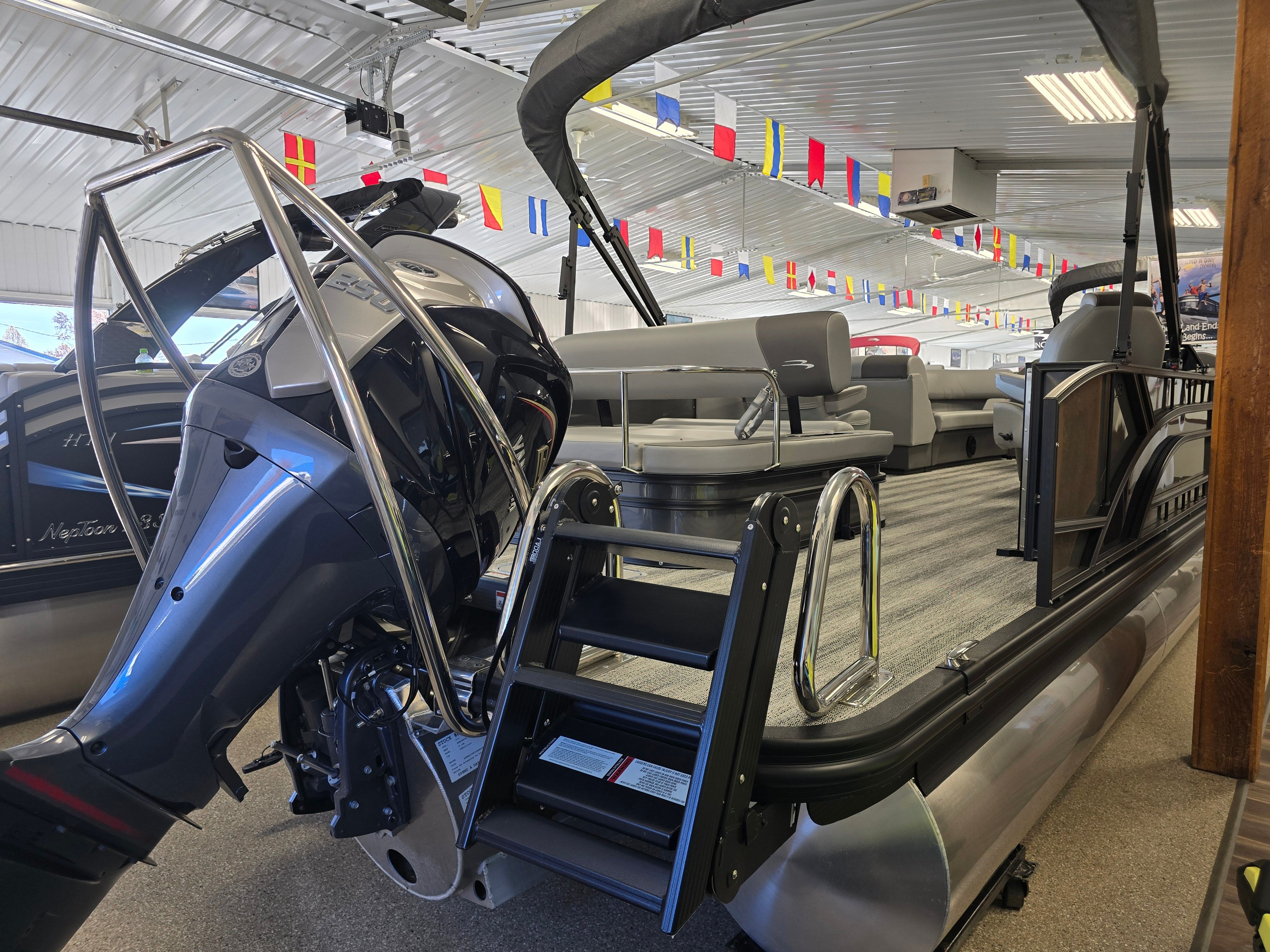 The 2025 Bennington 23 SSB SPS Plus is a brand-new pontoon boat that measures an impressive 22.33 feet in length. This spacious design provides ample room for family and friends, ensuring everyone can relax and enjoy the ride. With its sleek lines and contemporary color palette—featuring Shadow Grey and Carbon accents—this Bennington boat for sale stands out on any waterway. The modern aesthetic is further enhanced by blackout logos and smooth Ocean Blue accents, giving the boat a sophisticated and eye-catching appearance.