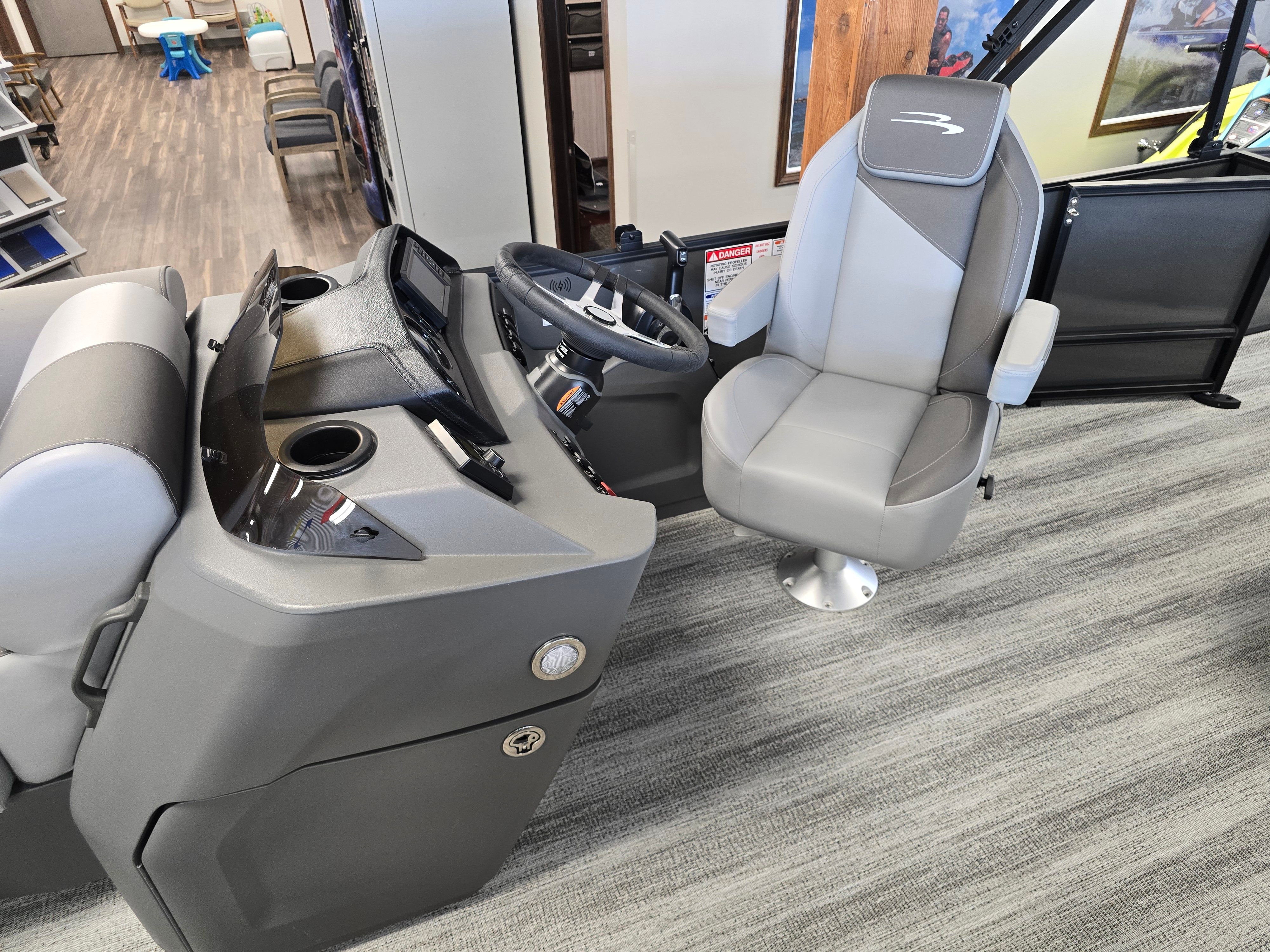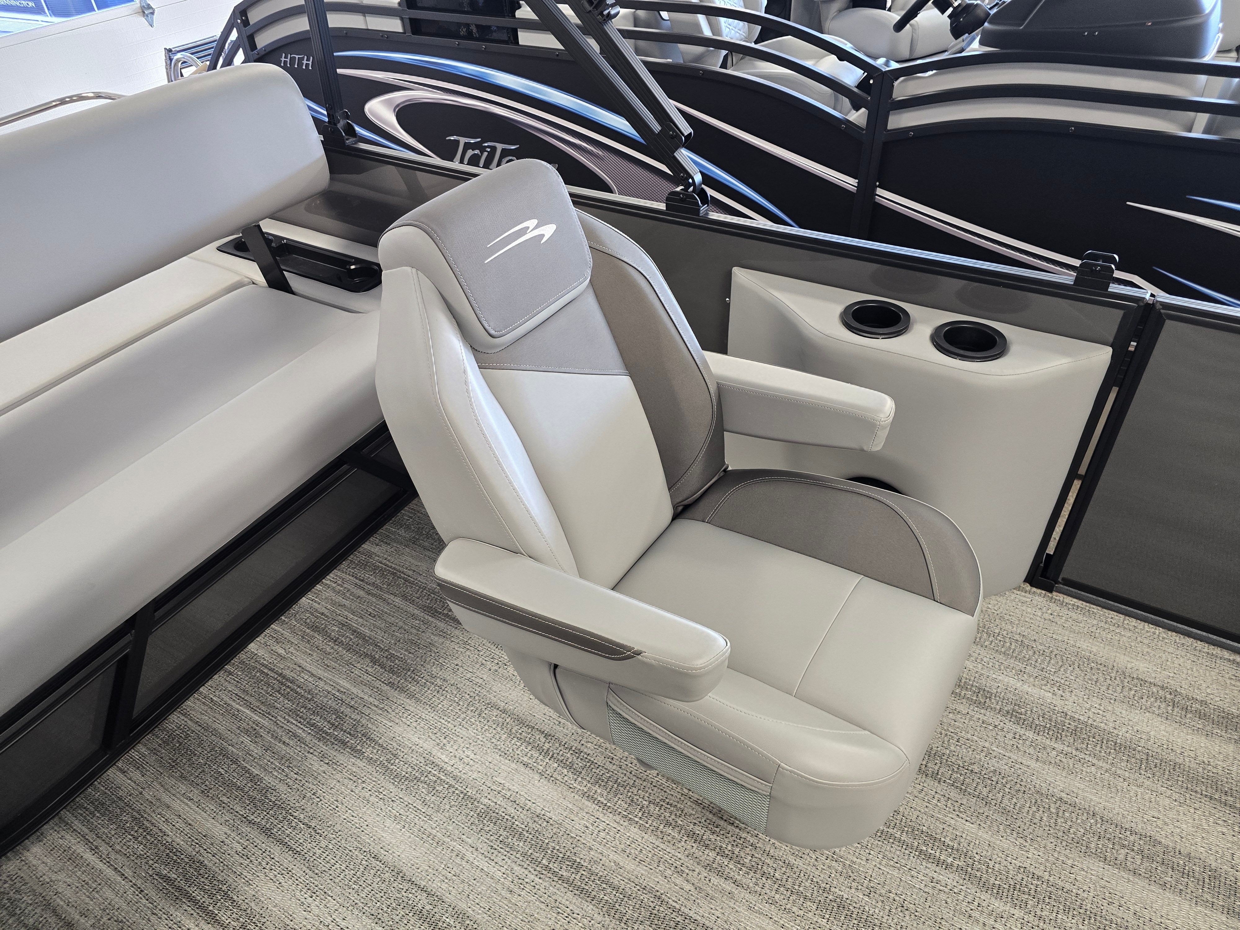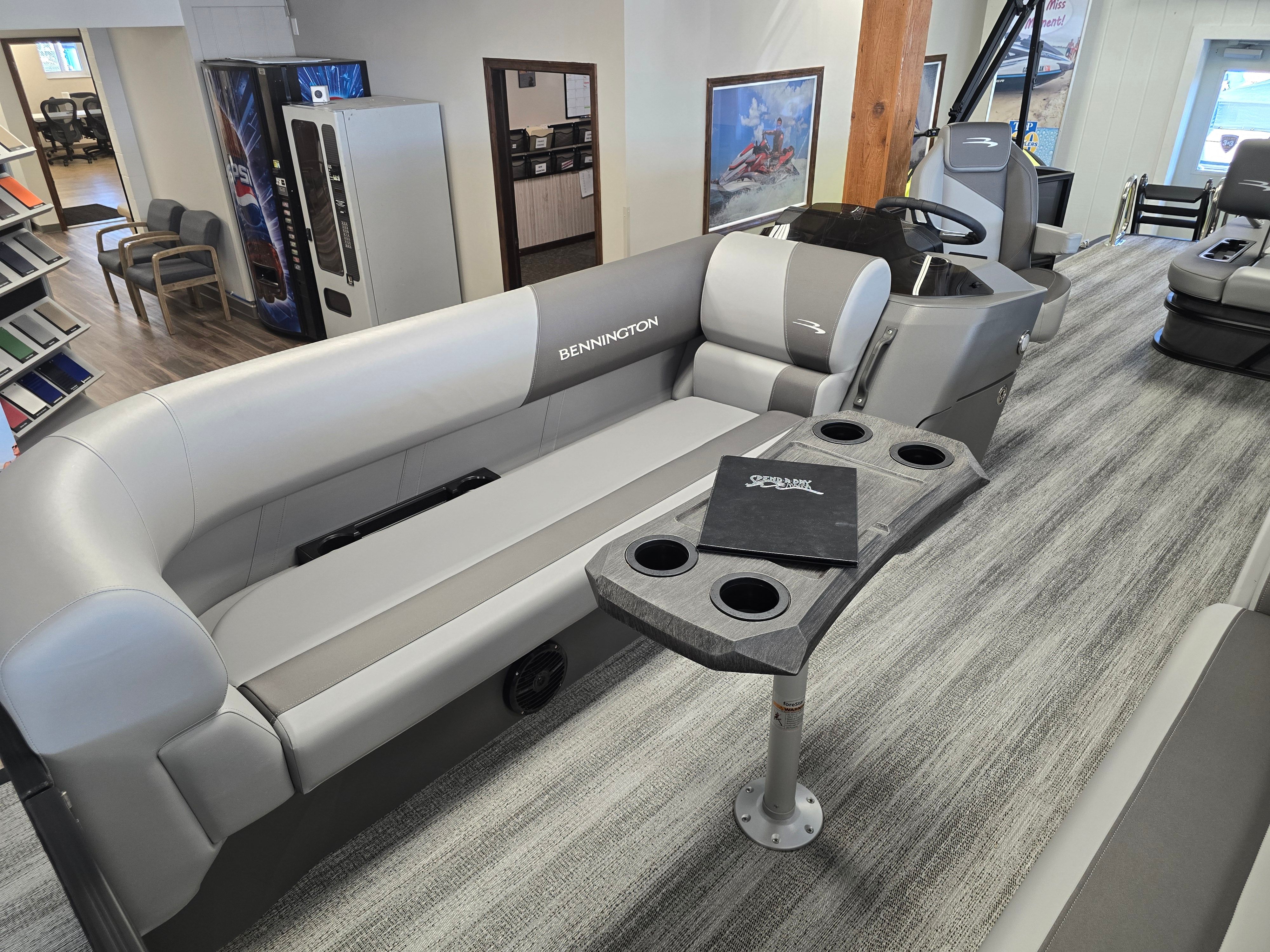 The Bennington 23 SSB SPS Plus is packed with premium features designed to enhance your boating experience. The Serene Soft Touch Vinyl with Simtex accents offers a luxurious and comfortable seating environment, perfect for long days on the water. The Shadow Grey base and Carbon accents create a modern, upscale look that is sure to impress. The single switch battery with fuse provides reliable power management, ensuring your boat’s electrical systems operate smoothly and safely. Blackout logos add a touch of elegance, while the smooth Ocean Blue accent brings a refreshing pop of color to the overall design.