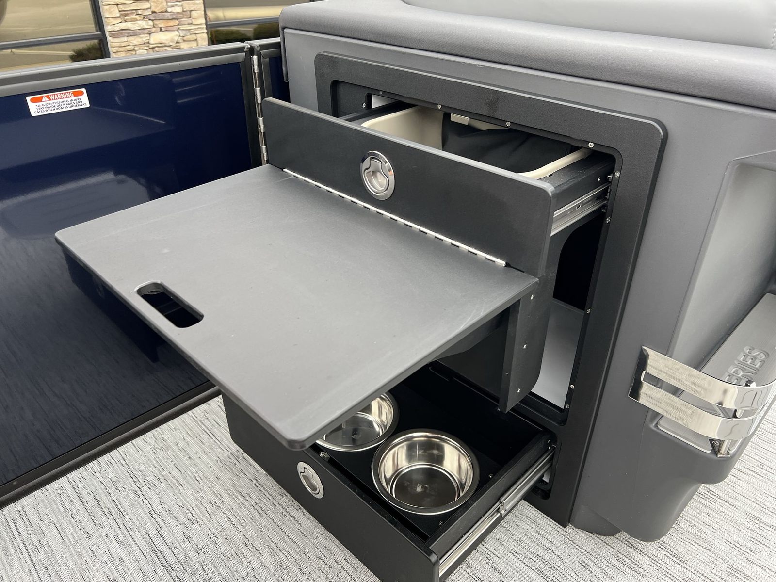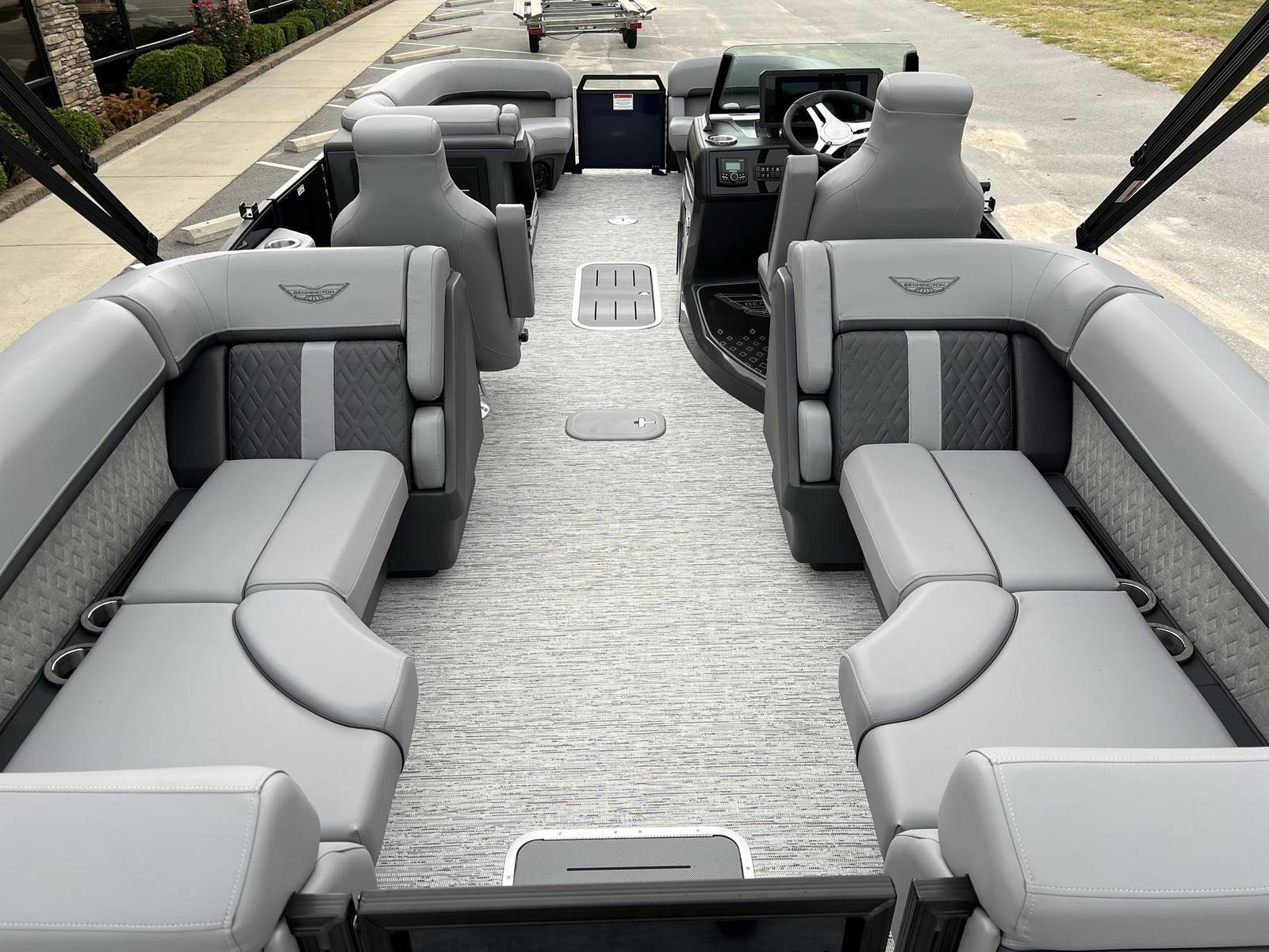 The 2026 Bennington 24 MFB ESP is packed with features that enhance both convenience and enjoyment. The 12 Button Digital Switching system puts control at your fingertips, allowing you to easily manage lighting, electronics, and other onboard systems. The Master Power feature ensures that your boat’s electrical systems are efficiently managed, while the horn adds an essential safety element for signaling on the water.For today’s connected lifestyle, the USBP Panel with Wireless Charging Dock keeps your devices powered up and ready for action. The Midnight Blue canvas not only complements the boat’s striking exterior but also provides shade and protection from the elements. The Veneto Graphite vinyl base offers a luxurious, comfortable seating experience, while the Black Logos and Blackout Luxe Package add a modern, upscale touch to the overall design.