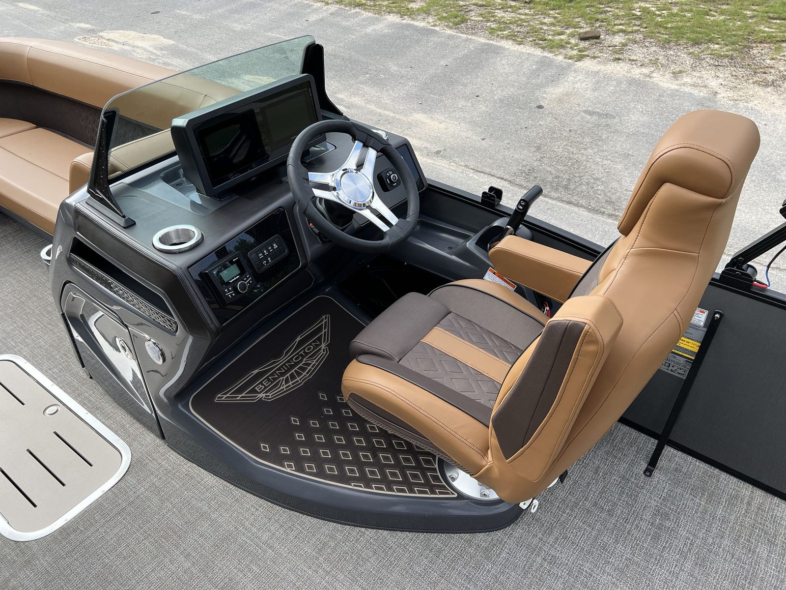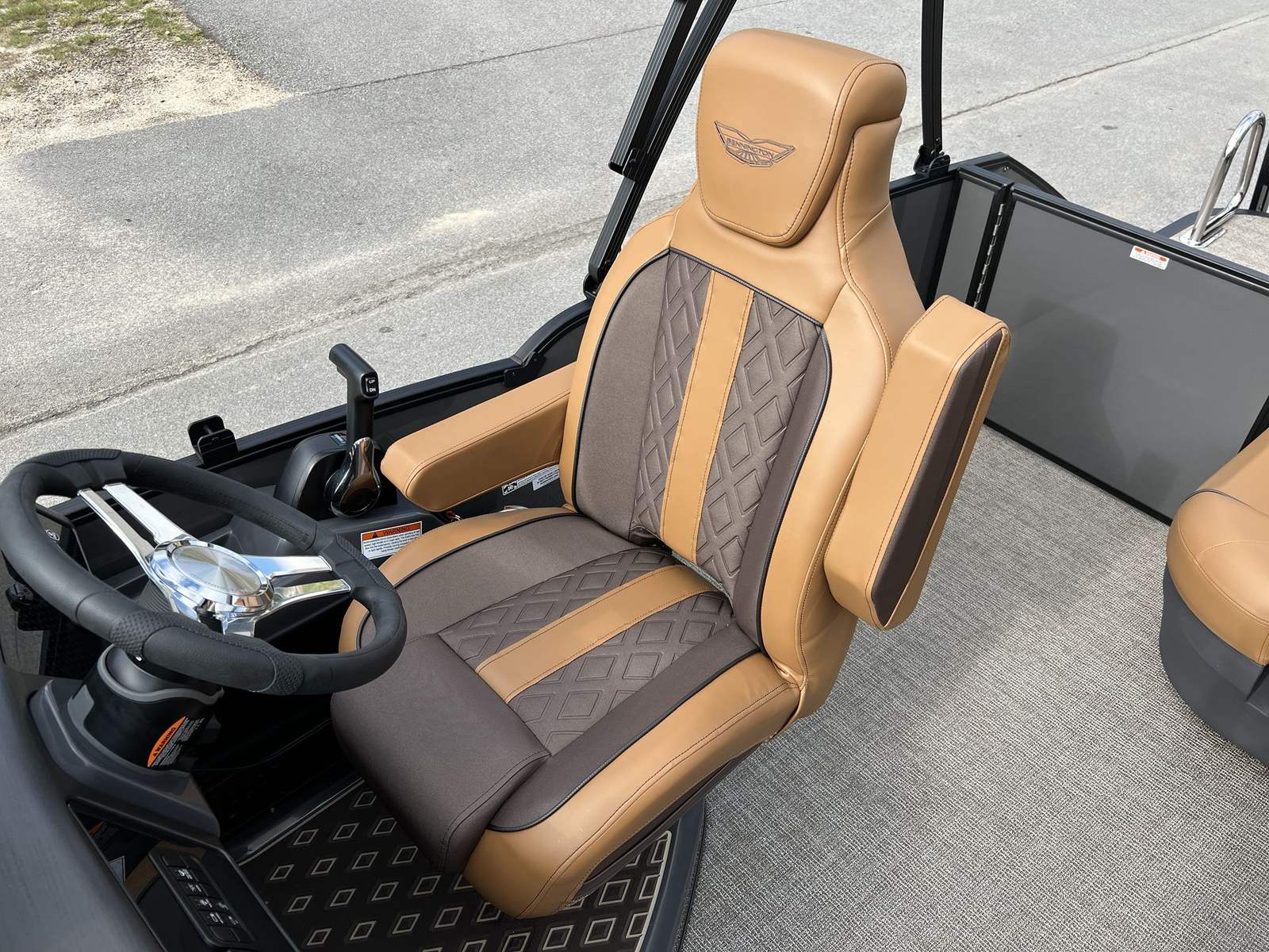 This pontoon boat is packed with special features designed to enhance your time on the water. The single switch battery system offers convenience and peace of mind, ensuring your boat is always ready to go. The RGB Control M Series allows you to customize the lighting ambiance, creating the perfect mood for any occasion. Exterior side lighting and toekick lights (2-62") not only add a touch of elegance but also improve visibility and safety during evening outings.For music lovers, the Rockford Fosgate M1 lighted speakers deliver premium sound quality, turning every cruise into a floating party. The elevated console with pocket Mythos provides an ergonomic and stylish command center, while the base furniture M Series ensures maximum comfort for all passengers. The interior is finished with Zebrawood Matte Beige accents, adding a sophisticated and contemporary touch to the overall design.