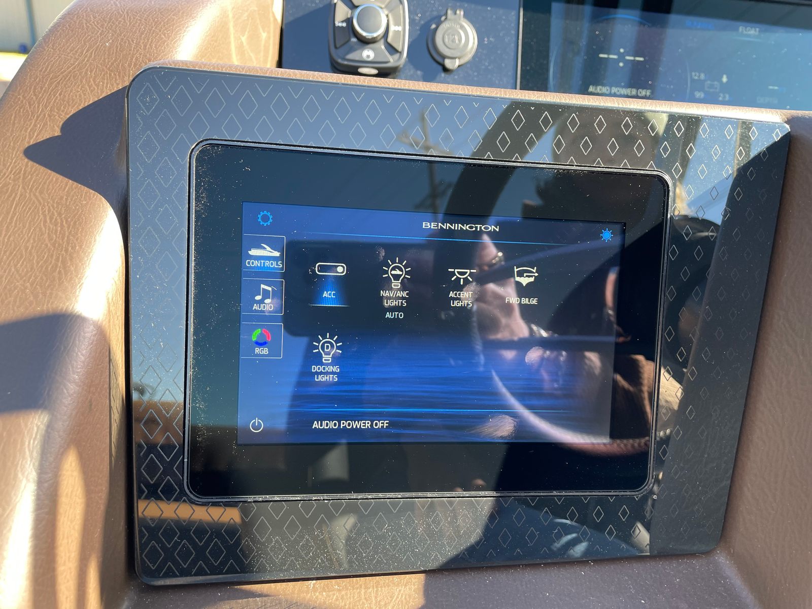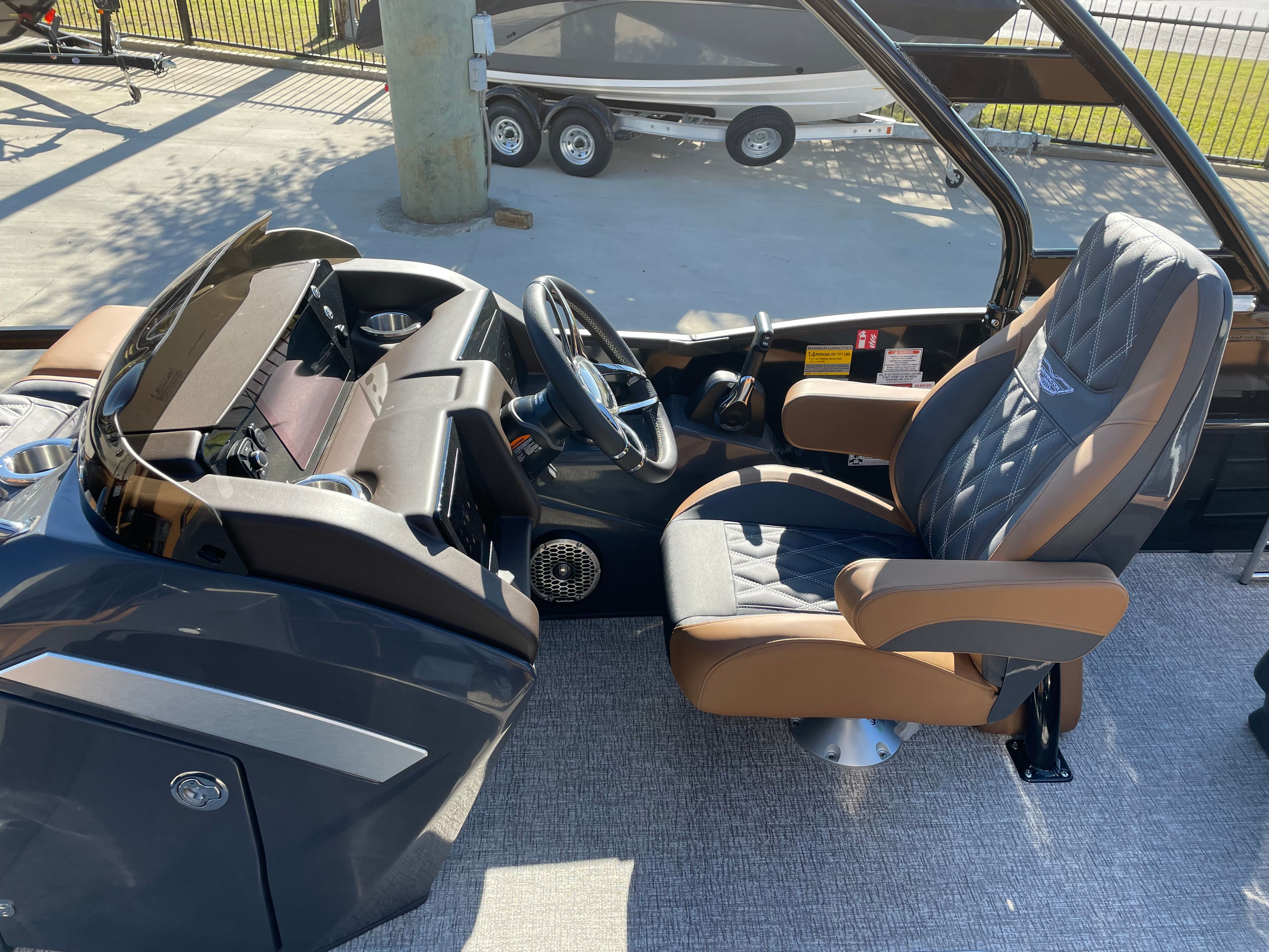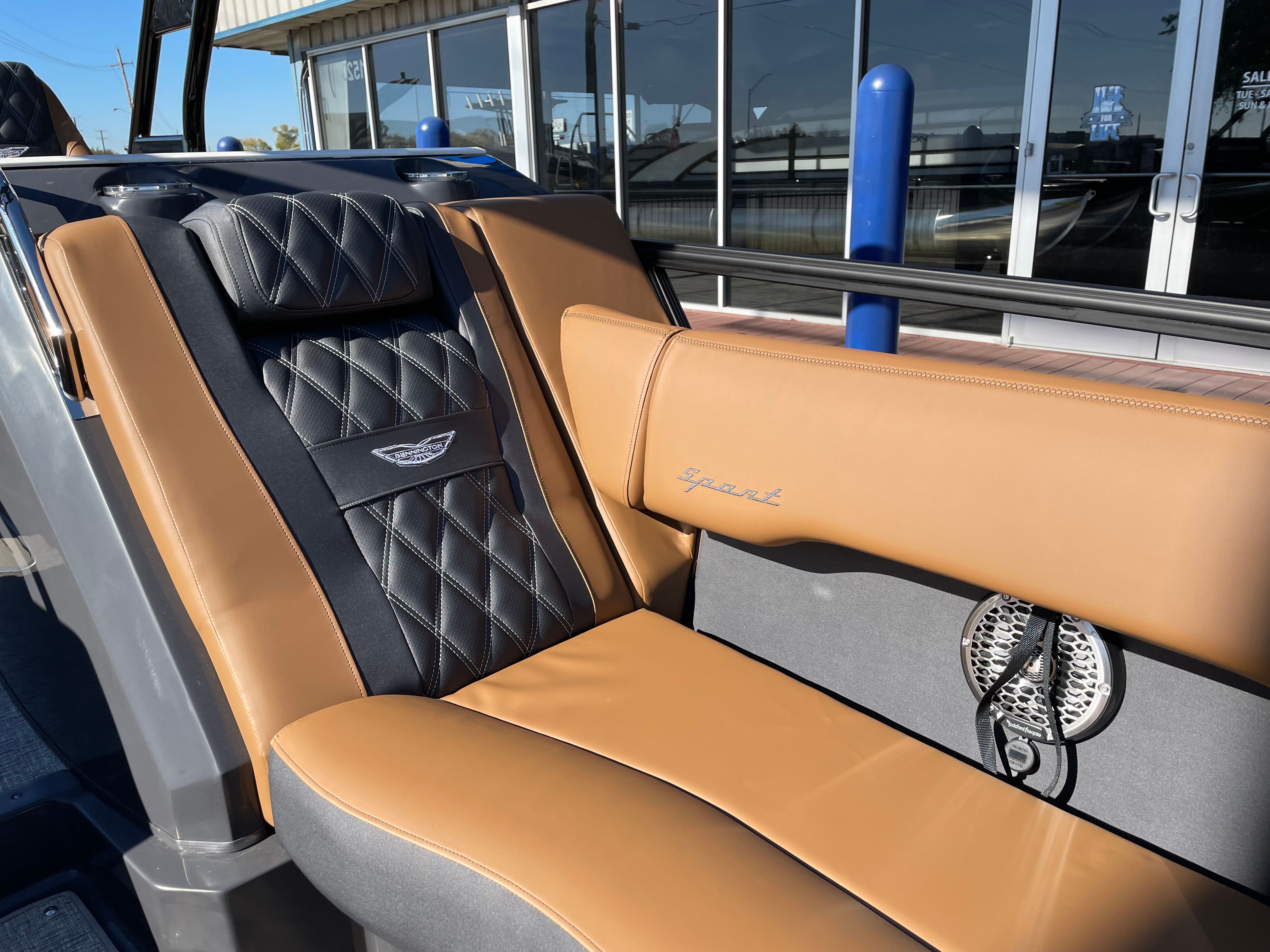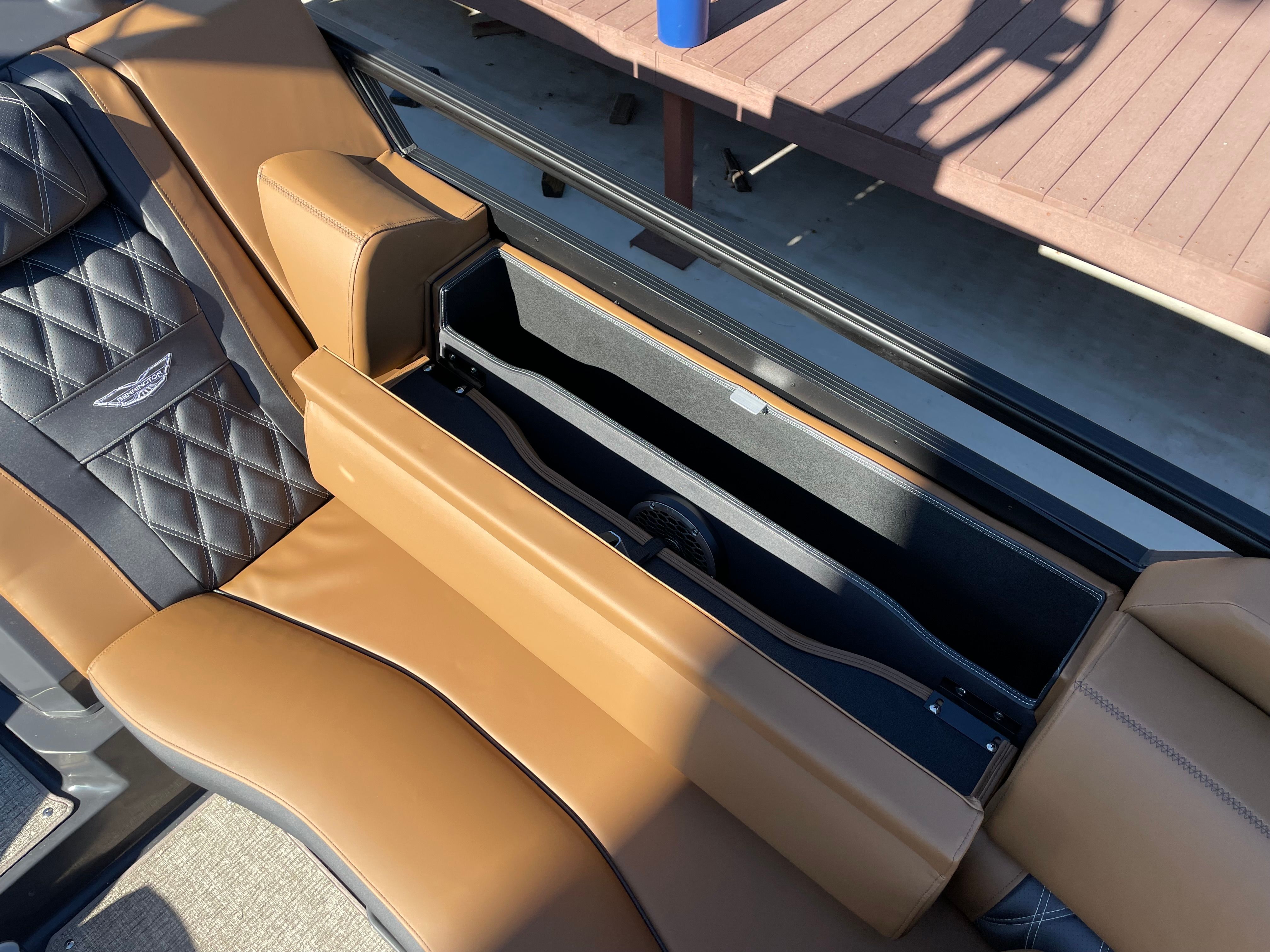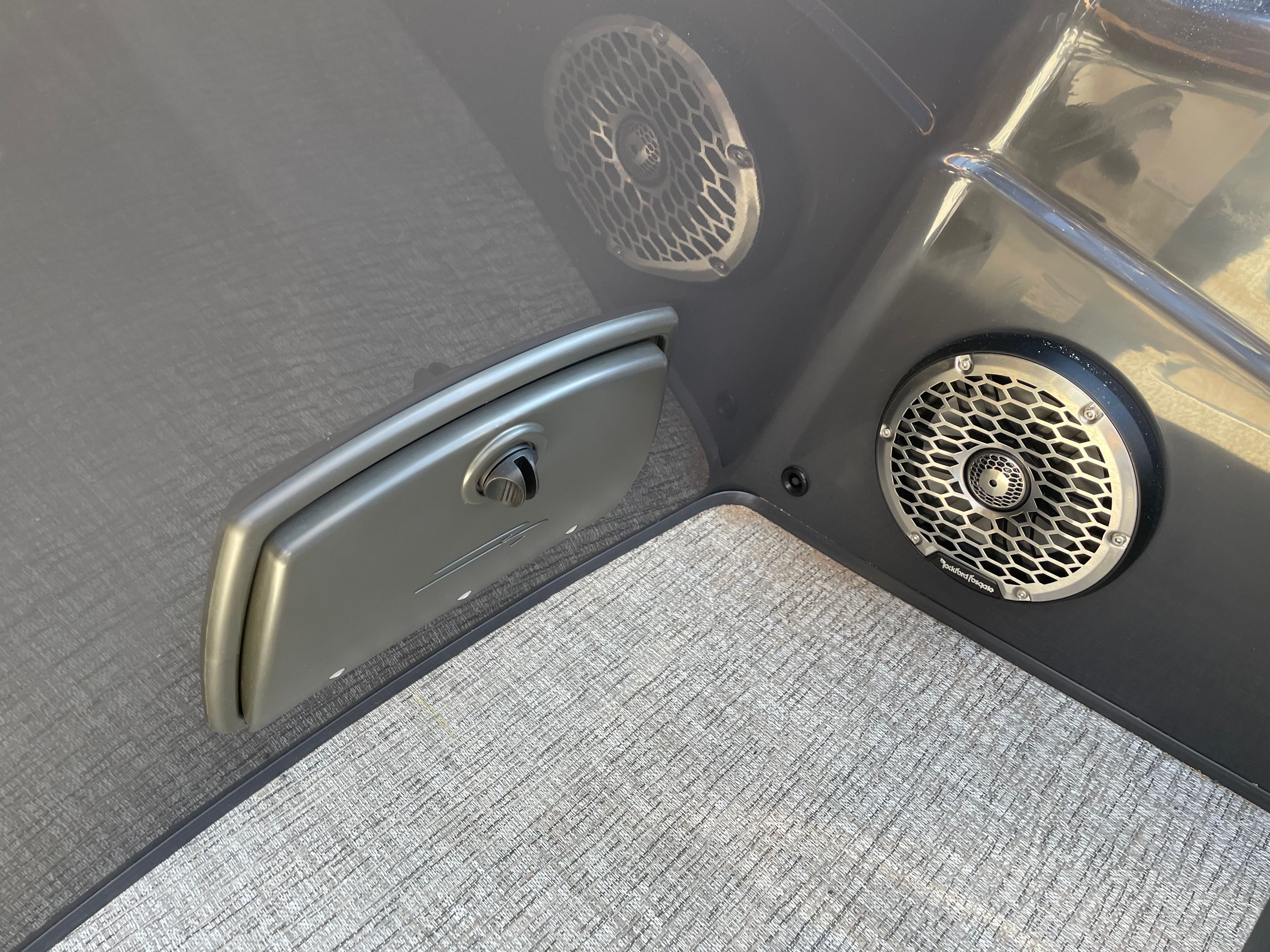The Bennington 24 Rtsba V is loaded with special features designed to elevate your boating experience. Nine illuminated cupholders are strategically placed throughout the deck, ensuring your favorite beverages are always within reach, day or night. Exterior side lighting and toekick lights (2-72" 2-Bwrdr) create a captivating ambiance, perfect for evening cruises or dockside gatherings. The blackout logos add a touch of modern elegance, distinguishing this pontoon from the crowd.Music lovers will be thrilled with the premium Rockford Fosgate audio system, which includes two 8" M2 Arch Can Speakers, a powerful 10" M1 Subwoofer, and a dual M2 amplifier upgrade. The Rockford Fosgate PMX-1R Head Unit Remote, complete with Sirius Satellite Radio, ensures you have access to your favorite playlists and stations wherever your journey takes you. These features combine to create an immersive sound experience, transforming every trip into a floating concert.