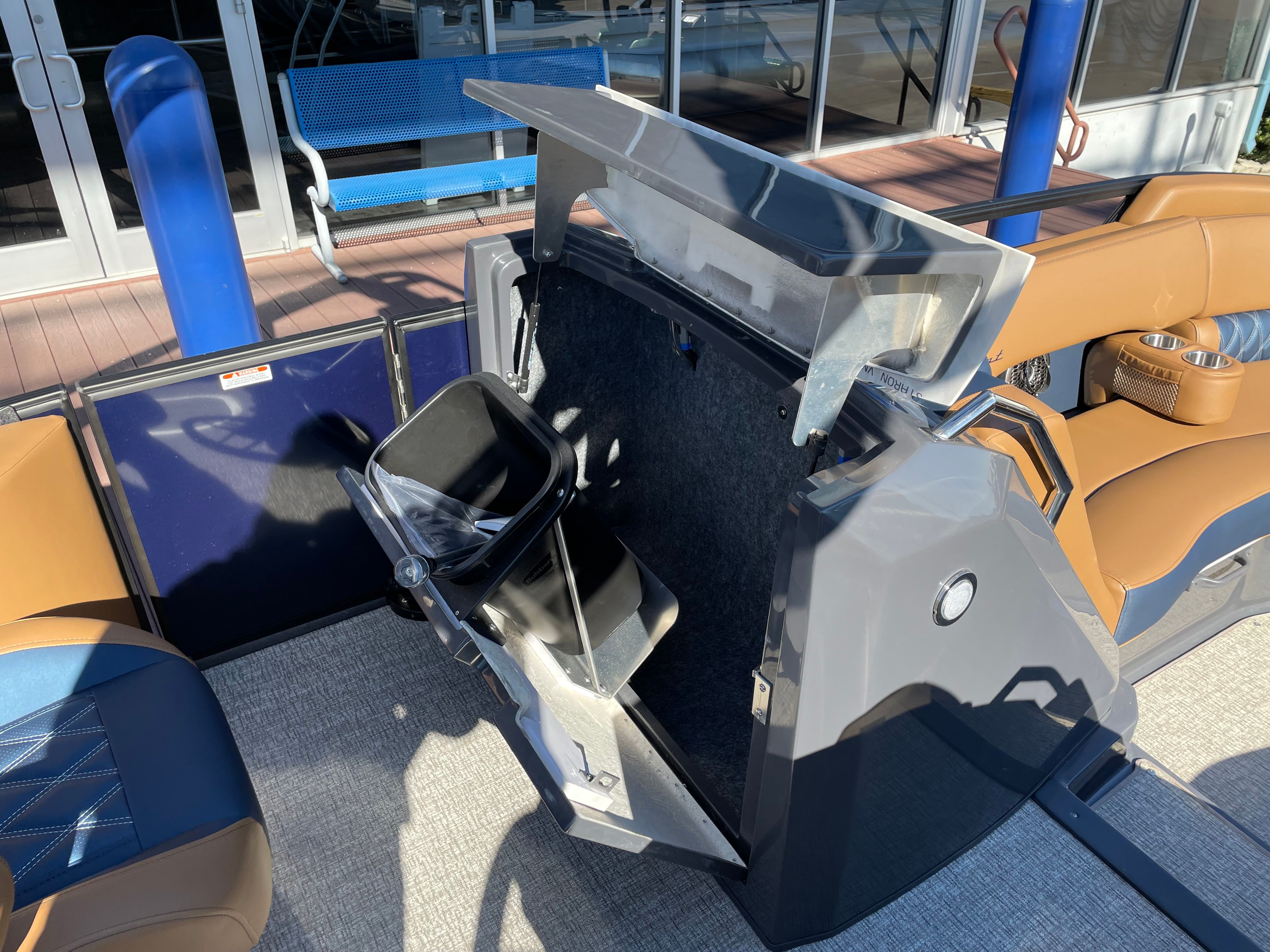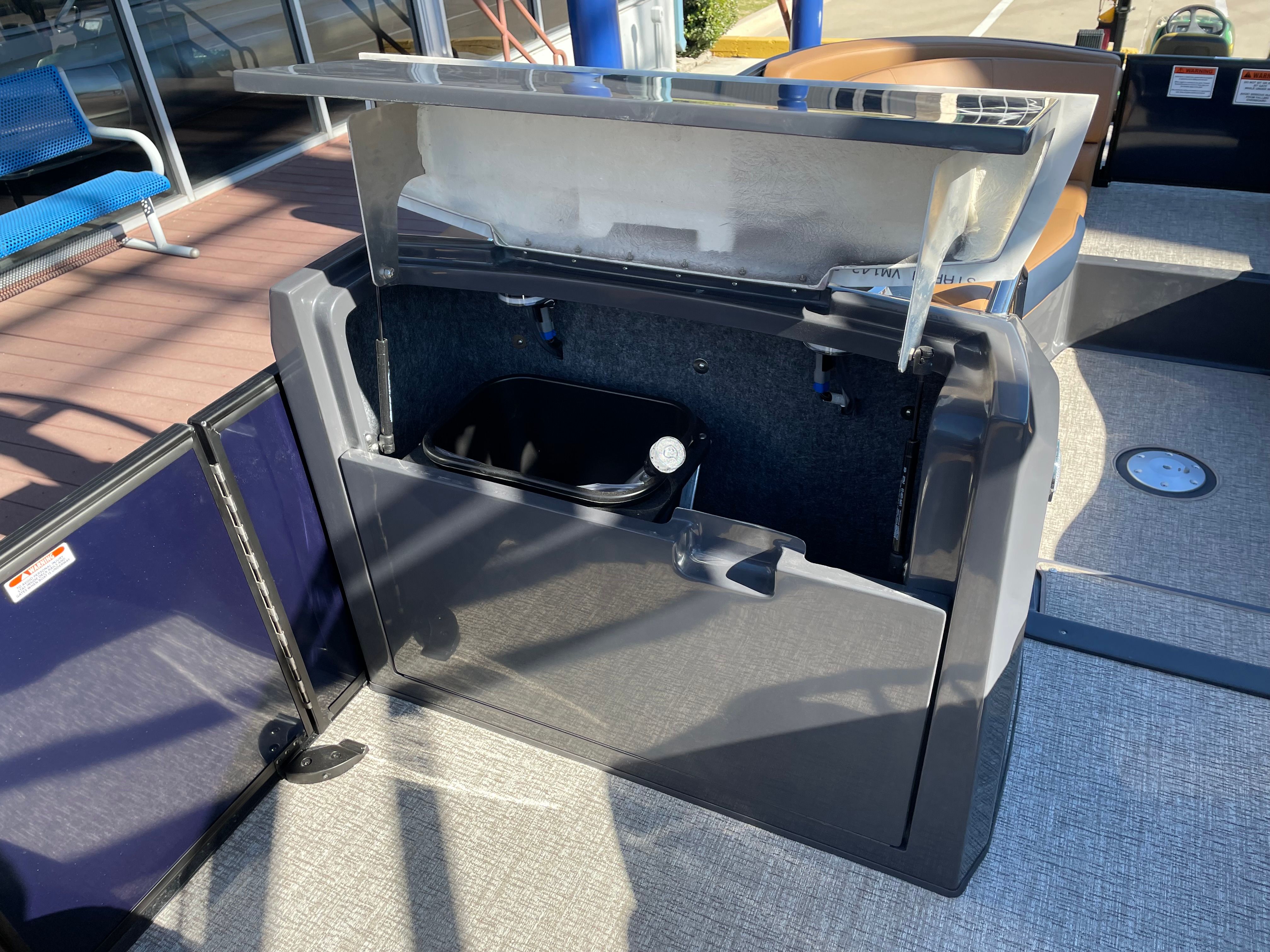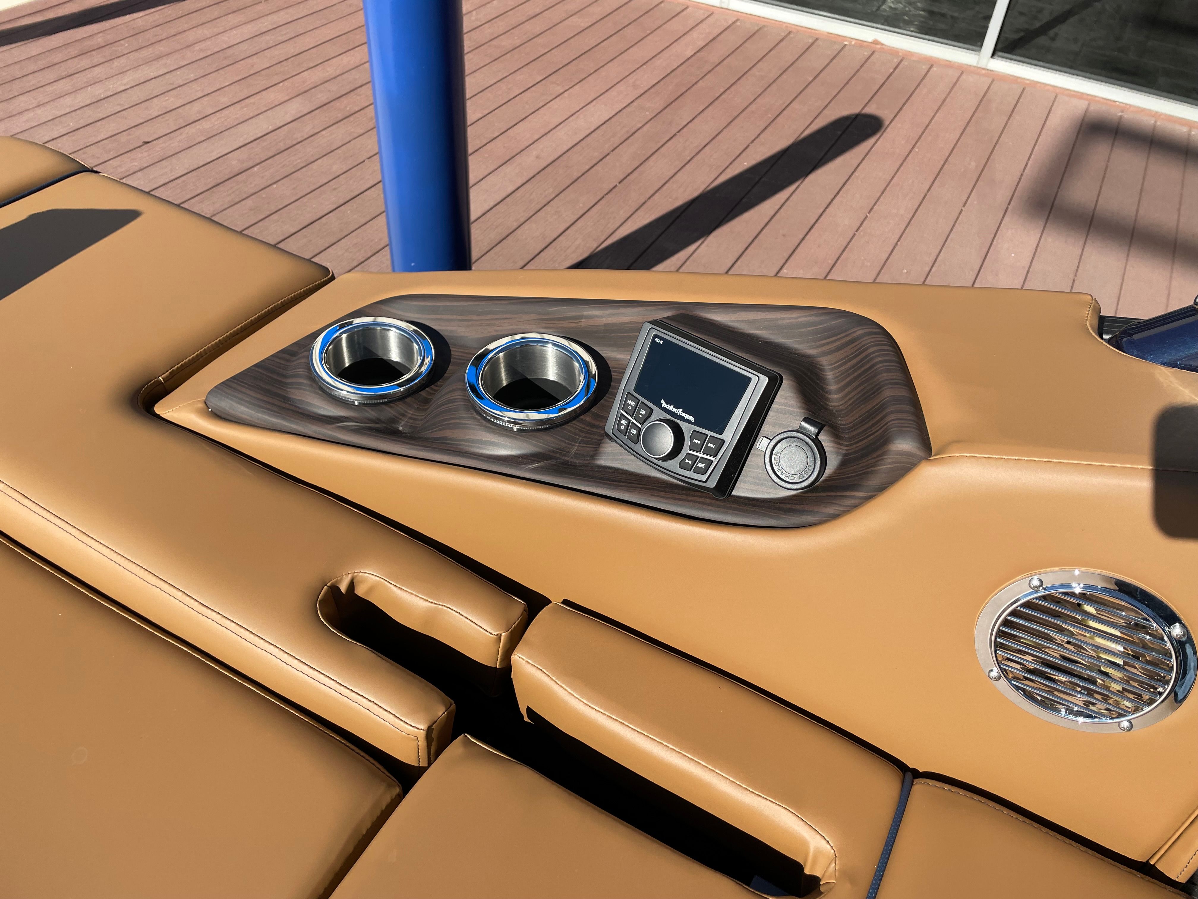The Bennington 24 Rtsba V is loaded with features that elevate your time on the water. Nine illuminated cupholders are strategically placed throughout the deck, ensuring your favorite beverages are always within reach, day or night. The exterior side lighting and toekick lights (2-72" 2-Bwrdr) create a captivating ambiance after sunset, enhancing both safety and style. Blackout logos add a touch of sophistication, while the premium Rockford Fosgate audio system transforms your pontoon into a floating entertainment hub. Enjoy crystal-clear sound from the two 8" M2 Arch Can Speakers, a booming 10" M1 Subwoofer, and the dual M2 amplifier upgrade. The Rockford Fosgate PMX-1R Head Unit Remote with Sirius Satellite Radio ensures you have access to your favorite music and channels wherever your adventures take you.