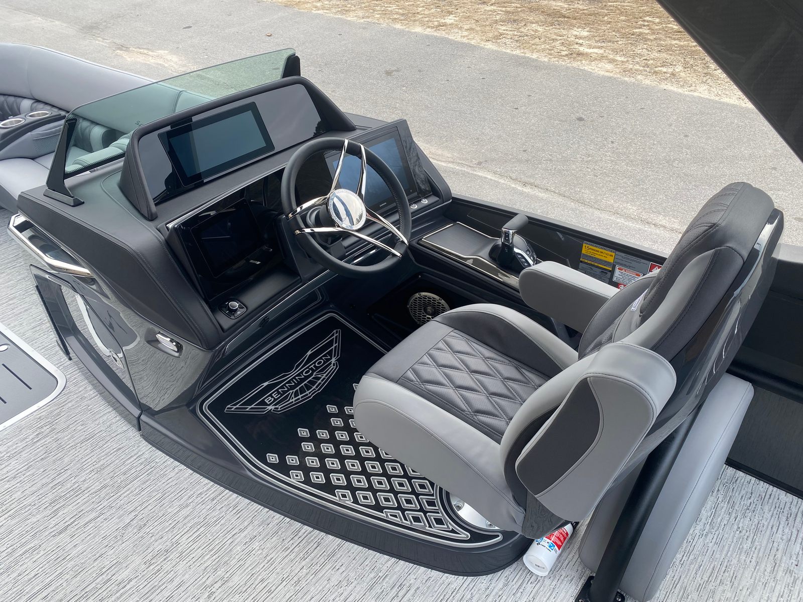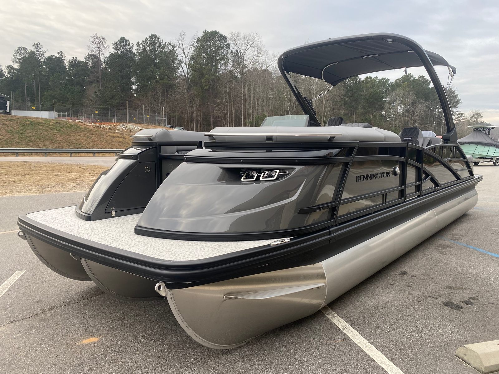 The 2026 Bennington 25 Qsba ESP is a brand-new pontoon boat that stretches an impressive 28.25 feet in length, offering ample space for relaxation, socializing, and fun. With its sleek lines, modern design, and attention to detail, this Bennington pontoon stands out on any lake or river. The Midnight Black canvas and blackout logos create a sophisticated, head-turning profile, while the Zebrawood Matte Slate accents add a touch of refined elegance to the overall aesthetic.