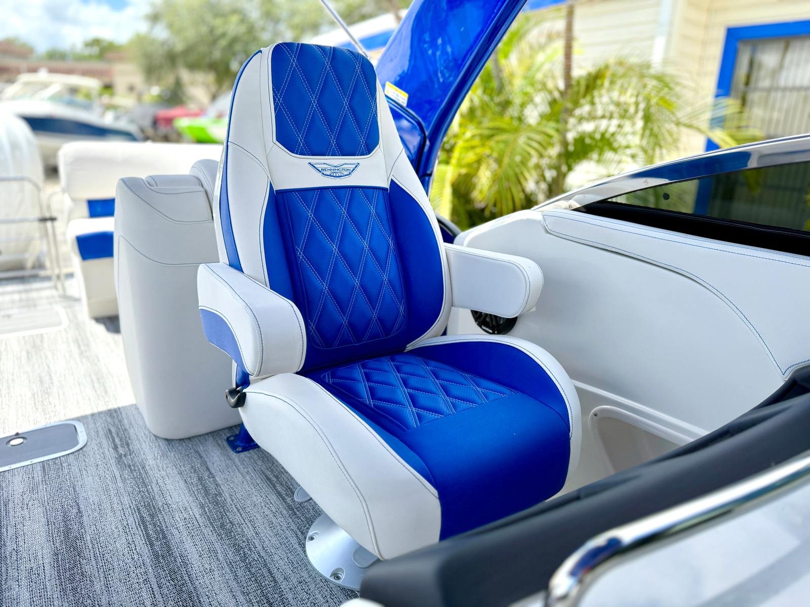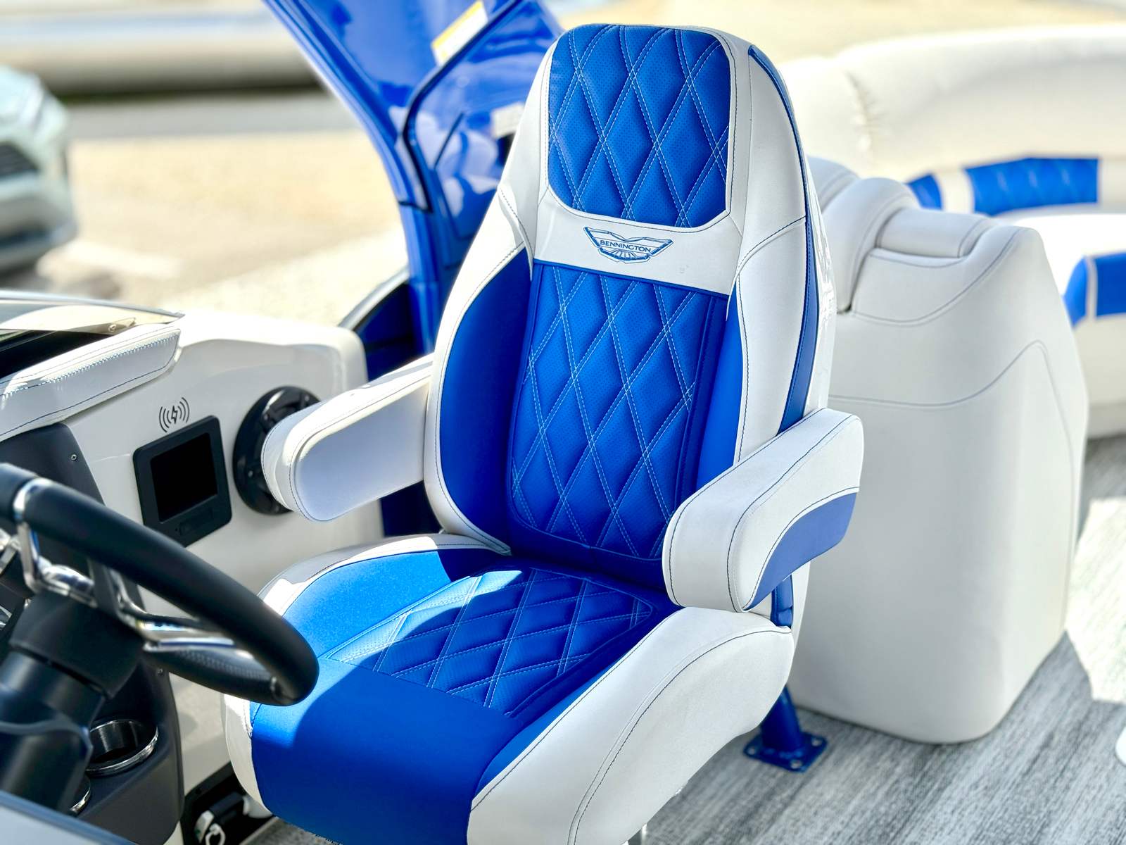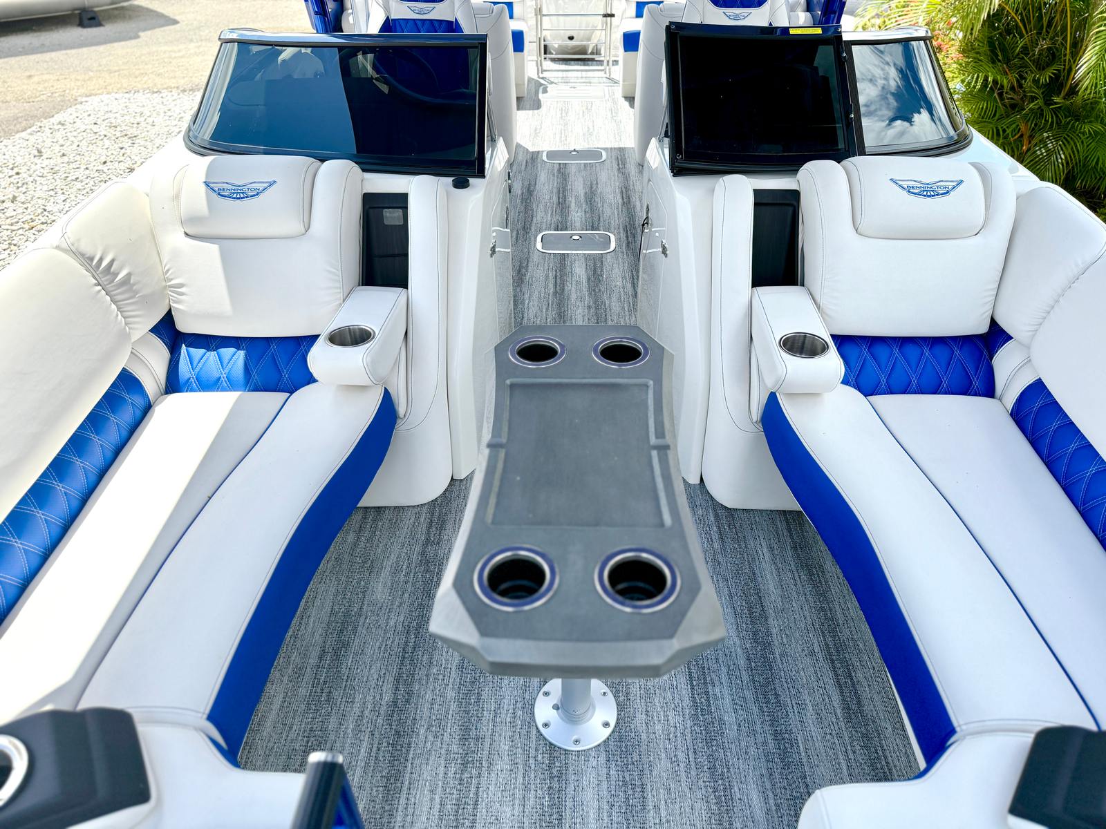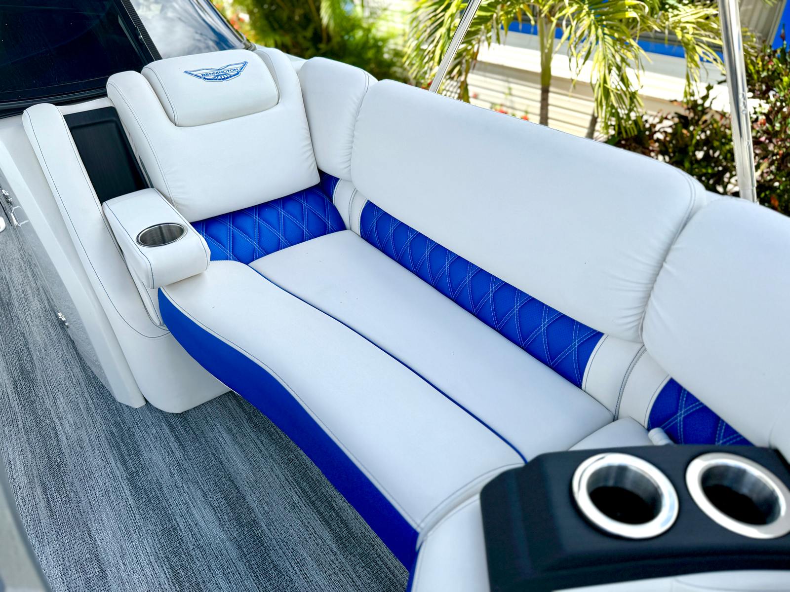 This Bennington pontoon boat for sale is packed with special features designed to enhance both aesthetics and functionality. The RGB Toe Kick Lighting creates a vibrant and customizable ambiance, perfect for evening cruises and celebrations. Nine illuminated cupholders ensure that refreshments are always within reach, while exterior side lighting and underwater lighting add a dramatic flair and improved visibility. The Blackout Logos and Arctic Ice White finish give the boat a modern, sophisticated look that turns heads at every dock. Inside, the Zebrawood Matte Slate accents and base Pillowtop Diamond Stitched Upholstery provide a luxurious touch, ensuring that every passenger enjoys supreme comfort and style.