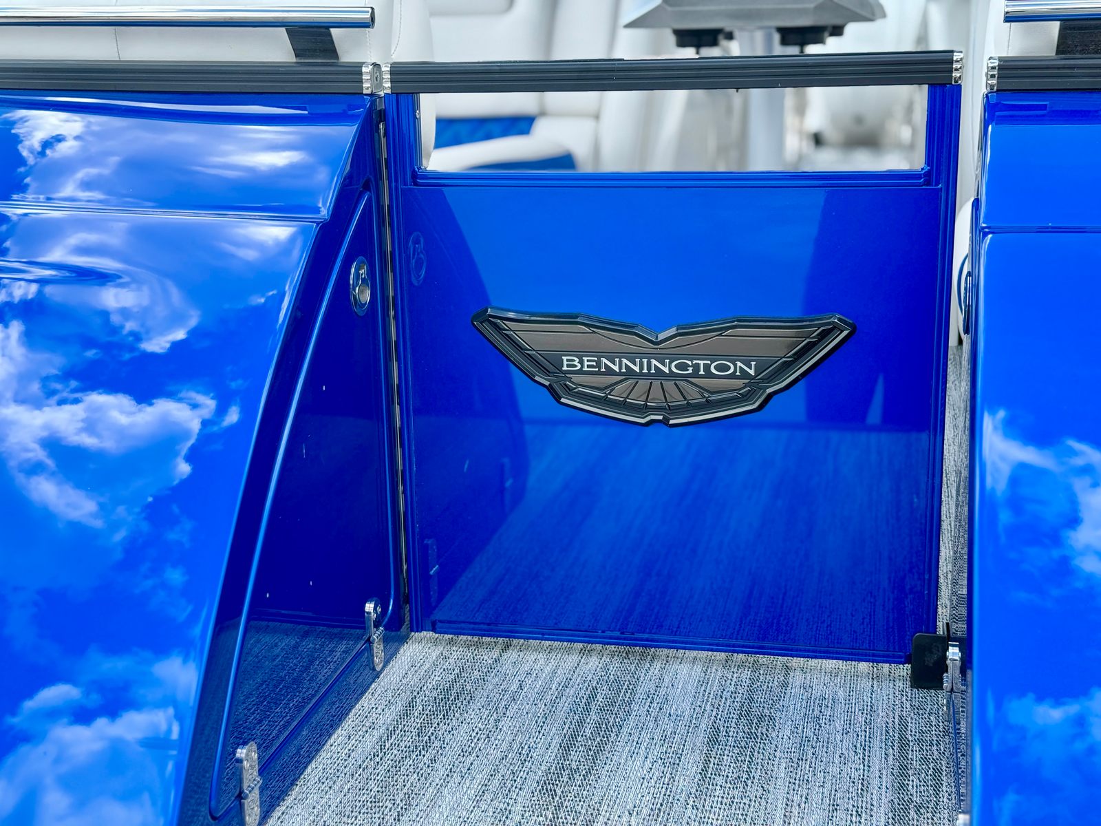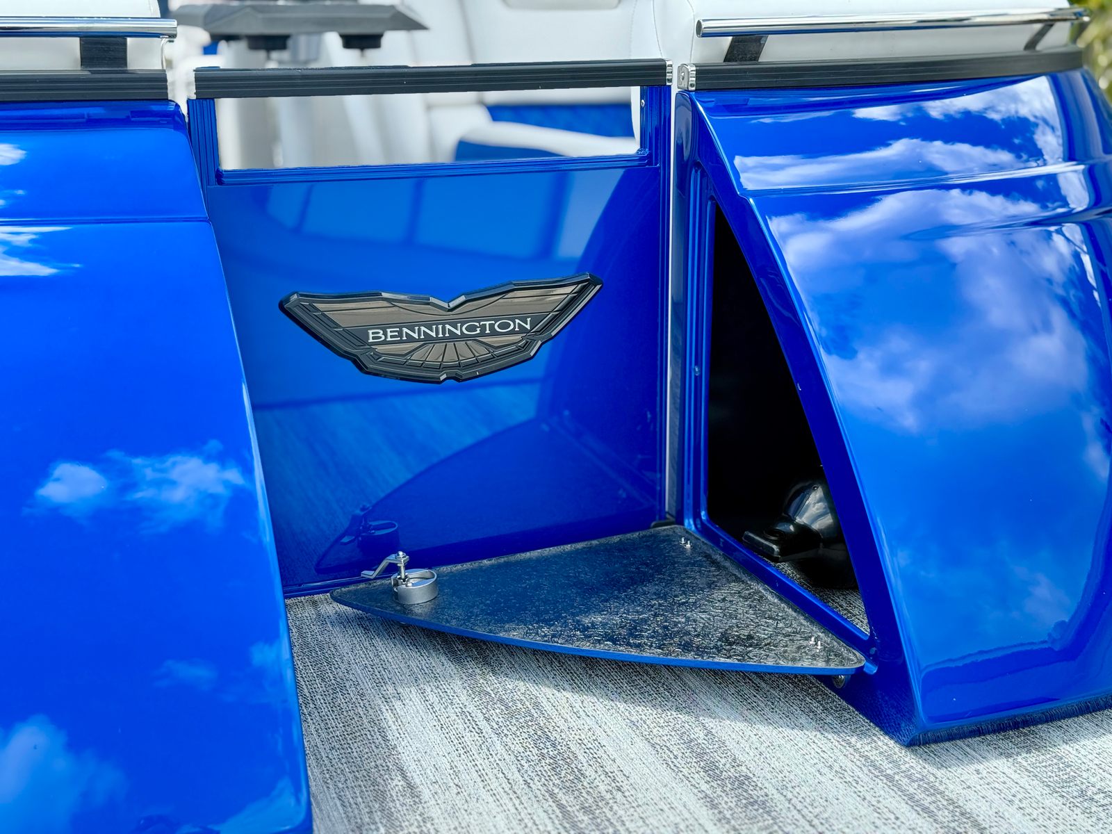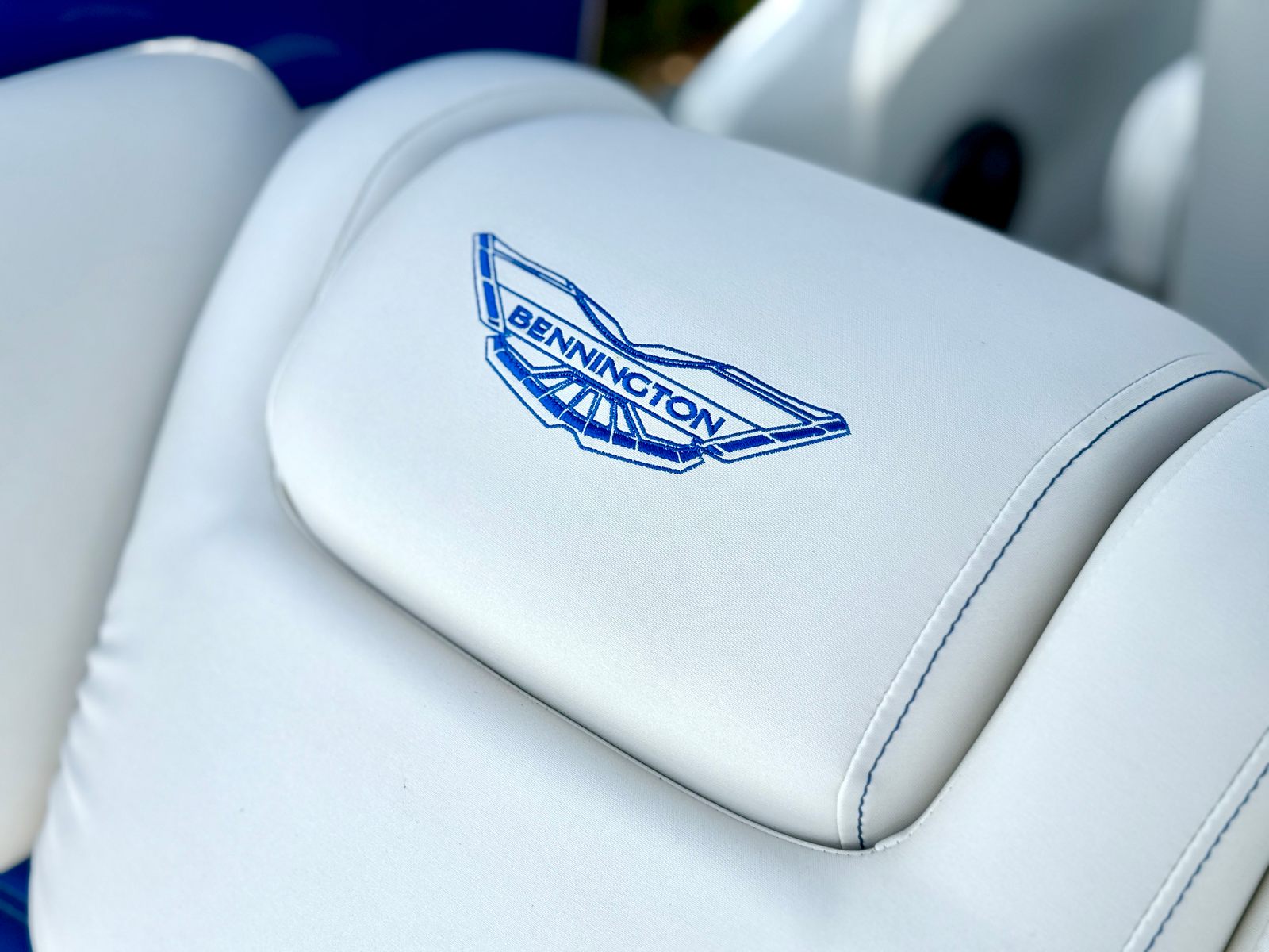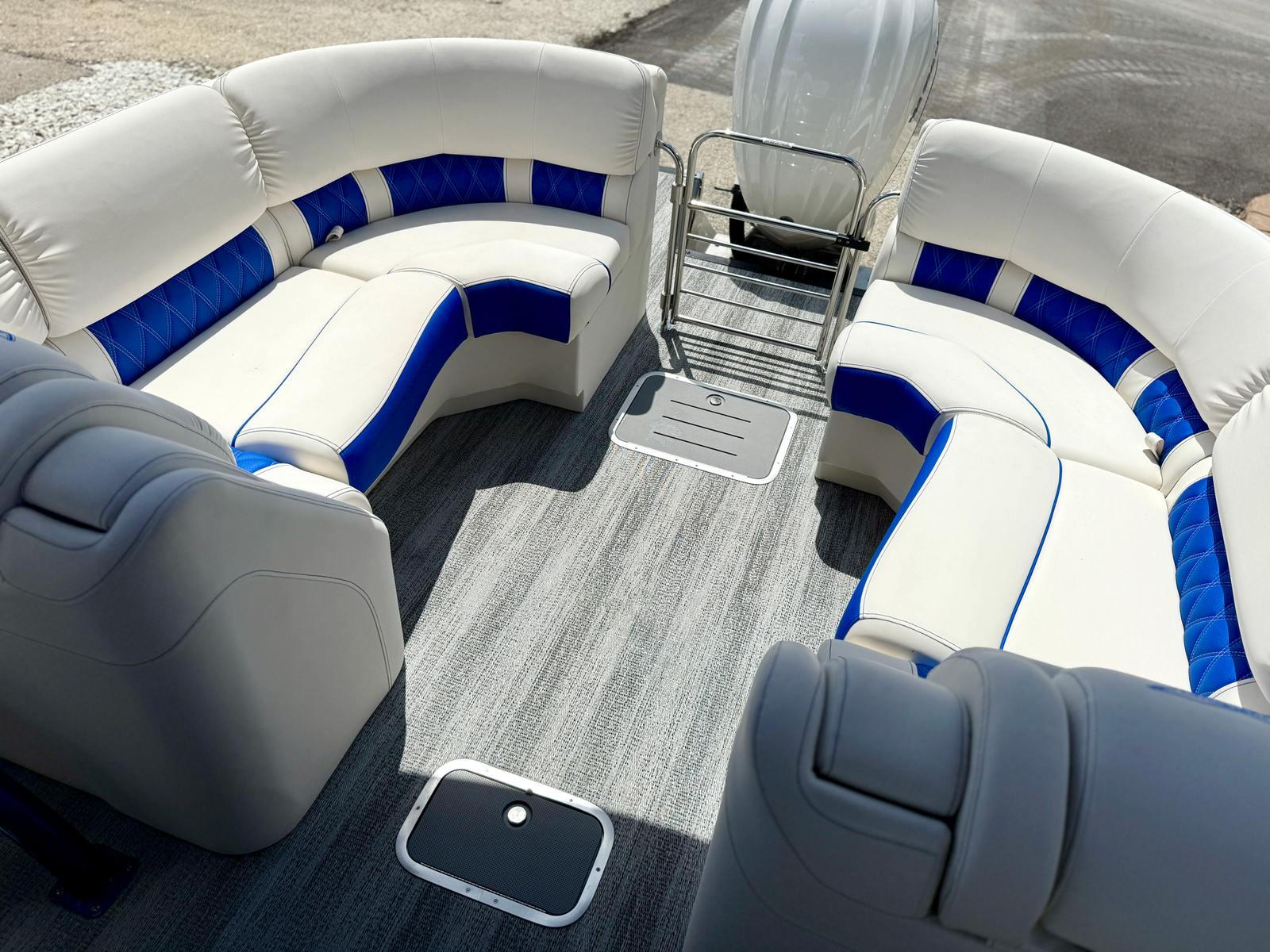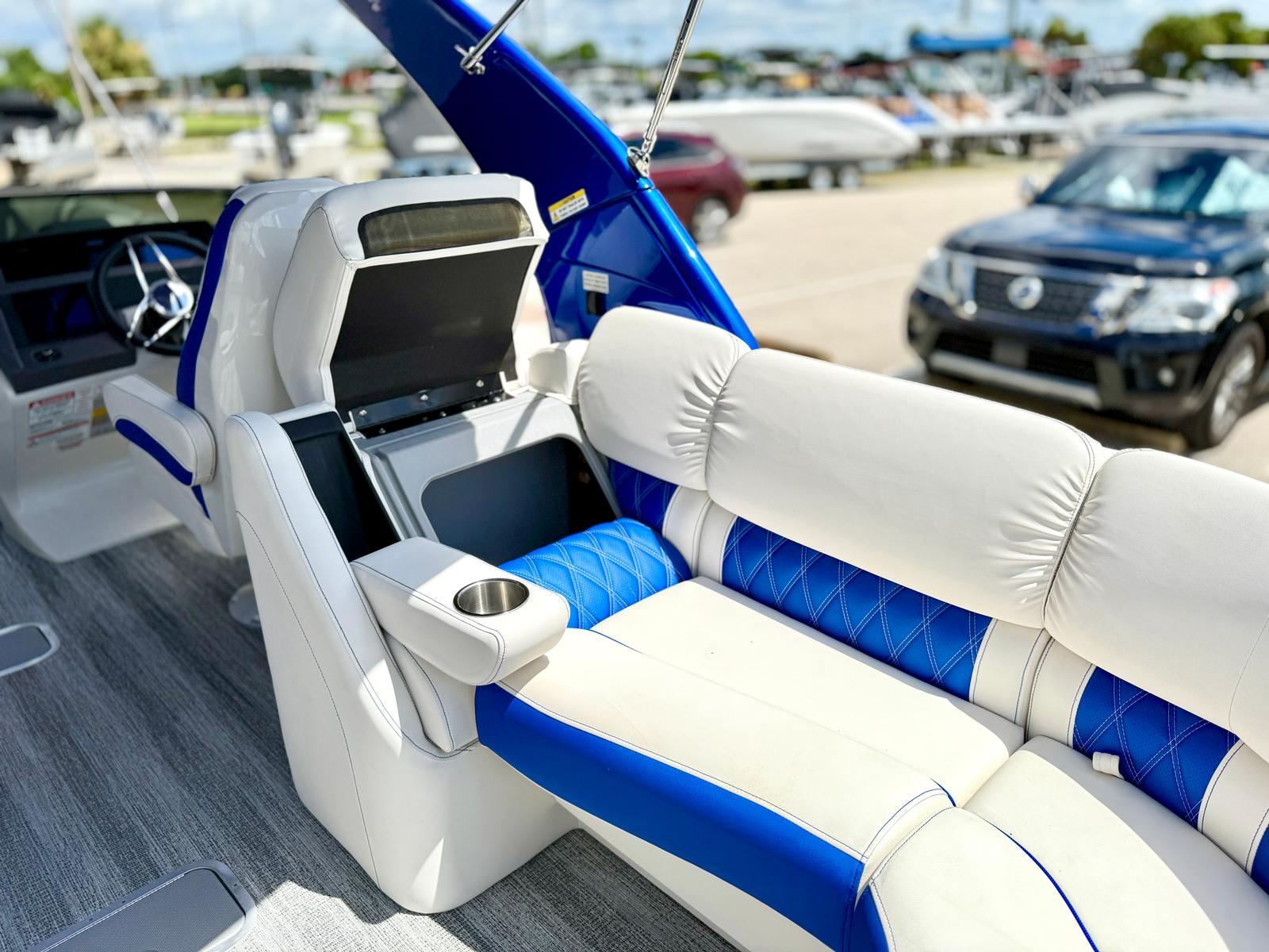 This Bennington pontoon boat for sale is packed with special features designed to enhance both aesthetics and functionality. The RGB Toe Kick Lighting creates a vibrant and customizable ambiance, perfect for evening cruises and celebrations. Nine illuminated cupholders ensure that refreshments are always within reach, while exterior side lighting and underwater lighting add a dramatic flair and improved visibility. The Blackout Logos and Arctic Ice White finish give the boat a modern, sophisticated look that turns heads at every dock. Inside, the Zebrawood Matte Slate accents and base Pillowtop Diamond Stitched Upholstery provide a luxurious touch, ensuring that every passenger enjoys supreme comfort and style.