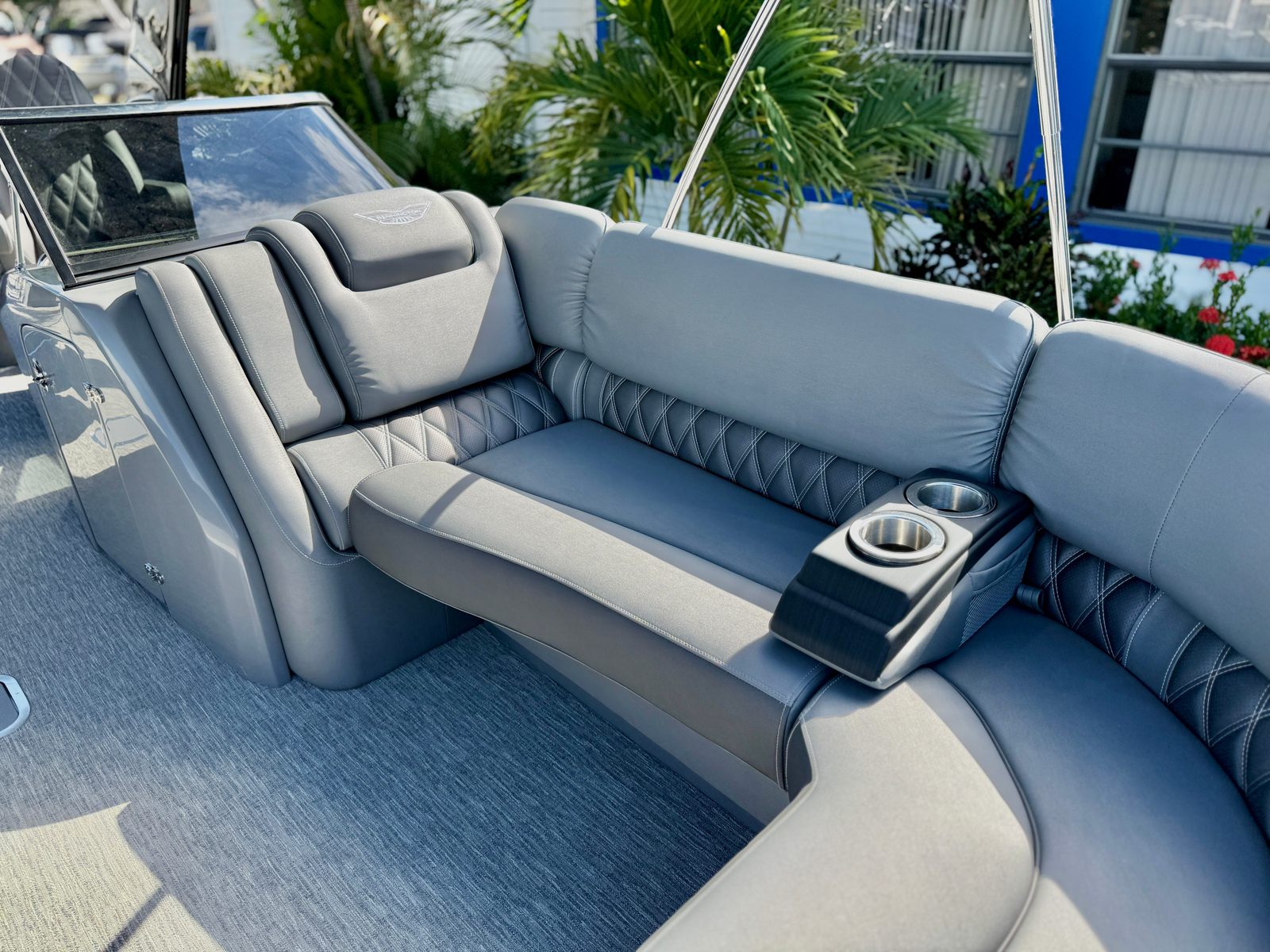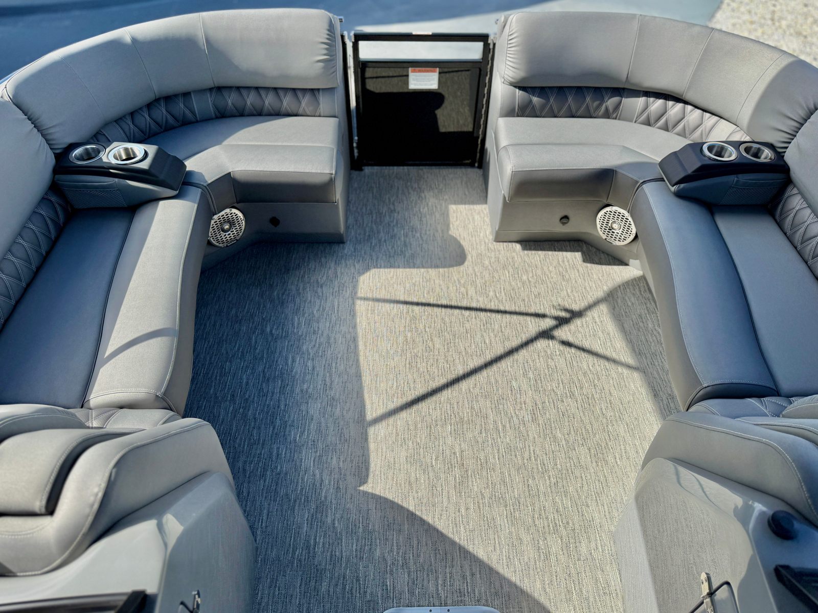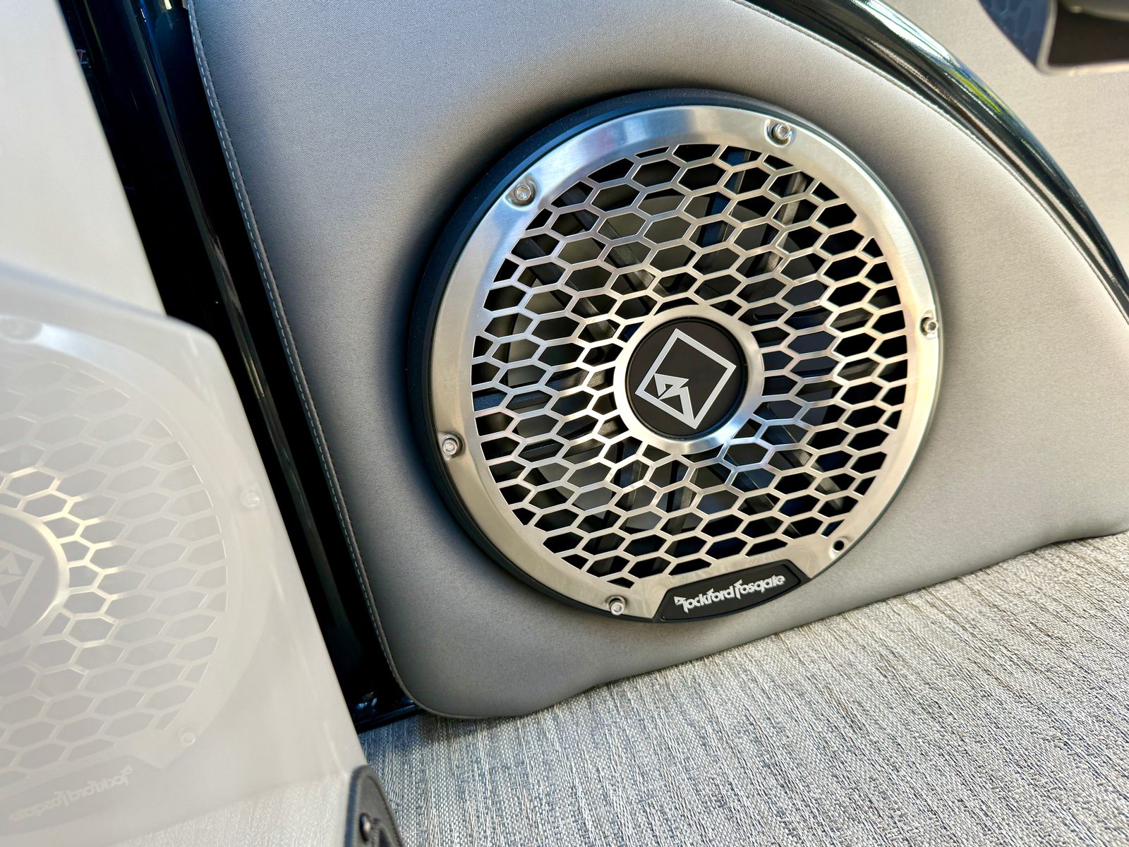 The Bennington 27 QXFBWAX2 ESP is loaded with special features that set it apart from other pontoon boats for sale. The Sunshine Package ensures that every outing is bright and cheerful, while RGB Toe Kick Lighting (R/RX/Q) adds a vibrant, customizable ambiance to the deck. Nine illuminated cupholders keep your favorite beverages within reach and glowing after sunset, enhancing both convenience and style. Exterior side lighting and underwater lighting create a striking visual effect, making your boat stand out during evening cruises or dockside gatherings.Blackout logos give the boat a modern, sophisticated look, while the Rockford Fosgate audio system transforms your pontoon into a floating entertainment hub. Enjoy six 6.5" M2 speakers, two 8" M2 speakers (Fastback), a powerful 10" M2 subwoofer, and a dual PM Punch amplifier upgrade for crystal-clear sound and deep bass. The interior features Graphite Simtex upholstery and accent details in perforated metallic carbon, offering both comfort and contemporary flair.