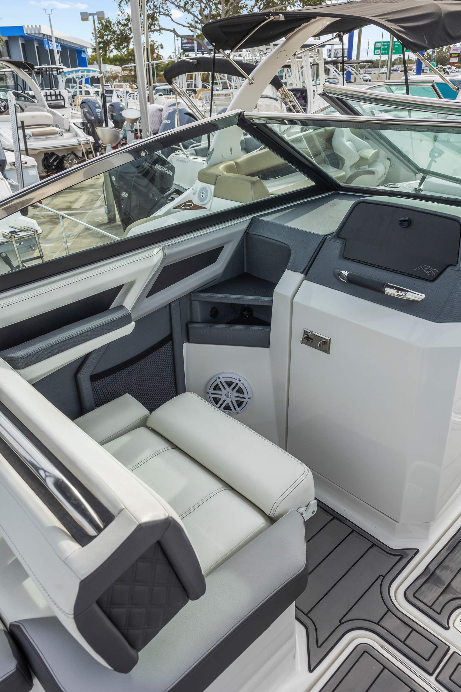 Power and precision are at the heart of the Cobalt R8 OB. Equipped with two robust engines delivering a combined 500 horsepower, this Bowrider boat for sale offers exhilarating acceleration and smooth handling. The twin-engine setup ensures optimal balance and control, making it easy to navigate tight turns or cruise effortlessly at higher speeds. With only 150 engine hours, these engines promise reliability and longevity for years to come. Whether you’re towing water toys, racing across open water, or enjoying a leisurely cruise, the R8 OB’s performance capabilities are sure to satisfy even the most discerning boater.