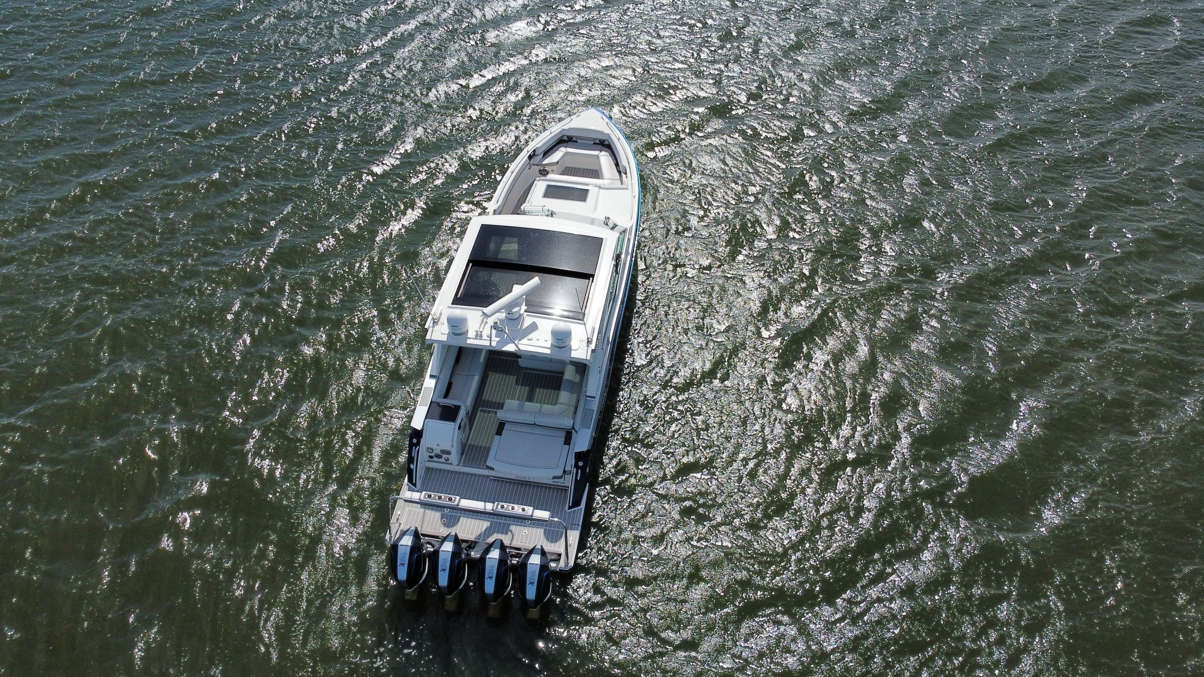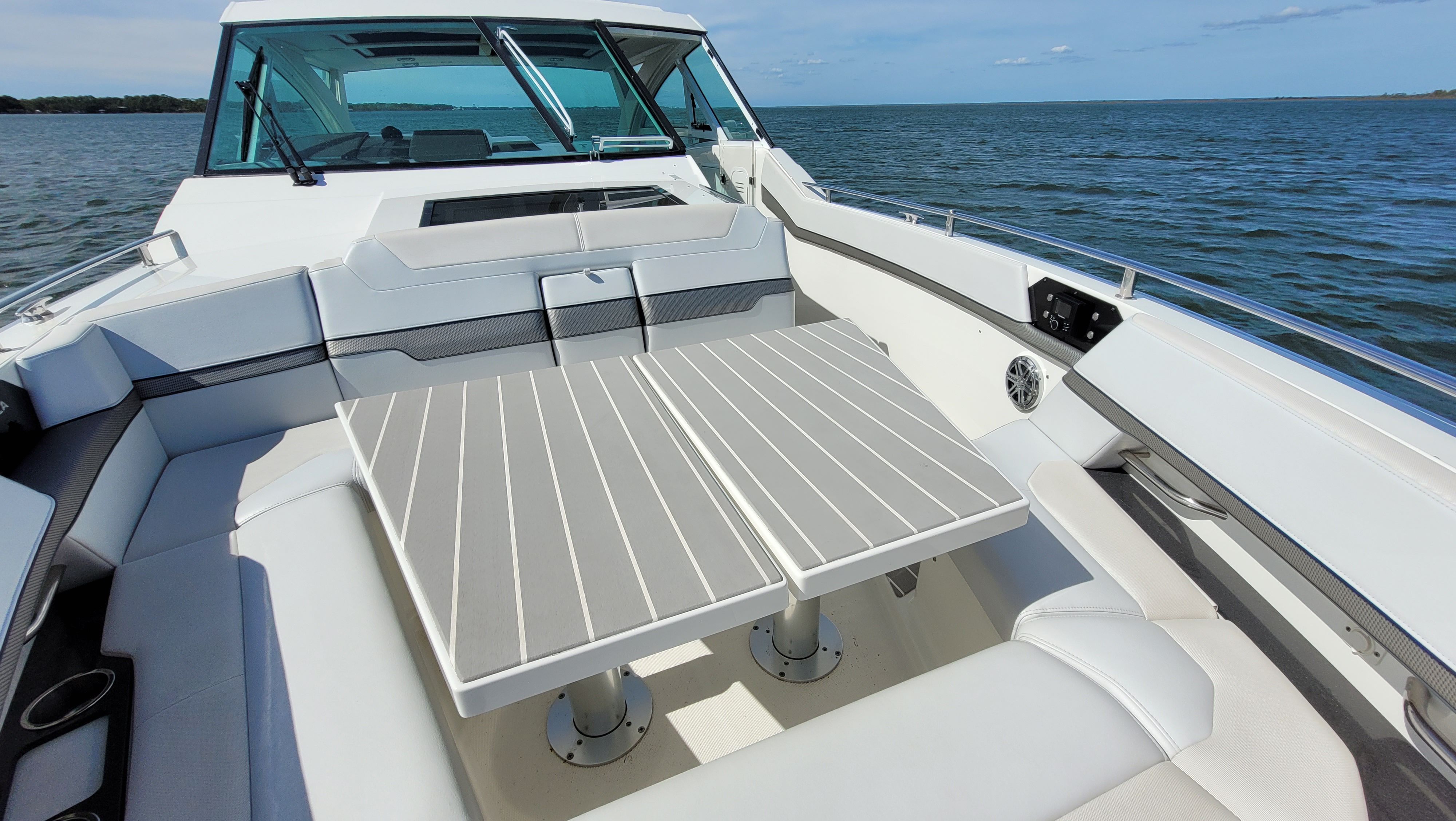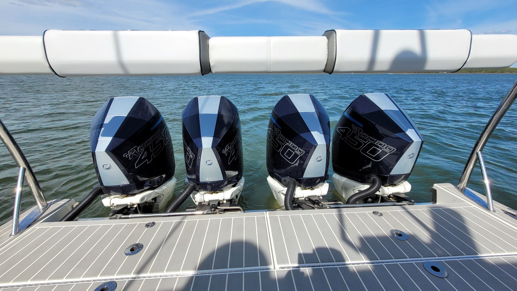 Instant motor response: Upgraded Mercury 450R's instantly respond to your control with Mercury® Joystick Piloting, throttle and electronic shift and a stainless tilt steering wheel.
