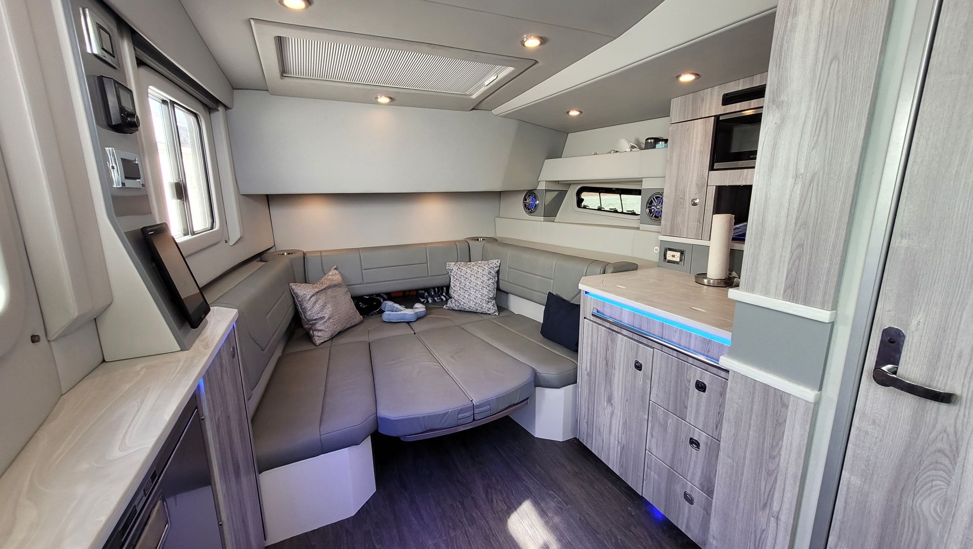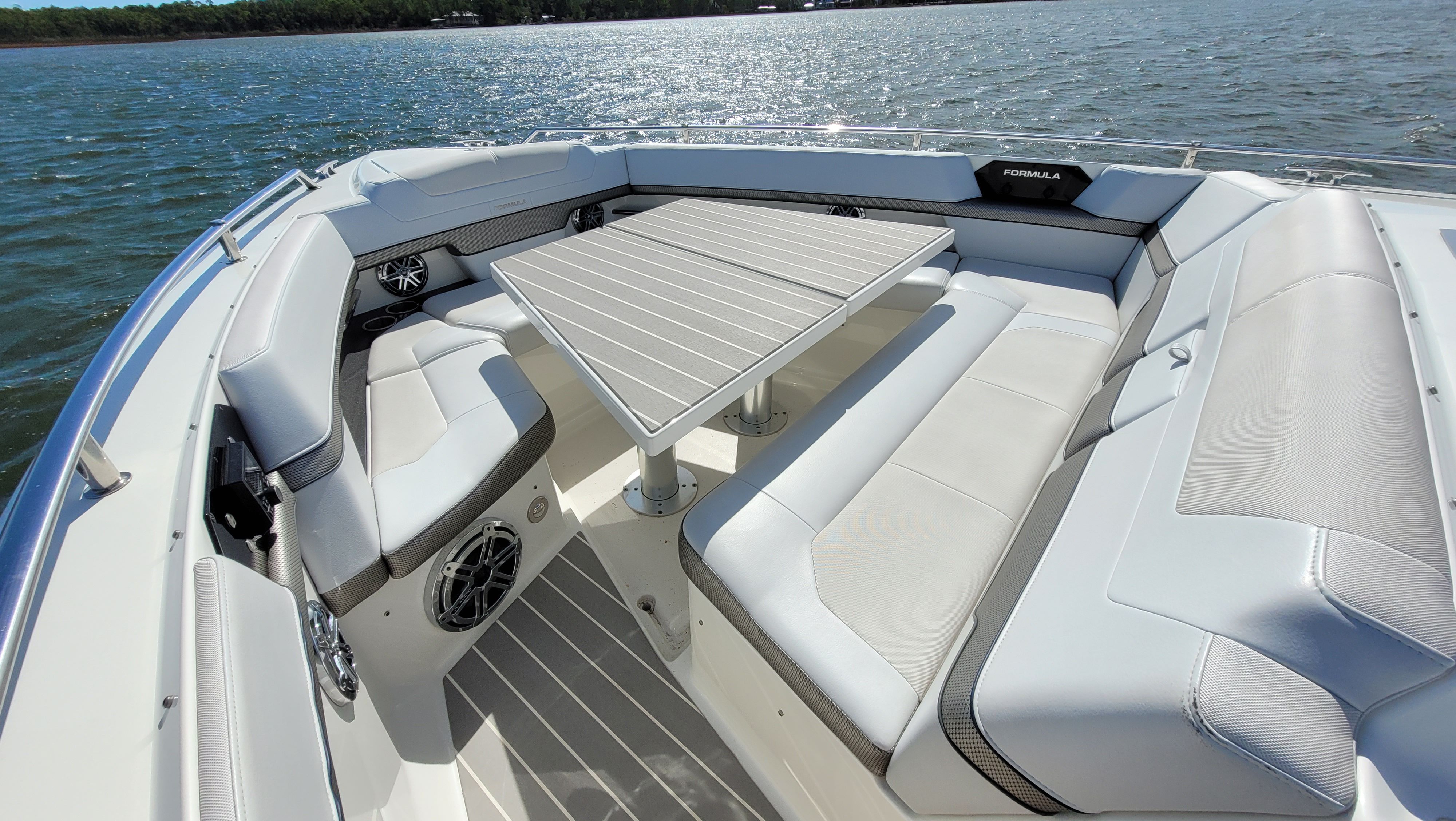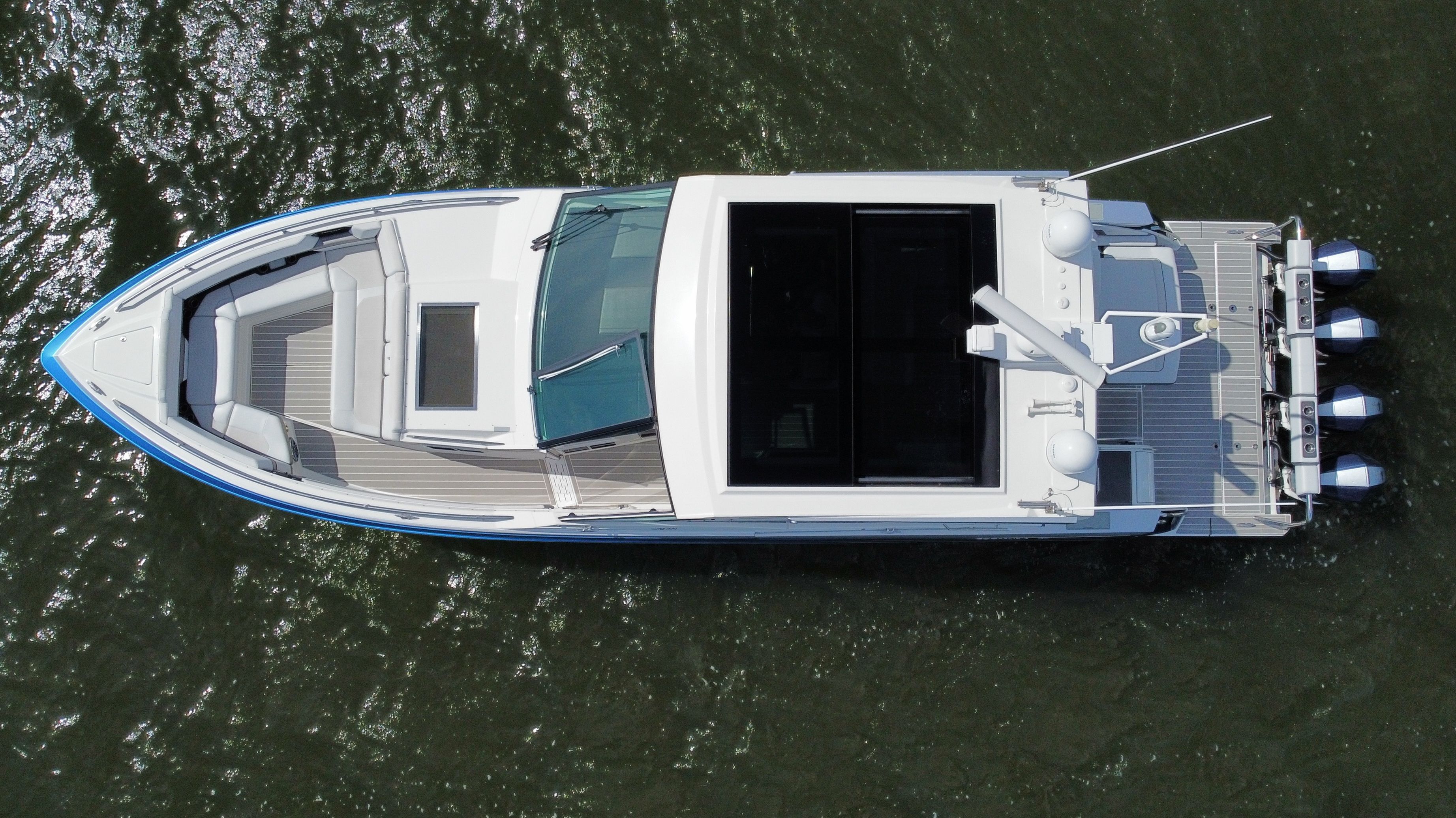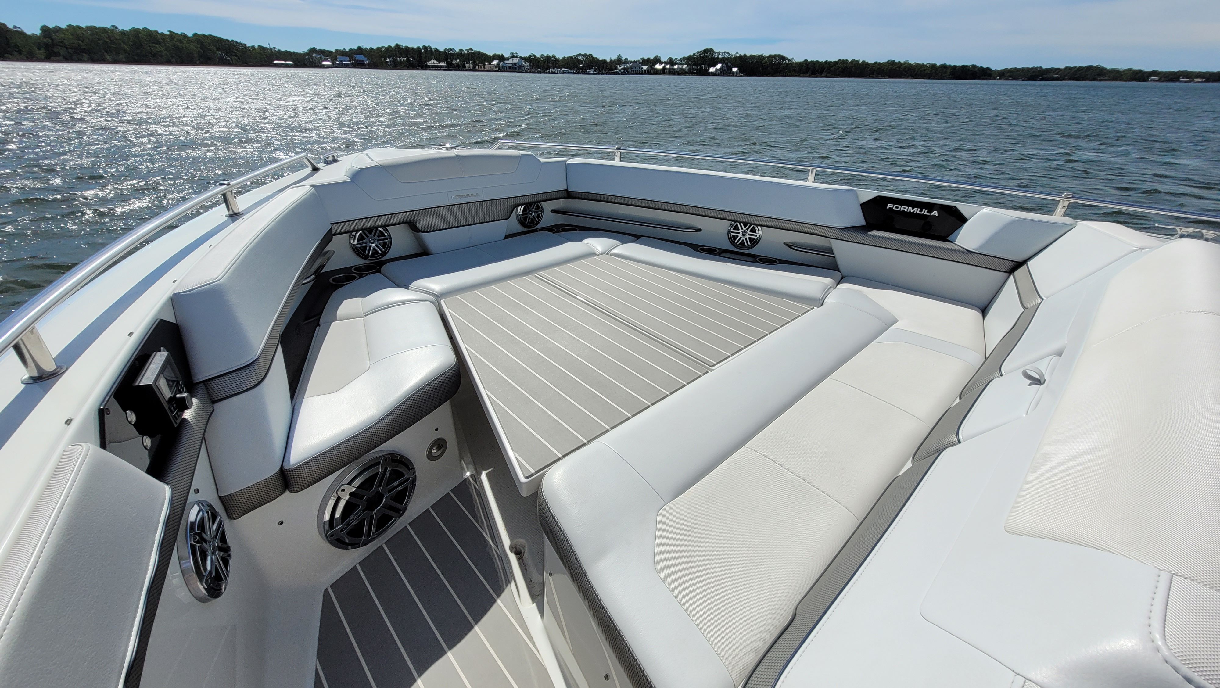 Instant motor response: Upgraded Mercury 450R's instantly respond to your control with Mercury® Joystick Piloting, throttle and electronic shift and a stainless tilt steering wheel.