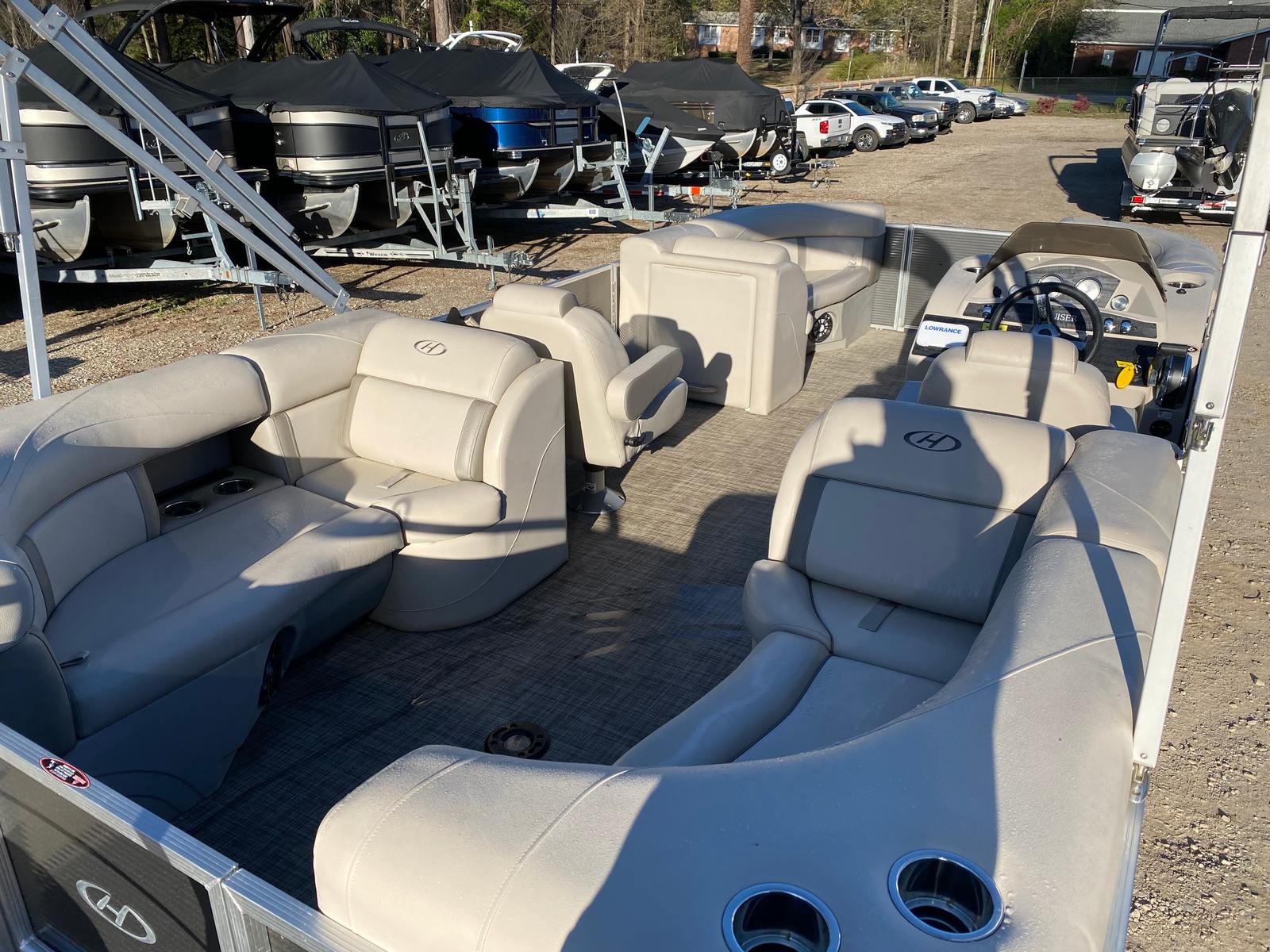 Powered by a single engine with an impressive 150 horsepower and only 167 engine hours, the Harris 210 CX delivers a smooth and responsive ride. This pontoon boat for sale is engineered for both leisurely cruises and spirited adventures, offering plenty of power for towing water toys or reaching your favorite destinations with ease. The efficient engine ensures a balance of performance and fuel economy, making every outing enjoyable and cost-effective. Whether you’re navigating calm lakes or exploring winding rivers, the Harris 210 CX provides the confidence and capability you need for a variety of on-water activities.