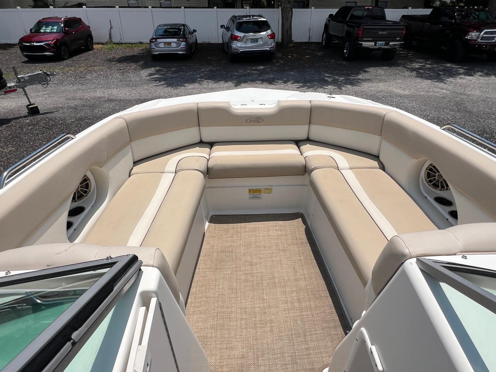 Enjoy plush wraparound bow seating, a portside head compartment with a sink, and a large aft lounge with adjustable backrests. The cockpit is equipped with stainless steel cup holders, ample storage, and a convertible dinette table perfect for socializing. A freshwater transom shower, ski tow bar, and swim platforms with ladders complete the package for all-day fun.