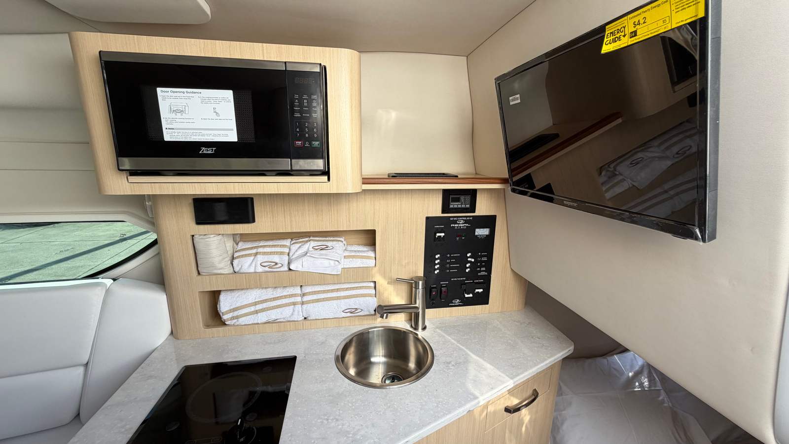 The 2026 Regal 26 XO is equipped with a range of special features that elevate your boating experience to new heights. The aft vent matches the bootstripe color, creating a seamless and stylish exterior appearance. The Mediterranean Blue canvas adds a touch of elegance, while the cockpit cover and full enclosure provide protection from the elements, ensuring comfort in various weather conditions. Step onto the cockpit seagrass mat and enjoy the plush, inviting feel underfoot, enhancing the overall onboard ambiance.Inside, the Snowcap and Coastal interior themes offer a fresh and modern aesthetic, complemented by mosaic countertops that add a touch of sophistication to the galley area. For those who value convenience and comfort, the gas generator (110V) ensures you have reliable power for all your onboard needs, while the air conditioning system keeps the cabin cool and comfortable, even on the hottest summer days.