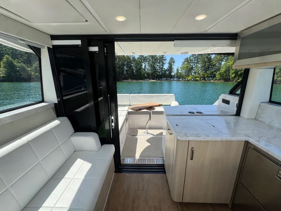 Professionally serviced by Singleton Marine, this 38 Grande Coupe is turn-key and loaded with premium features for both day cruising and extended stays aboard. The enclosed cockpit with Isinglass enclosure and electric sunroof provides year-round comfort, while the interior offers two private staterooms and a separate shower for a true home-away-from-home experience.