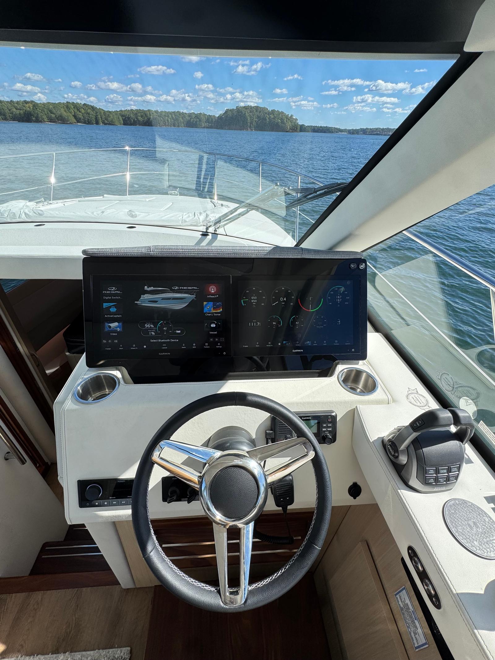 The vinyl-wrapped helm with hand-stitched accents exudes true luxury, while the dual 16” Garmin displays, joystick, and autopilot enhance the boating experience, ensuring ease of control and precision.