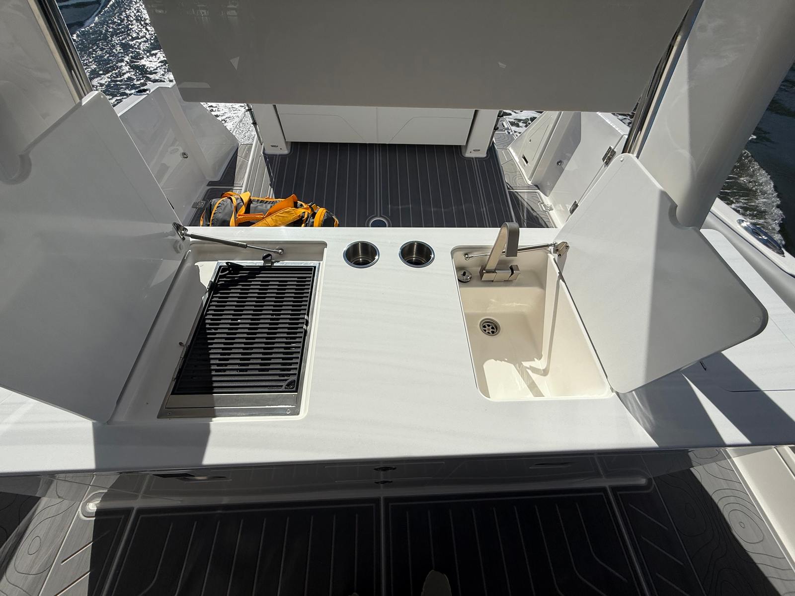 The 2026 Regal 38 SAV is loaded with special features that set it apart from other yacht boats for sale. The triple Mercury 425 Verado engines provide unmatched power and agility, ensuring that you can reach your favorite destinations quickly and comfortably. The hull’s Tahiti Beach White finish, complemented by the Mediterranean Blue bootstripe and hull bottom, creates a striking visual impression that is both elegant and modern. The yacht’s multi-zone color scheme—Zone 1 in Pure White, Zones 2, 3, and 4 in Lunar Gray, and Zones 5 and 6 in Mediterranean Blue—adds depth and sophistication to its overall design. Every detail of this yacht has been carefully considered to enhance both its appearance and its functionality.