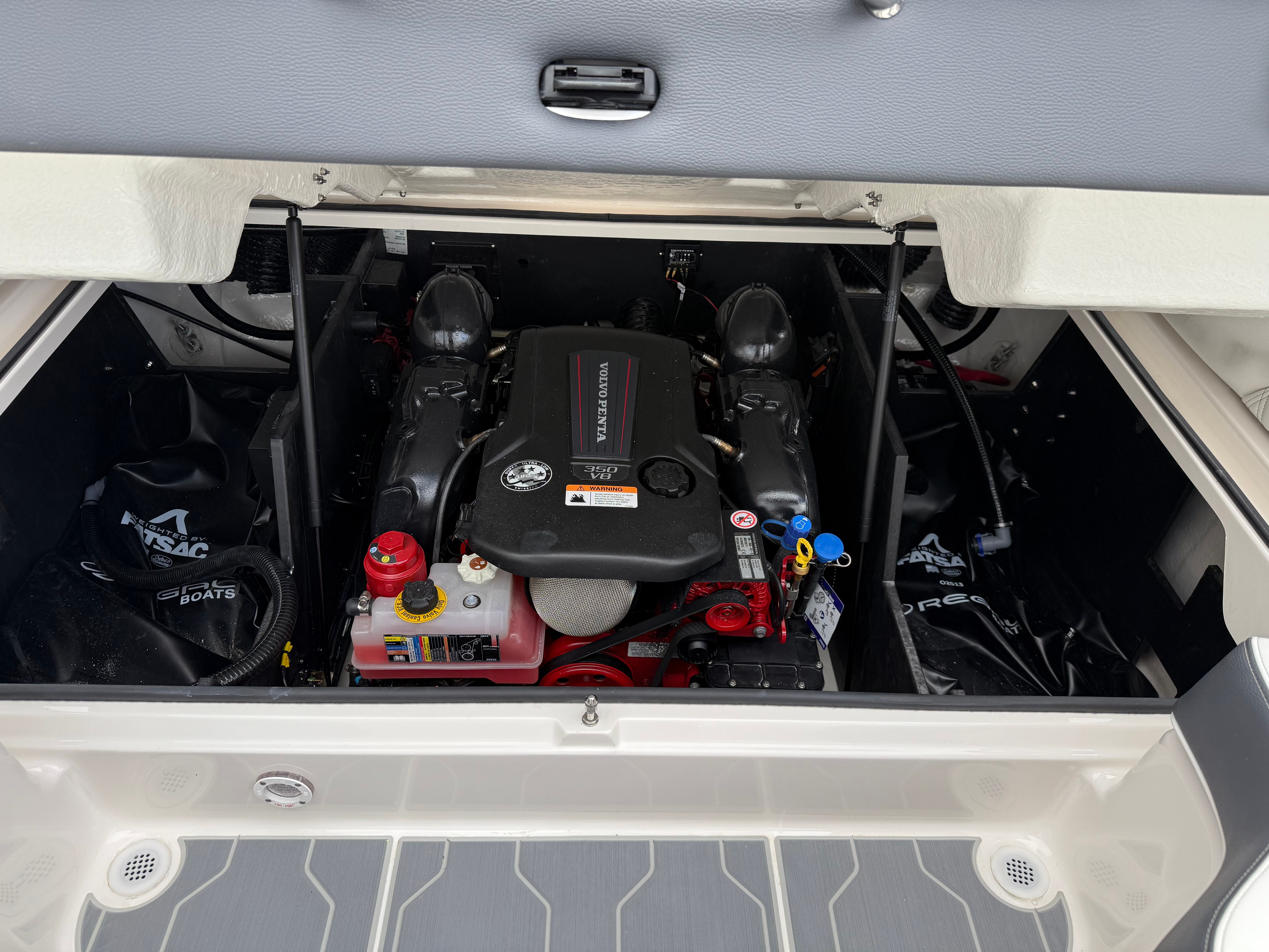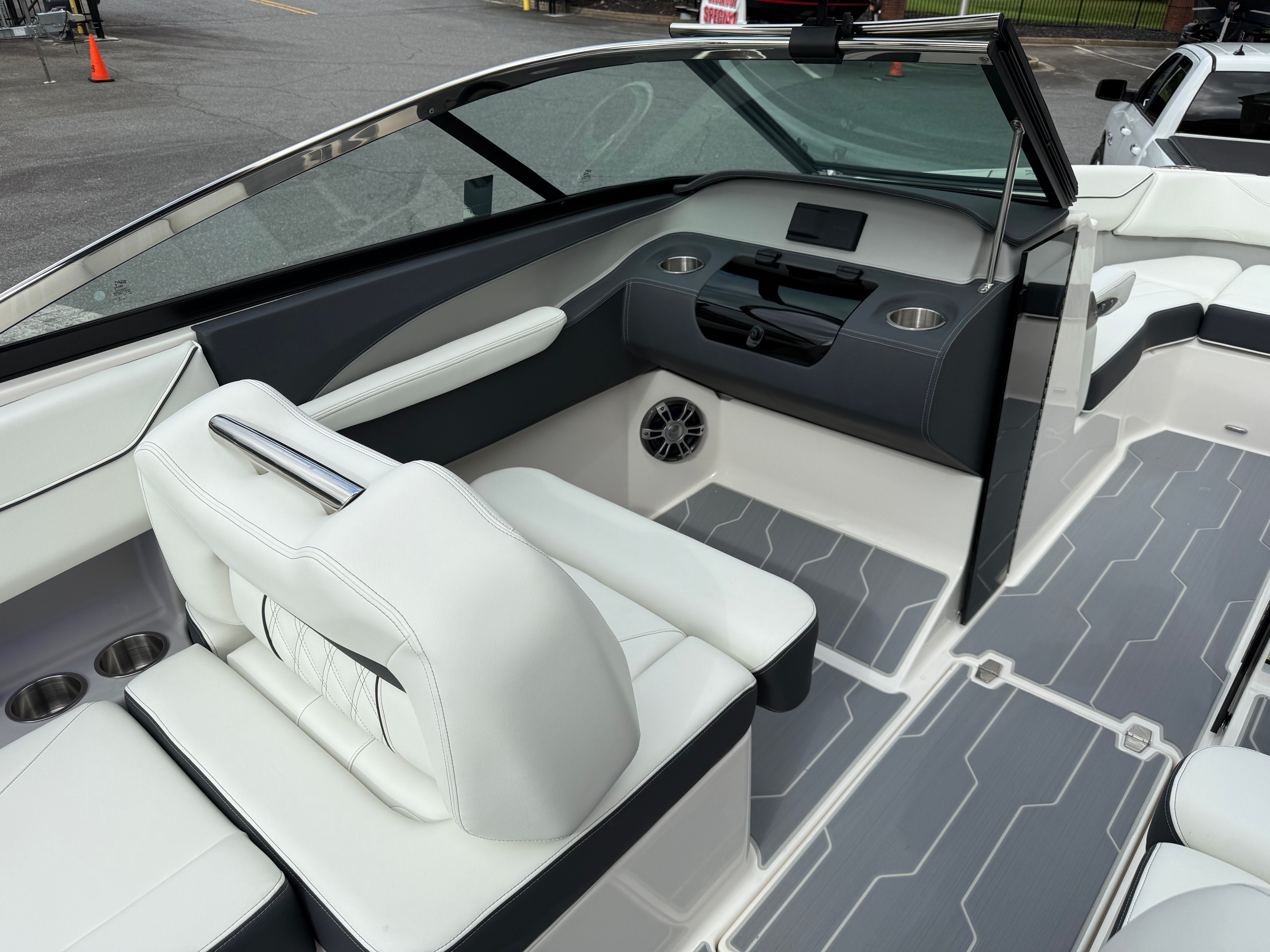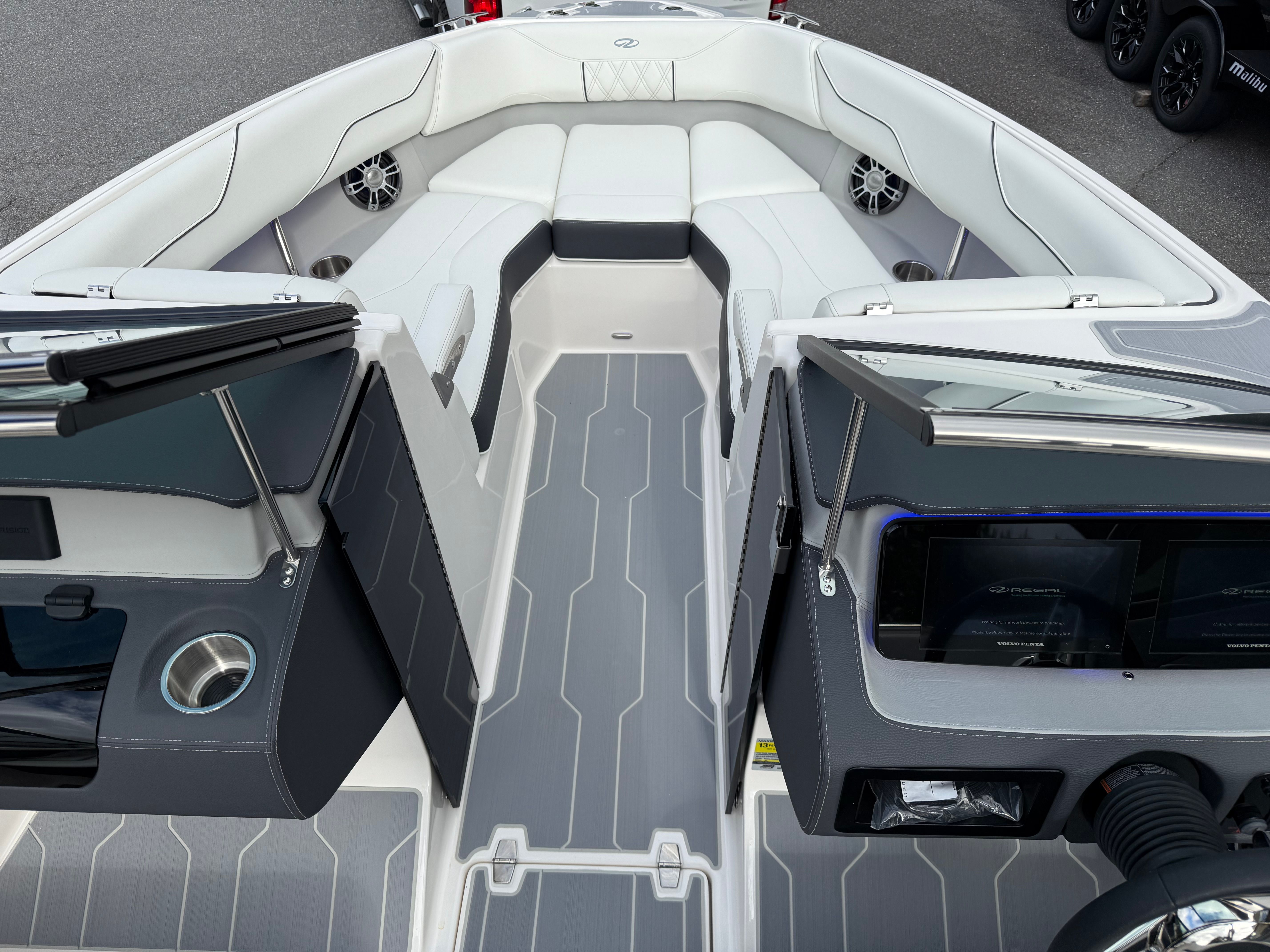 The LS4 Surf is packed with special features that set it apart from other Bowrider boats for sale. The Mediterranean Blue hull color is complemented by a striking Tahiti Beach White bootstripe, creating a sophisticated and eye-catching profile. Fender clips offer convenient docking and protection, while the watersport mirror ensures optimal visibility for drivers and spotters during active sessions. The SeaDek cockpit sole and SeaDek swim platform provide a soft, non-slip surface for added comfort and safety, whether you’re lounging or preparing for watersports.Bow walk-thru doors make moving between the bow and cockpit effortless, enhancing both safety and convenience. The stainless steel flag pole with a U.S. flag adds a touch of patriotic flair and elegance, while the black bottom color completes the boat’s modern aesthetic. Every detail of the LS4 Surf is designed to maximize enjoyment and usability, making it a standout choice for anyone seeking a Regal boat for sale with premium features.