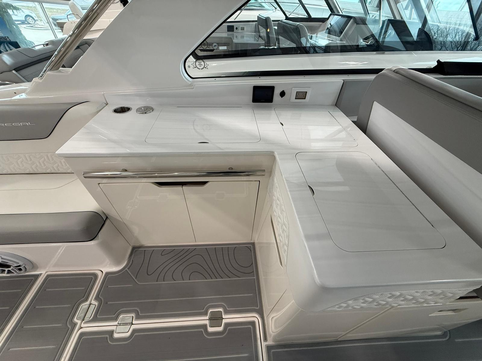 The 2026 Regal LX36 is loaded with premium features that elevate your boating experience to new heights. The Aft Cockpit Canvas - Palm Beach Enclosure provides protection from the elements, allowing you to enjoy your time on the water regardless of the weather. The Anchor Windlass - All Chain system ensures effortless anchoring, while the Bow Thruster offers enhanced maneuverability, making docking and tight turns a breeze. The Bow Cover White Stamoid and Canvas - White add a touch of elegance and durability, perfectly complementing the boat’s Mediterranean Blue bottom and Tahiti Beach White bootstripe.For those who love to entertain, the cockpit is equipped with a refrigerator to keep your refreshments chilled and a beautiful Teak Cockpit Table that invites guests to gather and relax. The Companion Garmin 8616 navigation system provides state-of-the-art technology, ensuring you stay on course and connected wherever your adventures take you.