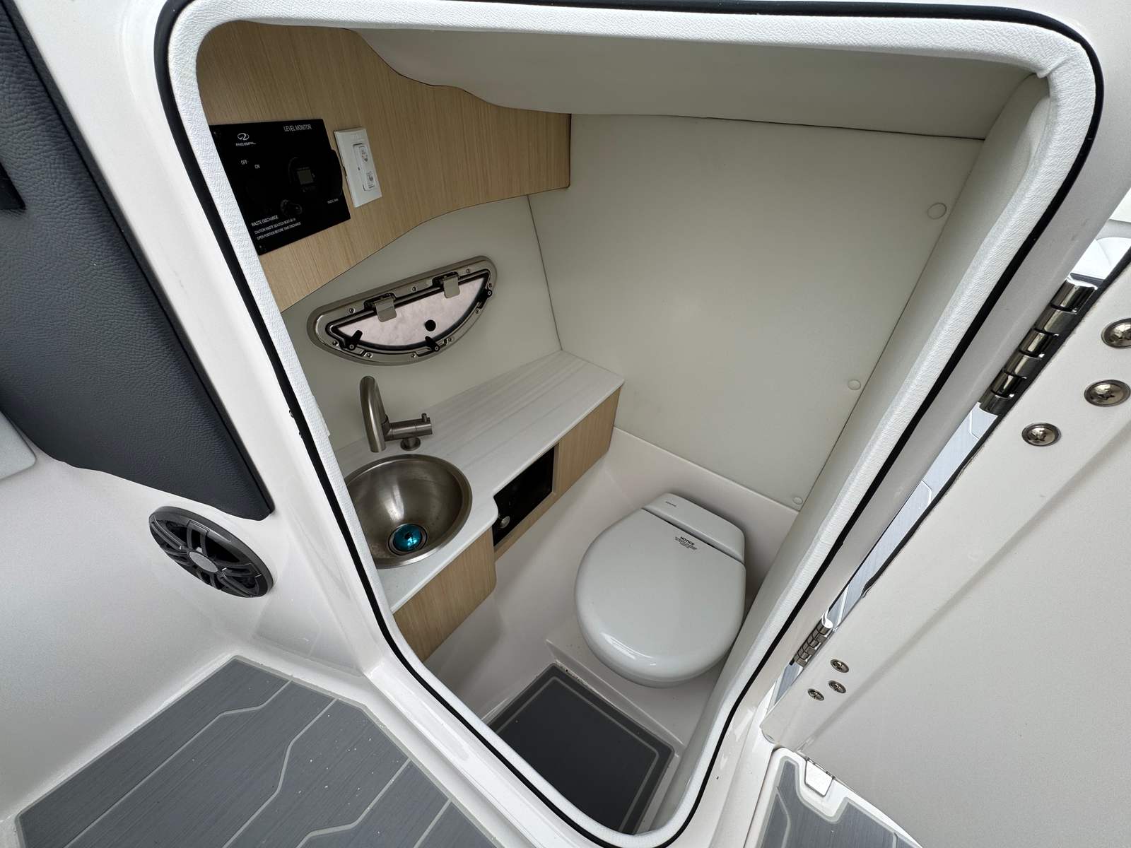 Electric Toilet w/ Pump Out, Head Compartment, and Transom Shower for added convenience