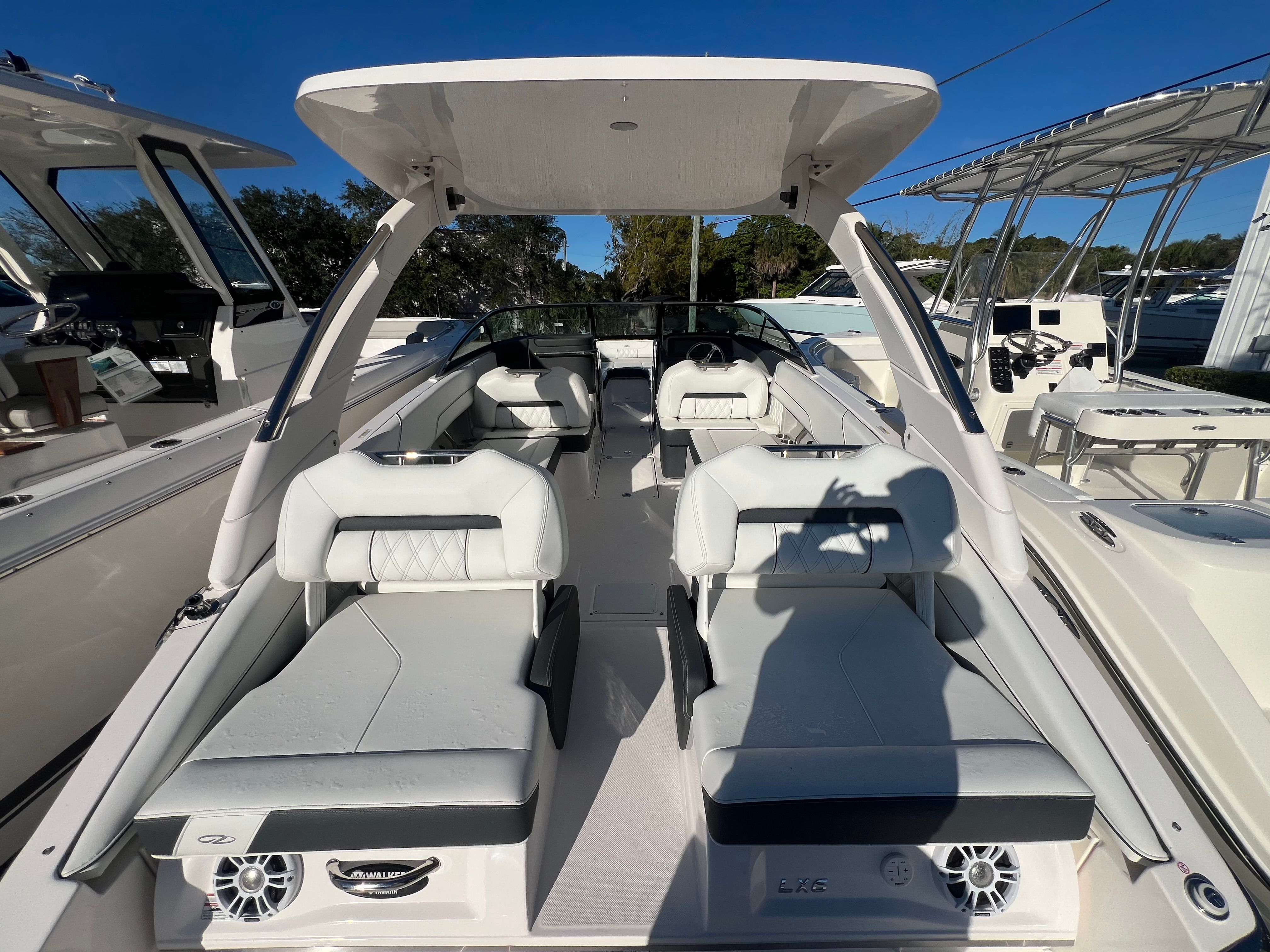 The 2026 Regal LX6 is loaded with features designed to enhance your time on the water. The Yamaha V6 350 HP engine provides reliable and robust power, while the hull’s Newport Blue color, Mediterranean Blue bootstripe, and Tahiti Beach White bottom create a visually stunning profile. The Titanium interior color offers a modern and inviting atmosphere, perfect for relaxing or entertaining.For added convenience and protection, the LX6 comes equipped with bow and cockpit covers, ensuring your boat stays clean and protected from the elements when not in use. The White PowerTower Top Upgrade not only adds a sleek look but also provides shade and shelter, enhancing comfort during sunny days. The Mediterranean Blue canvas complements the overall design, tying together the boat’s sophisticated color scheme.The cockpit seagrass mat offers a soft, comfortable surface underfoot, making every step a pleasure whether you are barefoot or in sandals. The dual battery switch with tray and cables ensures reliable power management, giving you peace of mind during extended outings.