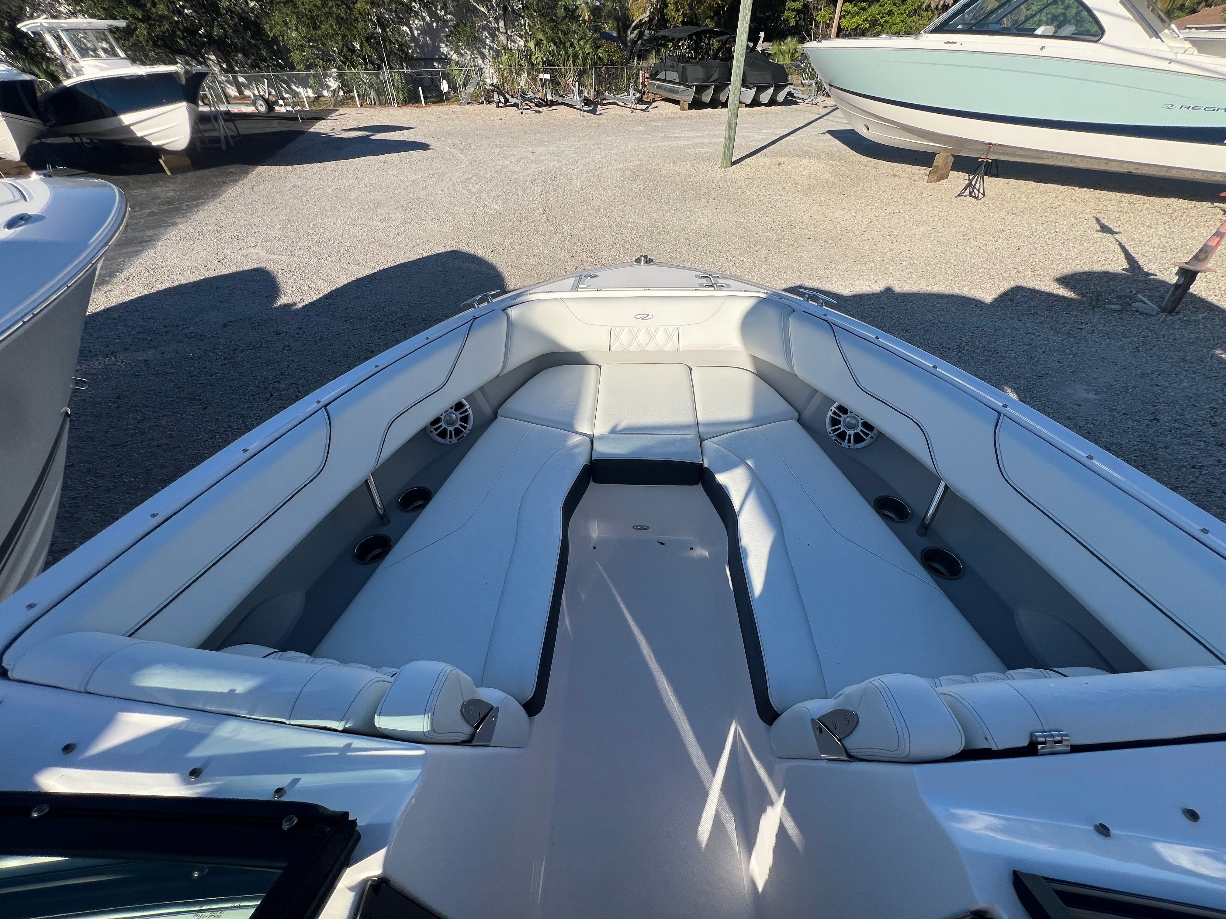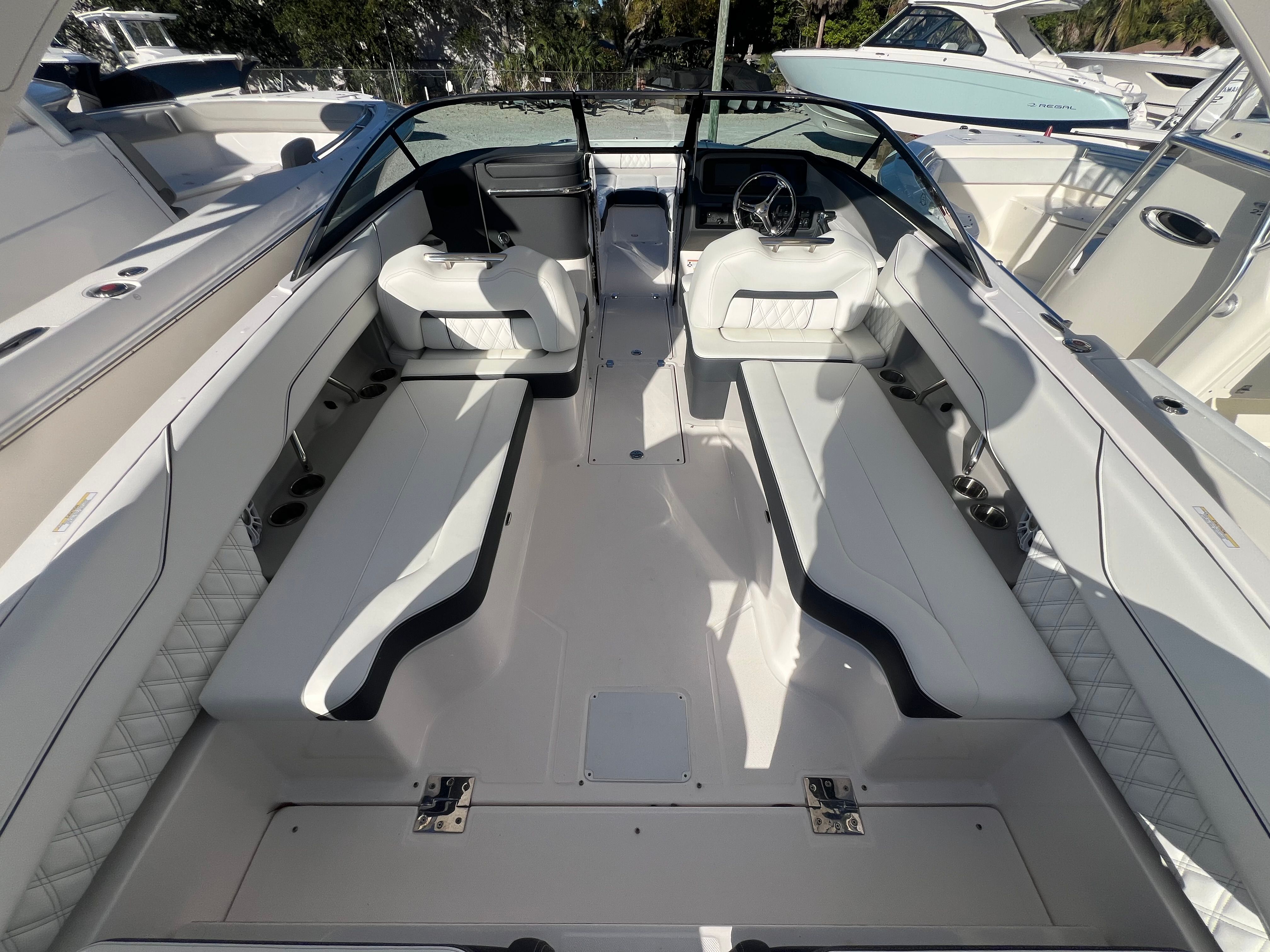 The Regal LX6 is designed with practical boating in mind. Its 26.25-foot length offers ample storage for gear, water toys, and personal items, keeping the deck clutter-free and organized. The dual battery switch system ensures you always have reliable power, making it easy to manage onboard electronics and accessories.Docking and maneuvering are a breeze thanks to the responsive handling provided by the Yamaha V6 engine. The boat’s size strikes a perfect balance between spaciousness and ease of docking, making it suitable for both seasoned boaters and those new to the water. The cockpit seagrass mat not only adds comfort but also makes cleaning up after a day of fun quick and simple.Fuel efficiency is another advantage of the LX6’s modern engine technology, allowing you to spend more time on the water and less time at the fuel dock. The protective covers help maintain the boat’s pristine condition, reducing maintenance and ensuring your investment stays looking its best for years to come.