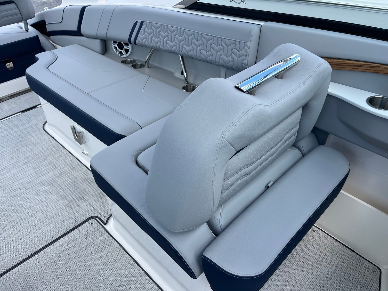 The Regal LX9 Ultimate is designed to turn heads and elevate your time on the water. Its Mediterranean Blue hull, accented by a Steel Gray bootstripe and Tahiti Beach White bottom, creates a striking visual statement that stands out in any marina. The interior features a sophisticated color palette, with Lunar Gray and Mediterranean Blue zones that provide a cool, inviting atmosphere for you and your guests. Each seating zone is crafted for comfort, ensuring everyone on board enjoys the ride as much as the destination.Special features of the LX9 Ultimate include the powerful twin Yamaha F200XSA2 engines, a hull color in Mediterranean Blue, a Steel Gray bootstripe, a bottom color in Tahiti Beach White, and a multi-zone interior with Lunar Gray and Mediterranean Blue accents. Every detail is meticulously chosen to enhance both aesthetics and functionality, making this bowrider as beautiful as it is practical.