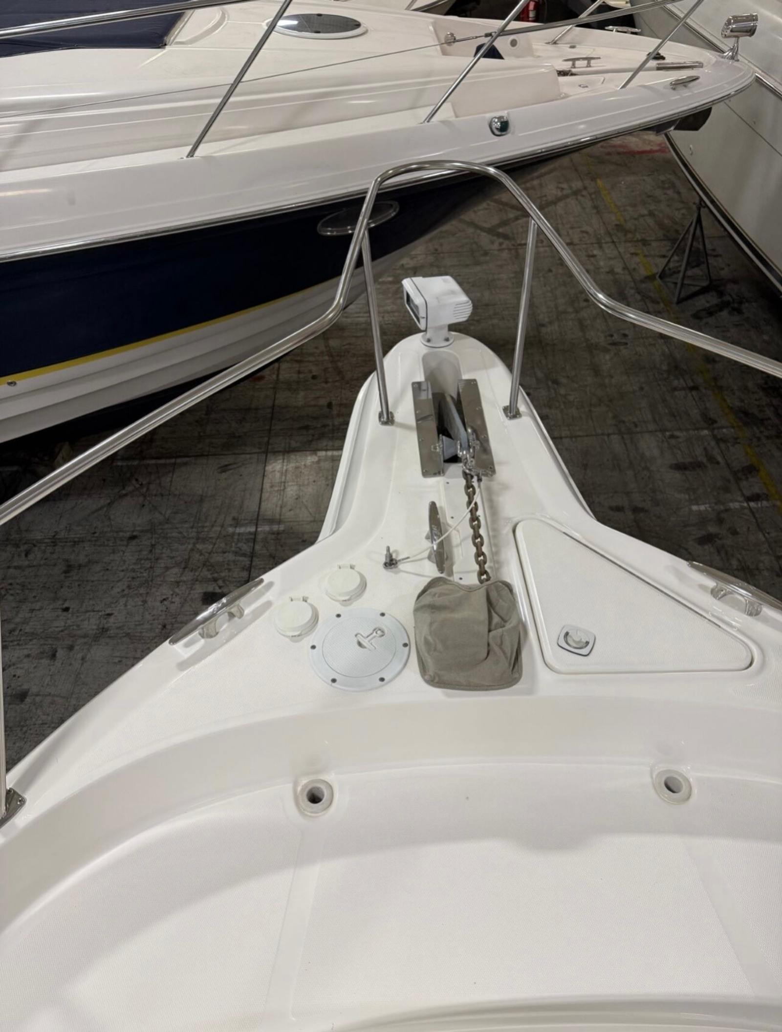 The 460 Sundancer is as practical as it is stylish. The five-battery system and battery charger provide peace of mind, ensuring your boat is always ready for action. The electric engine hatch streamlines maintenance, while the cockpit coaming bolsters and carpet enhance safety and comfort. The extended swim platform makes water sports, swimming, and boarding the boat a breeze, adding to the overall convenience and enjoyment of ownership.Docking and maneuvering are made easier by the boat’s responsive handling and well-designed layout. The hard top offers protection from sun and rain, allowing you to make the most of your time on the water, regardless of the conditions. Whether you are planning a day trip or a weekend getaway, this bowrider boat for sale is equipped to handle all your boating needs.