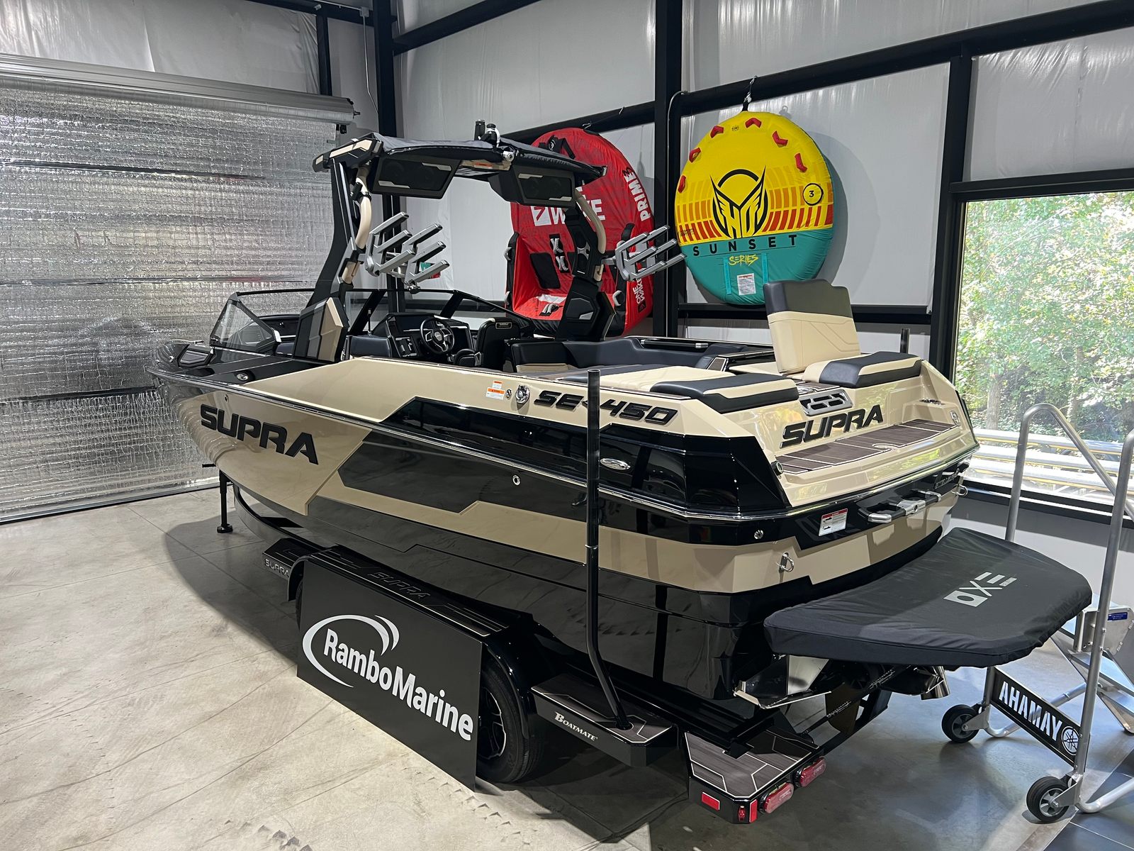 The Supra SE 450 is loaded with features designed to enhance your time on the water. Its spacious 24.5-foot layout provides plenty of room for friends, family, and all your water sports equipment. The boat’s sleek profile and modern styling are complemented by high-quality materials and attention to detail throughout the interior and exterior. Special features include a state-of-the-art wake system that allows you to customize the size and shape of your wakes, ensuring optimal conditions for every rider. The intuitive controls and ergonomic seating make operation effortless, while the advanced audio system lets you enjoy your favorite tunes as you cruise or ride.
